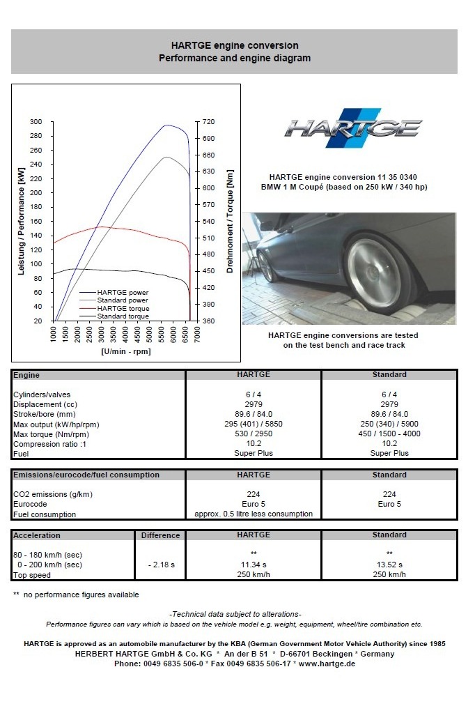 A Hartge teljesítménynövelő csomagjával az alapmodell 340 lóerős teljesítményét 396-ra emelik, nyomatéka pedig 450-ről 530 Nm-re nő, amivel a kompakt méregzsák 11,34 másodperc alatt éri el a 200 km/h-s tempót: ez több mint két másodperccel kevesebb, mint a gyári modell esetében. Nem igazán értjük, hogyan, de a Hartge állítja, hogy a jelentős emelkedés ellenére az autó fogyasztása 100 km-enként fél liter benzinnel csökken, azaz a vegyes érték 9,6 helyett mindössze 9,1 l/100 km a 3,0 literes Twin Power turbómotorral.