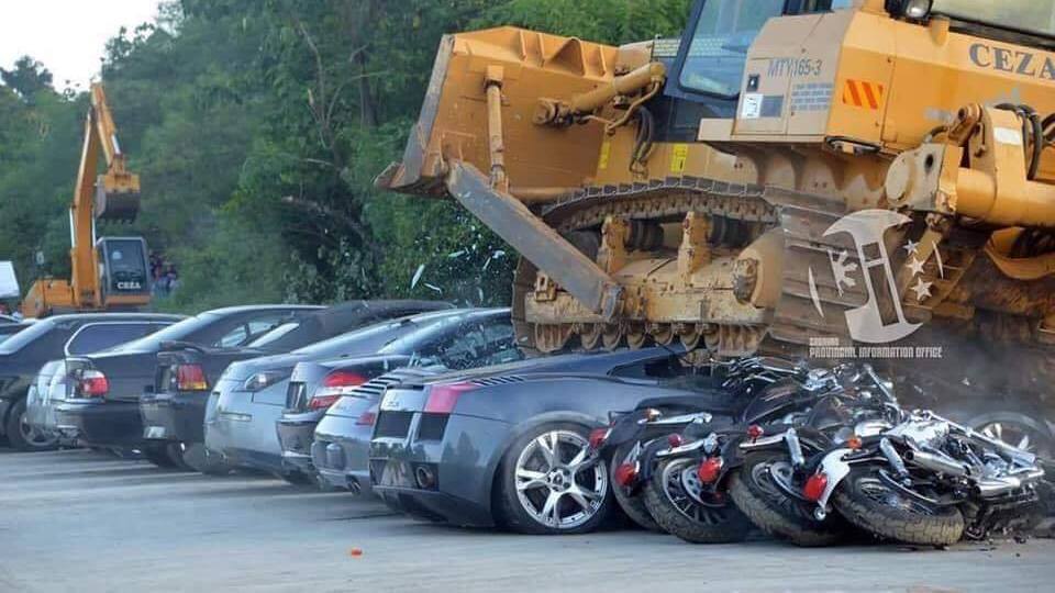 Rodrigo Duerte miniszterelnök nem tolerálja az illegális autóimportot, az országban egyébként is nehéz autót forgalomba helyeztetni, így illegális úton eddig rengeteg jármű érkezett. A vámon fennakadt kocsikat eddig tárolták, most viszont egy elég erős kampány részeként használják fel őket arra, hogy nyomatékosítsák az állam álláspontját. A legújabb kupacban több Porsche 911 Turbo, Lamborghini, erősebb Mercedesek kaptak helyet, a sort pedig úgy állították fel, hogy a legértékesebbek legyenek a kamerákhoz legközelebb. A sorban feltűnik egy Mustang a '90-es évekből, egy BMW M5 az E39 szériából és egy Nissan 350Z is. Az autókat porig rombolták egy buldózerrel, vélhetően nem ez volt az utolsó eset és még több száz autót tárolhatnak, amik hasonló sorsra jutnak majd.