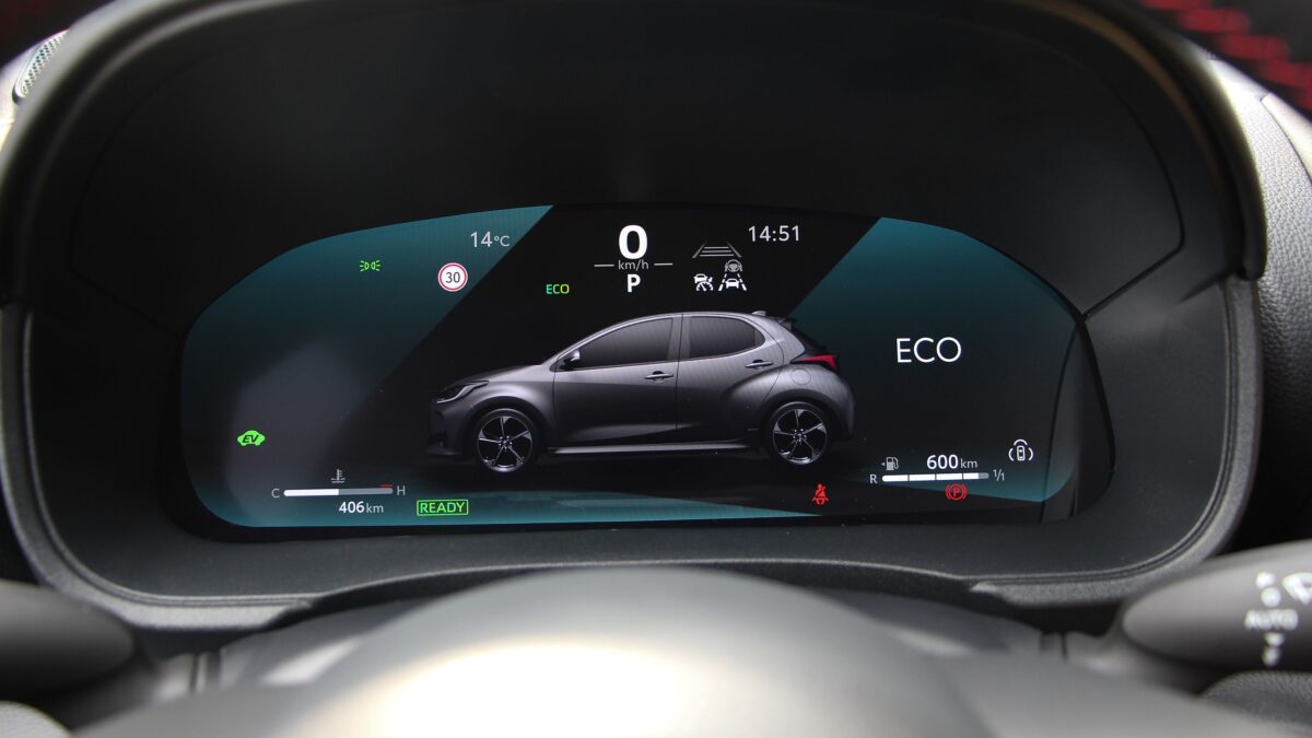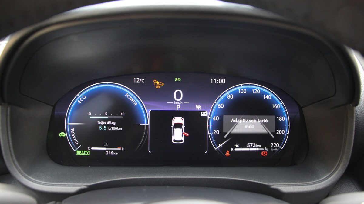 Ennyit az utastérről, térjünk át az izmosított hajtásláncra. Ez most már az ötödikgenerációs hibrid komponenseivel gazdagodott, háromhengeres benzinmotor. Az 1,5 literes full hibrid rendszer 130 lóerővel és 185 Nm forgatónyomatékkal szolgál, így a 0-100-as sprint fél másodperccel javult 9,2 másodpercre, míg a 80-120 km/h gyorsulást 7,5 másodperc alatt tudja. Habár ezekkel a számokkal dobálózni lehet, hogy kissé semmitmondó, a valóságban ez azt jelenti, hogy rugalmasabb az erősebb motorral a Yaris. Hegynek fel, előzéskor, autópályákra felhajtáskor jön jól ez az erő, de leginkább a nagyobb nyomaték. Az eCVT sebességváltó is szépen teszi a dolgát, igaz, nem tűnt annyira kifinomultnak,