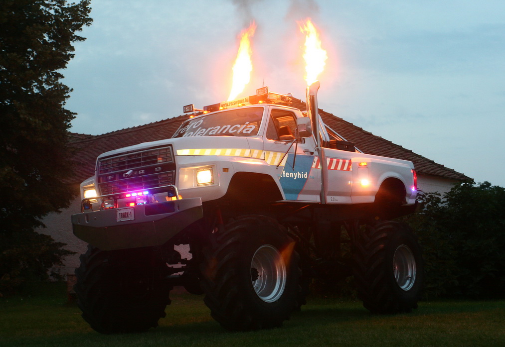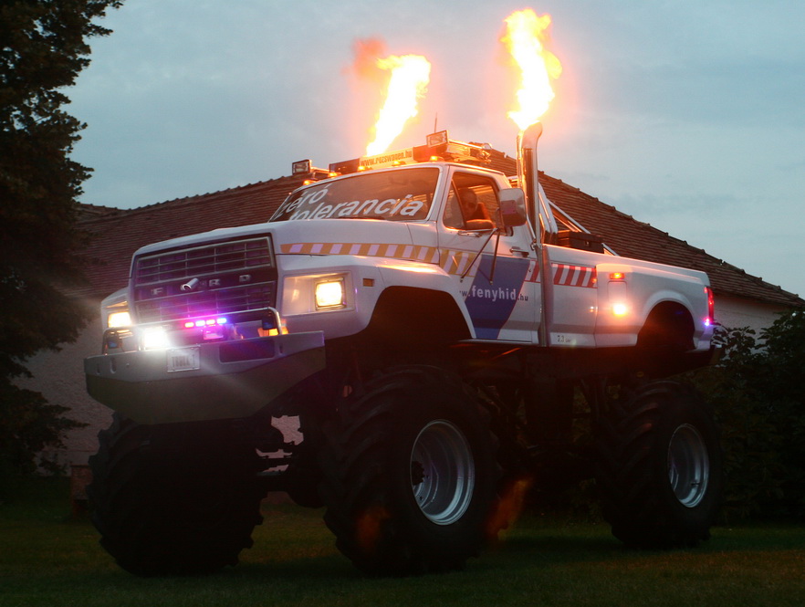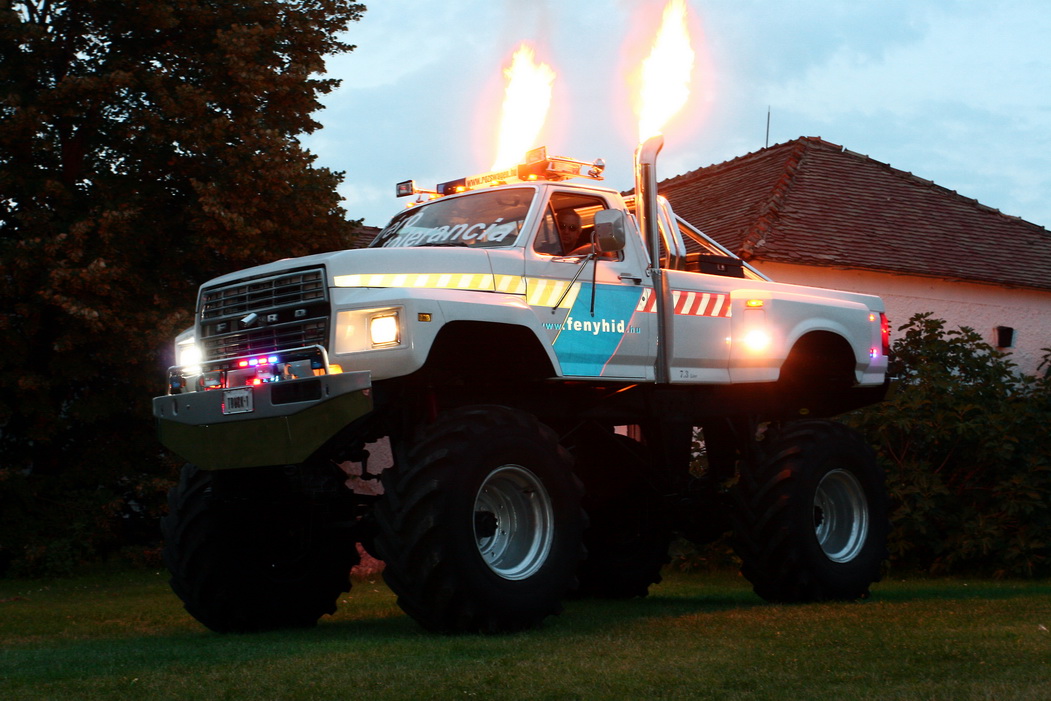 Amikor az elkészülte után először beleültem, nem kicsit lepődtem meg, ugyanis nagyjából a monstrum előtti három métert nem látni, hiszen a monstertruck 2,7 méter széles, 3,4 méter magas, 5,6 méter hosszú és a már fent említett öt tonnát nyomja. Ez a fiúknak is problémát okozhatott, mert az első fejlesztések közt volt a biztonságos közlekedés segítő előre és hátra is látó kamerarendszer felszerelése. A kényelmes kagylóülések és a négy pontos biztonsági öv is később került bele, ugyan az autó nem taposásra, ugratásra, röpködésre készült. Azért ezt is tudja, és olykor csinálja is különféle rendezvények alkalmával. Ilyenkor bizony jól jön a támaszték és a „fogás”! A kétségkívül legjobb módosítás azonban most körülbelül egy-két éves lehet. Ez a rozsdamentes kipufogókon kiáramló valódi láng, amely egy gyerekzárral ellátott kapcsoló segítségével nyolcvan-száz centiméter magasan tör ki, akár több percen keresztül. "The show must go on!" - a jövőbeli tervekről azonban sajnos még nem mesélhetek.