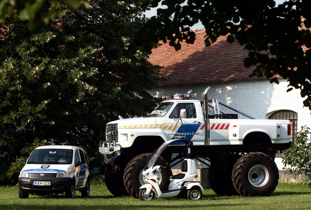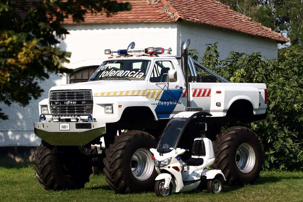 Több újszerű fődarabból született meg az öttonnás „Big Foot”, amely építésének munkafázisait lökhárítótól lökhárítóig dokumentáltuk. Gyerekcipőben jár még most is ez a terület hazánkban, hát még pár évvel ezelőtt, amikor kérdezni sem volt nagyon kitől! Így fogtuk az irányadó információkat, amelyek inkább tényleg csak irányadóként szolgáltak. Rengeteg alkatrészt meg kellett terveztetni vagy csak kitalálni, hogy vajon milyen autóban van valami olyan, amelyre épp szükségünk van. A kerekeit például egy T150-es mezőgazdasági jármű kölcsönözte, de honvédségi teherautók alkatrészeit is előszeretettel használtuk. Ha össze kéne foglalni, meg kéne határozni, mégis milyen márkájú az autó, azt mondanám, Ford. A vezető fülke egy 1986-os Ford F600-asból, a plató ugyanabból az évből egy F350-esből származik, a motor pedig ugyanennek az autónak a 7,3-as turbódízele, ötsebességes manuális váltóval.