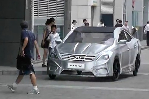 Ha valahol, akkor Kínában nem lehet feltűnősködni egy autó másolatával. Vagy mégis? A Hyundai Azera számunkra nem különösebben ismert jelenség, Amerikában viszont annál inkább: ez a Sonata és a Genesis közé belőtt, Dél-Koreában Grandeur néven futó limuzin, amelynek legújabb generációját érdekes ötlettel kezdték népszerűsíteni. A Hyundai China felkért néhány képzőművészt, hogy fillérekből tákoljanak össze egy Azerát (pontosabban egy rá erősen hasonlító négykerekű szobrot), és menjenek ki vele az utcára, hogy az eredetire hasonlító alkotással keltsék fel az emberek figyelmét.