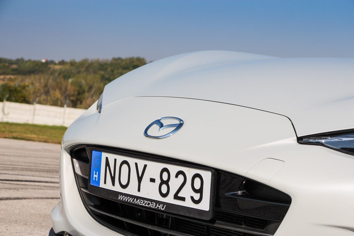 Minek a nagy hifi? Nem túlzottan érdekelt a multimédiás rendszer ilyen vezetési élmény és hangok mellett. Az utolsó napokban kapcsoltam csak be, meg babráltam a rádiót. Pontos, könnyen használható, ahogyan a Mazdánál ezt megszoktuk, a kijelzőt viszont szívesen elpakoltam volna. Kilátni amúgy inkább vicces, mint zavaró, mivel pontosan tudjuk, hol van az autó orra, nem hoz zavarba, hogy a motorháztető és a középső tükör között például néhány centis résen látunk csak előre, de jól van ez így, a két domborulat az orrán is csak mosolyra fakaszt. Nem is kéne a középső tükör, a két oldalsóban látni, mi történik a kocsi mögött, mert a fara nagyon szűkre húzott.