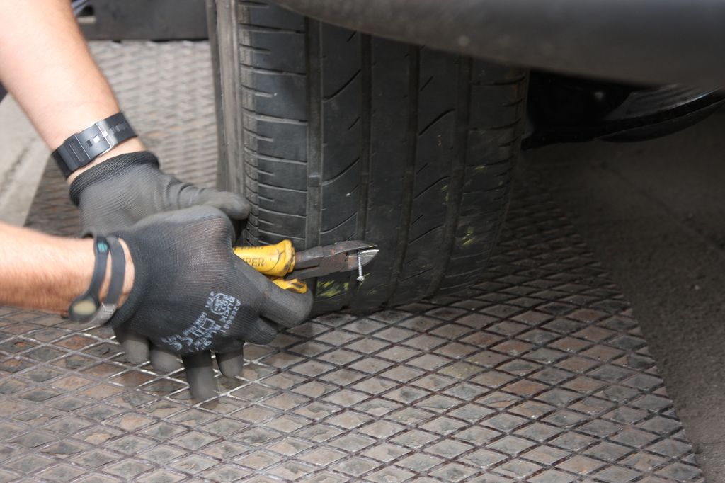 Miután a tesztabroncsok felkerültek a felnikre, utóbbiak pedig az autóra, azokba kalapáccsal beütöttük a szögeket, ráengedtük az autót, és mivel mindegyik defektjavító használati utasítása azt írja, hogy első lépésként, ha tudjuk, távolítsuk el a sérülést okozó tárgyat, majd pedig eresszük ki a maradék levegőt az abroncsból, így tettünk.