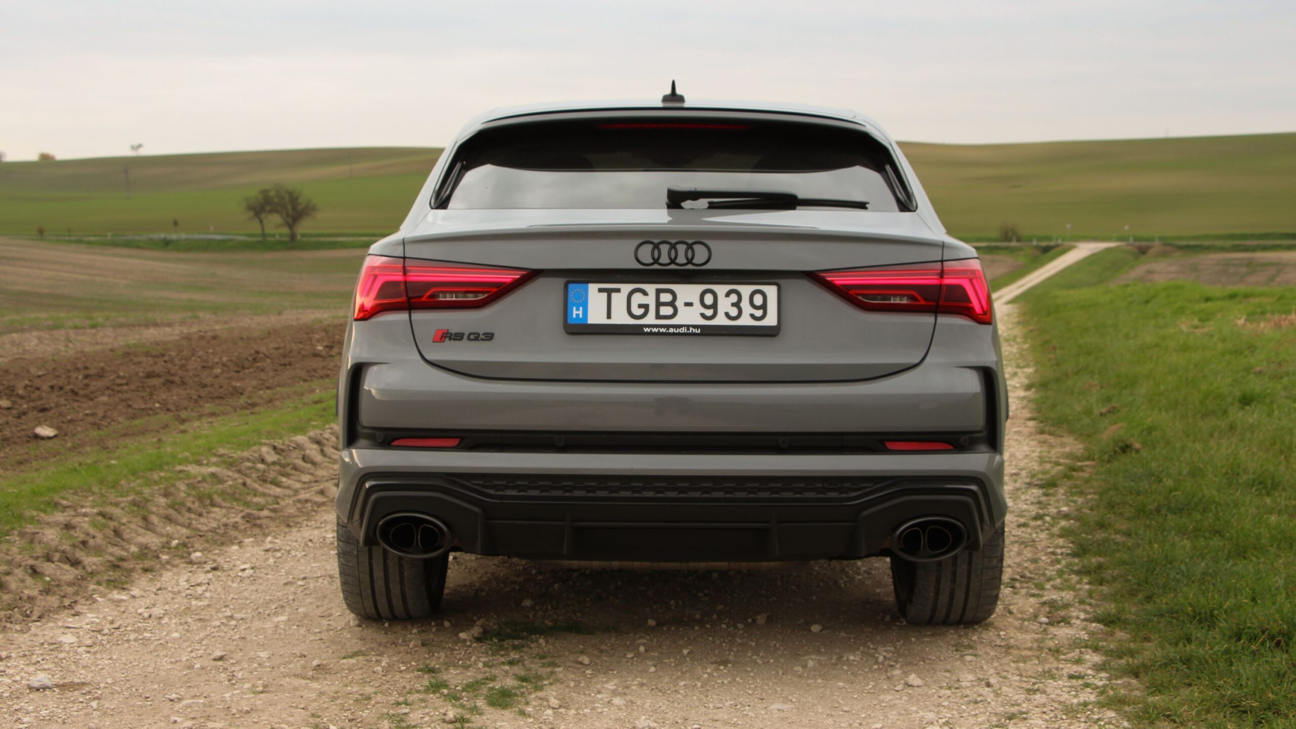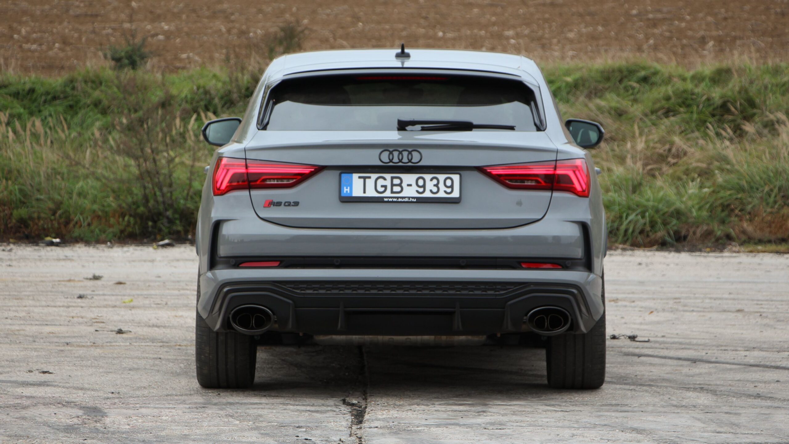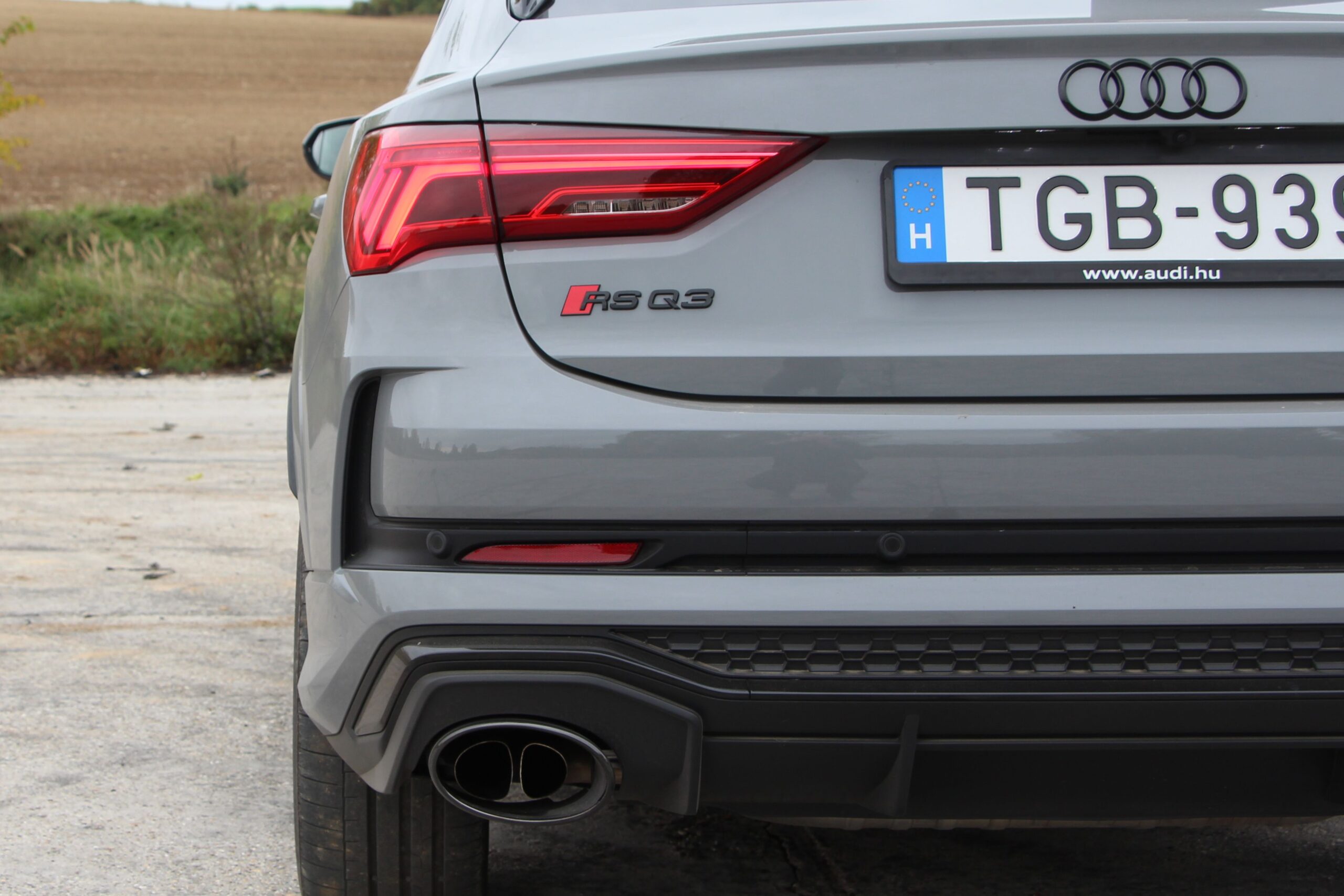 A RS modellen ráadásul tíz milliméterrel vaskosabbak a kerékjáratok, amik alatt a 21 colos felniken felszülnek a gumiabroncsok. A felnik mögött meg persze vörös féknyergek hirdetik az eRőSséget. Érdekes még, hogy a Sportback változaton a hátsó sárvédő-domborítás is hangsúlyosabbnak látszik, pedig az ott van a sima Q3-ason is. Utoljára hagytam az autó elejét és hátulját, hiszen a Sportback lényege ugye oldalról látszik igazán. Hát elöl a fényes fekete betétek jelzik a sportmodell különlegességét, fekete az embléma is, és nem marad le az RS felirat sem. Hátul ugyanez a helyzet, csak itt a diffúzorpanel a fényes fekete, illetve az ovális kipufogóvégek és a légterelőben végződő tető fűszerezik meg az összképet.