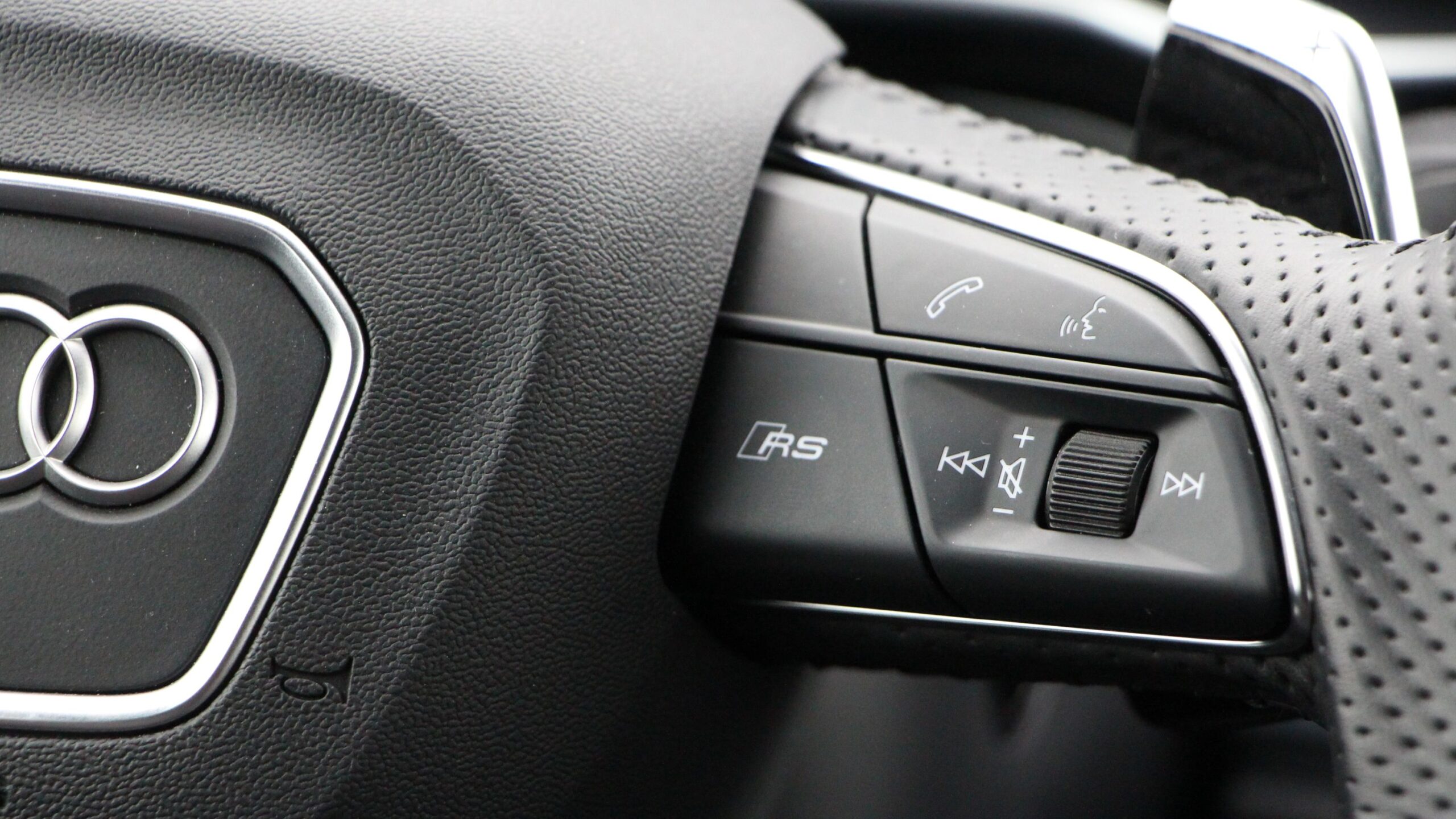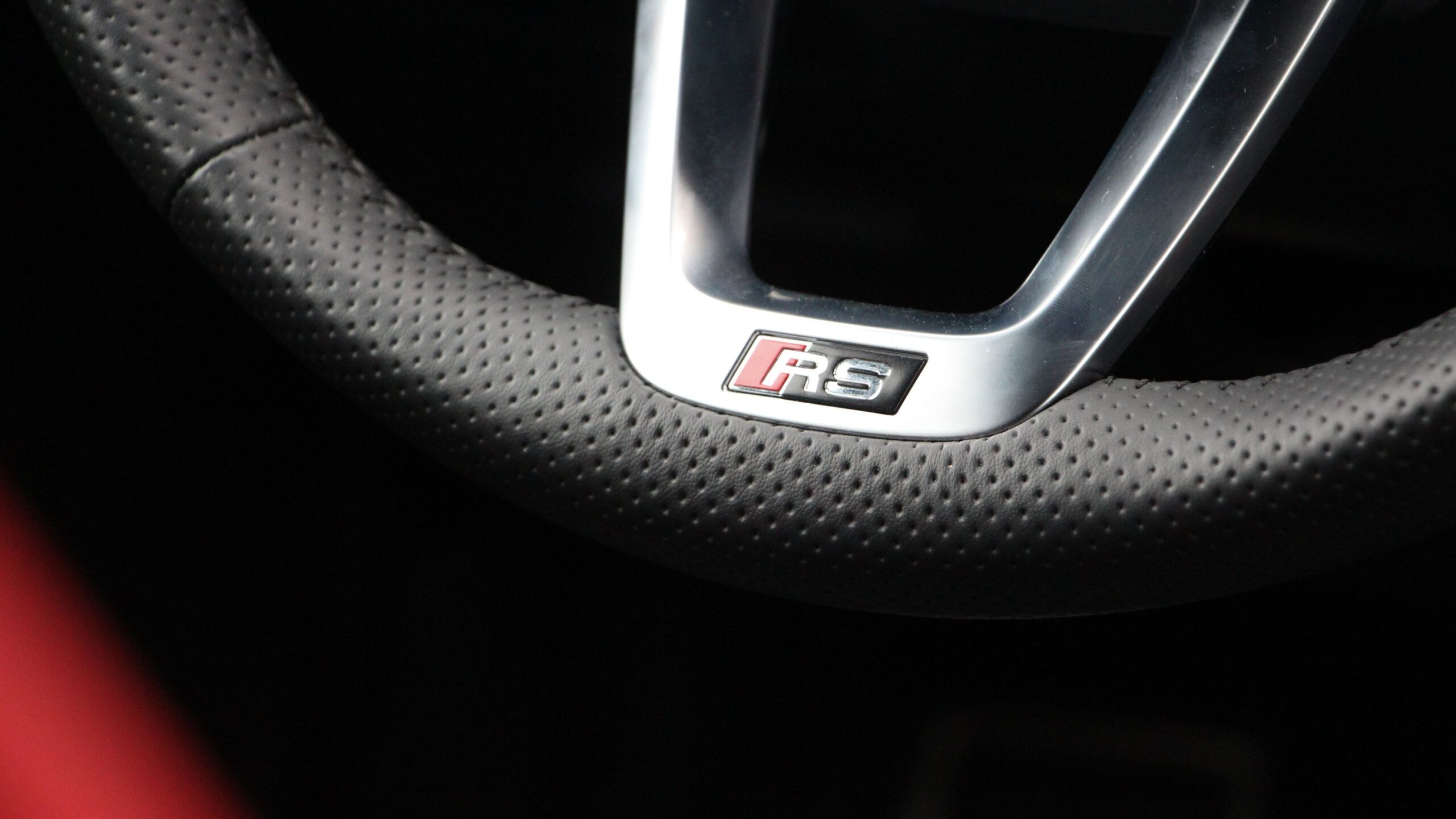 Az utastér viszont kicsit sótlan, pedig a kötelező elemek azért jelen vannak. Beléjük kötni sem lehet igazán. Az RS logós sportkormány fogása kiváló, alul nem lapított, de annyi baj legyen, ez nem ront a kiválóságán. A bőrbe burkolt, egybe-fejtámlás sportülések jól tartanak a tempós kanyarokban. Emellett RS dombornyomottak, méhsejtmintás varrással, vörös cérnával és vörös oldalkárpittal próbálták dögösebbé tenni. Aztán ott vannak a fémbetétes pedálok is, továbbá a karbonmintás díszbetét a műszerfalon, egy kis Alcantarával megtámogatva. Szóval nem tudom, valójában mit hiányolok. Talán egy kis színt? A karosszéria fényével? De hát az is szürke, a már-már ikonikus Nardo, ami minden autónak jól áll. Visszatérve a műszerfalhoz, itt kapunk 10,1 colos érintőkijelzőt, illetve 12,3 colos digitális műszeregységet. A formákat az Auditól megszokottan vonalzóval rajzolták, de az ergonómiára ügyeltek. Minden könnyen átlátható, a klíma is fizikai gombos panelről kezelhető, szóval öröm és boldogság. A hátul helyet foglalóknak is, mert a lábtér kellemesen nagy, az ülések kényelmesek és ugyanolyan díszesek, mint az elsők. A csomagtérből pedig RS-ként sem veszít, ugyanúgy 530 literes alapból, ami 1525 literesre bővíthető, szóval ez egy praktikus sportautó.