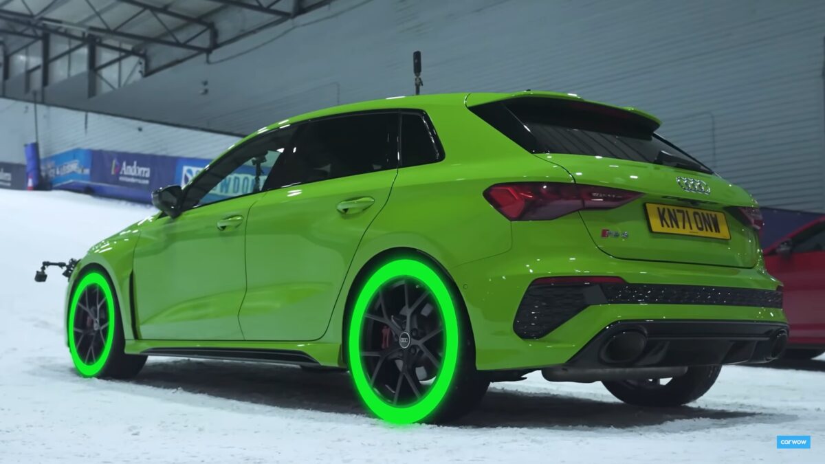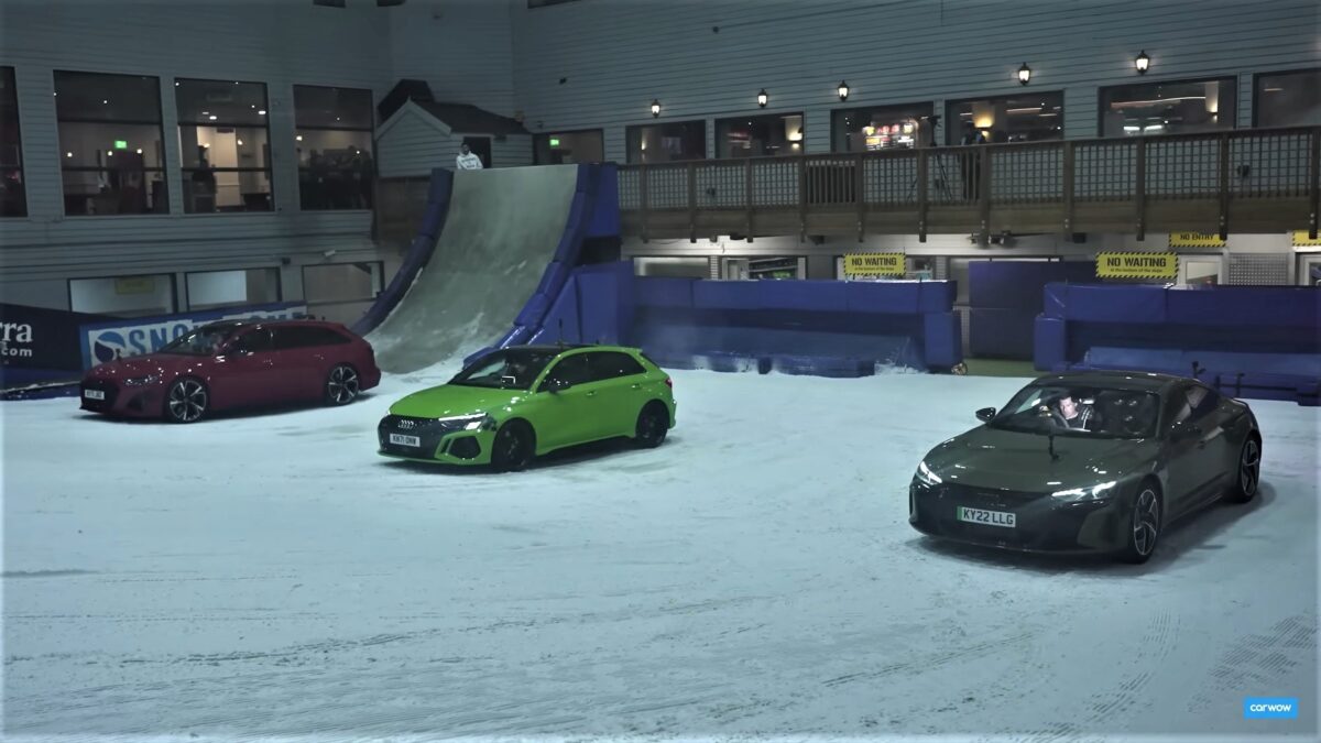 Egy beltéri sípályán derül ki, hogy melyik Quattro megoldás a legjobb: íme az RS Audik különleges gyorsulási versenye! (Fotók: Youtube.com/carwow)