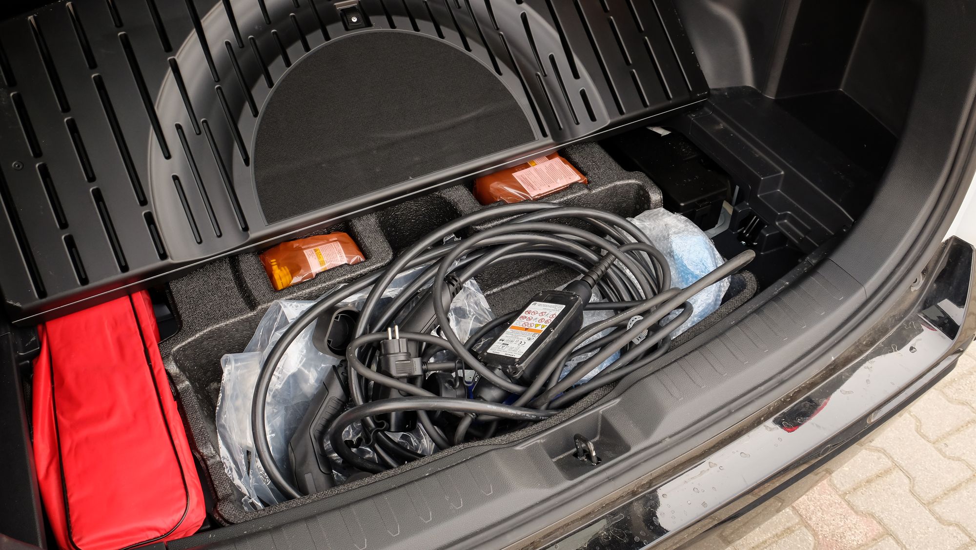 A padlórekesz egyszerre is el tudja nyelni a Type2-es és a konnektoros töltőt, a csomagtérbe 150 W-os, 220V-os csatlakozó is került