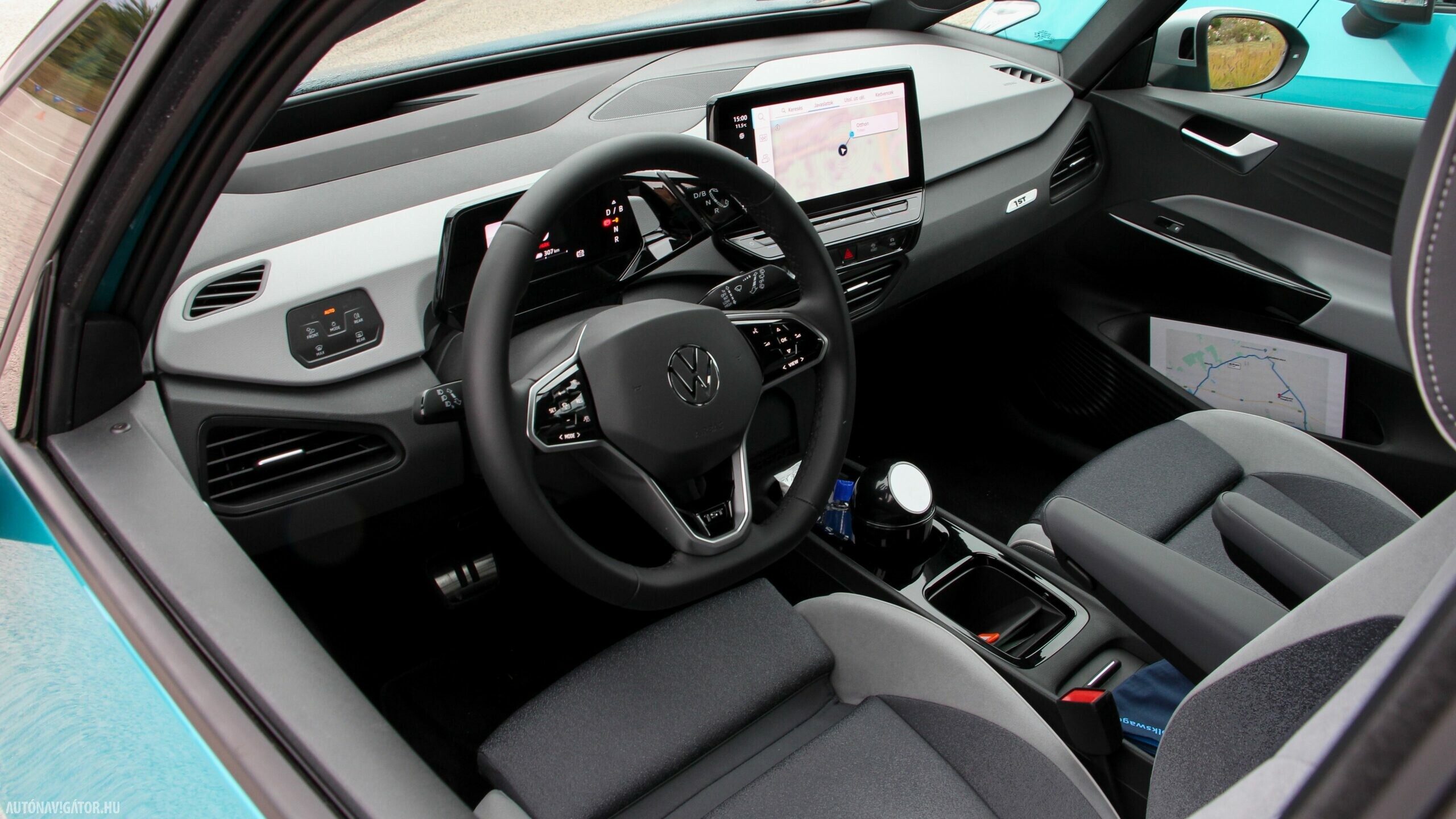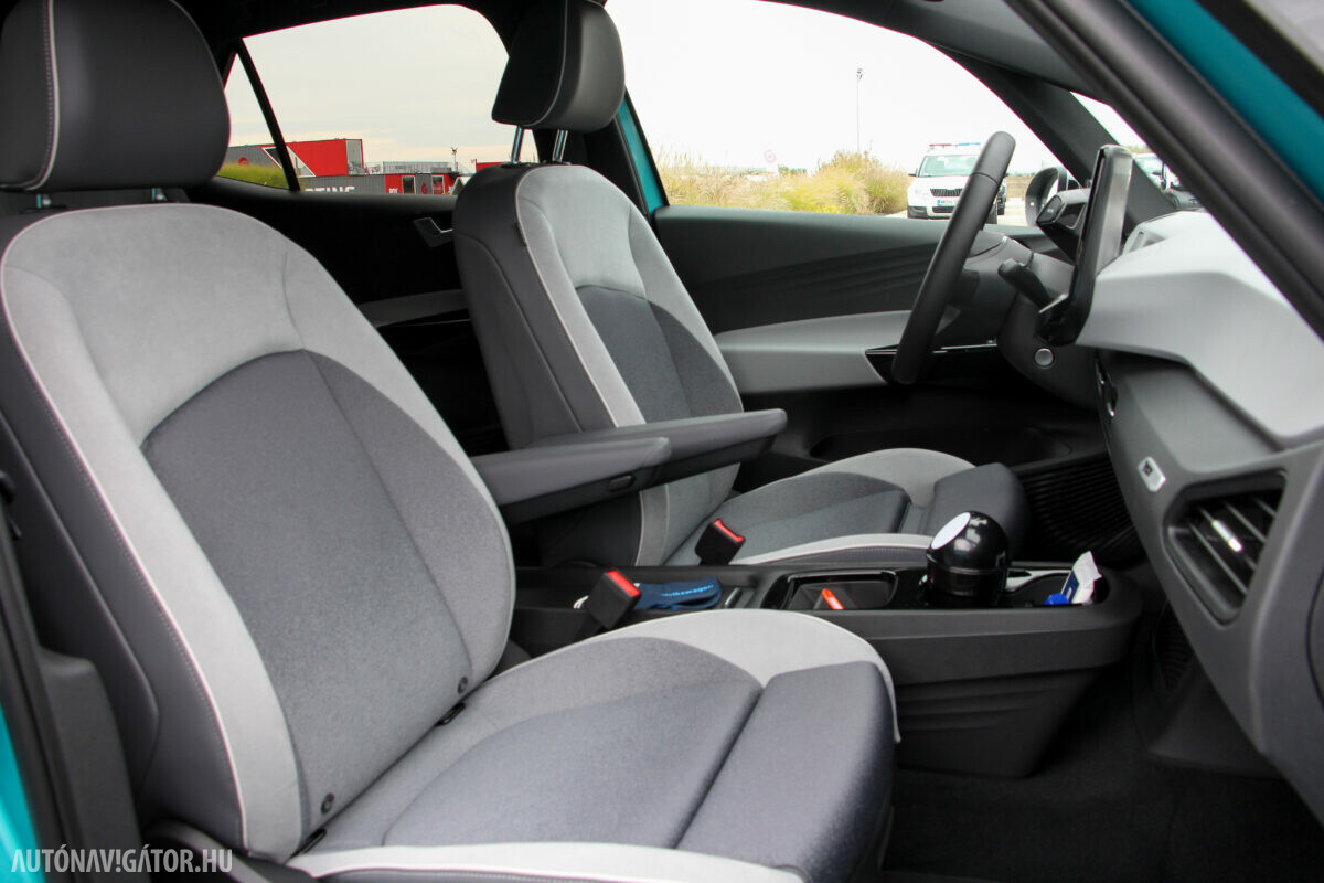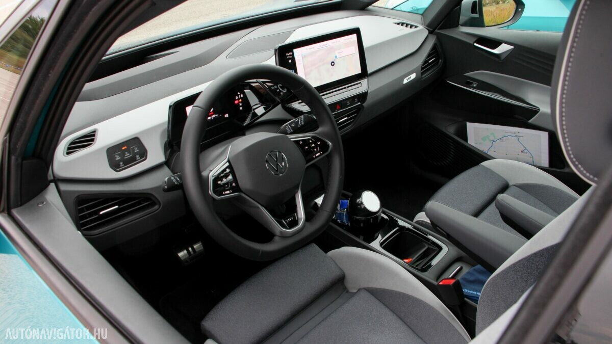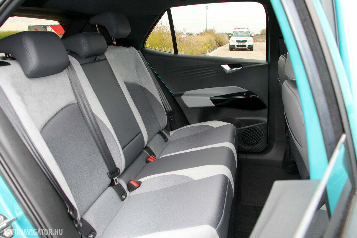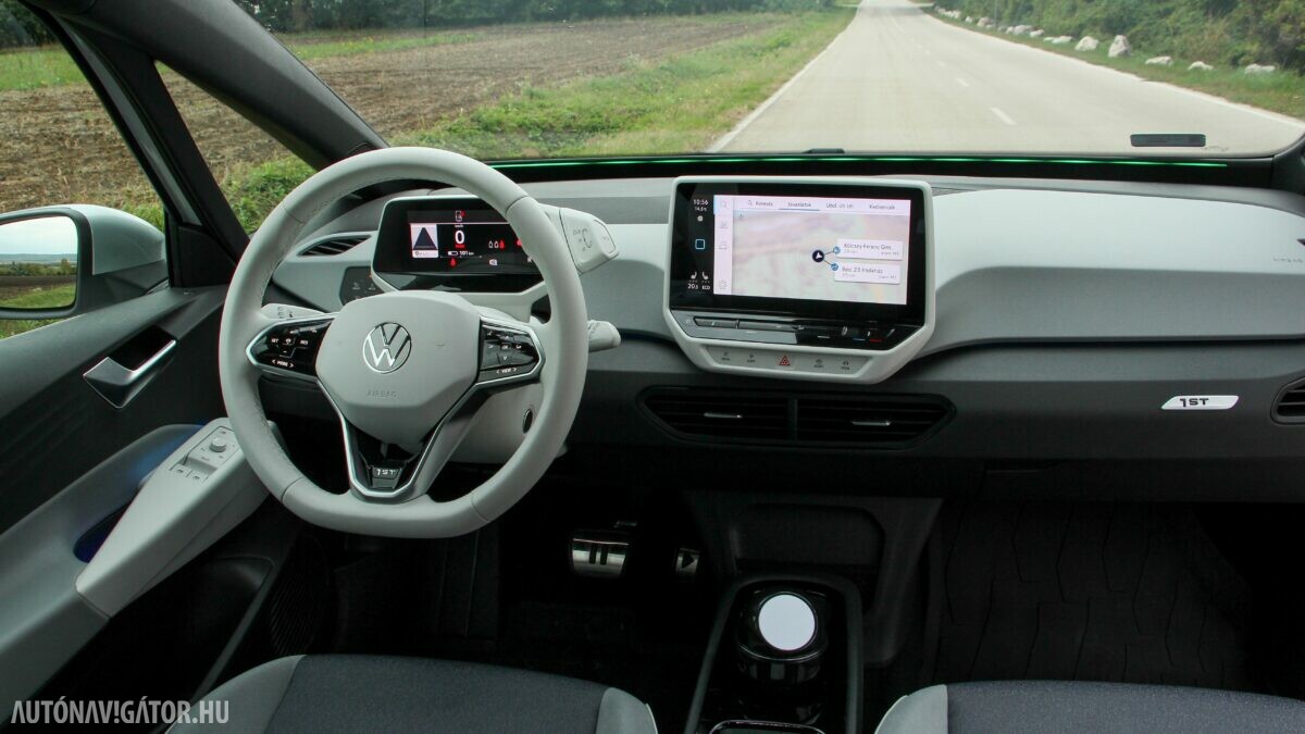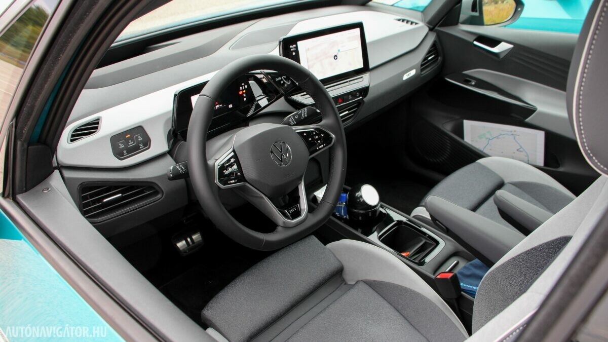 Az Open Space fantázianevű utastér légies, mint egy egyterűben. Az ID.3 voltaképp az, ha tapintásra egyszerű, de jópofán sok árnyalattal játszó kárpitokkal és persze jópofa részletekkel, ugyanakkor a már említett érezhető spórolásokkal. A sofőr ajtajára például a hátsó ablakok elektromos mozgatásához nem kerültek külön gombok, egyszerűen a "Rear" érintőfelület megnyomása után vezérelhetjük őket az elsőkhöz is használatos billentyűkkel. Természetesen teljesen digitális a műszerblokk, alapáron jár a központi érintőkijelző is, amin a navigáció mondjuk nem ismerte a drivingcampet.