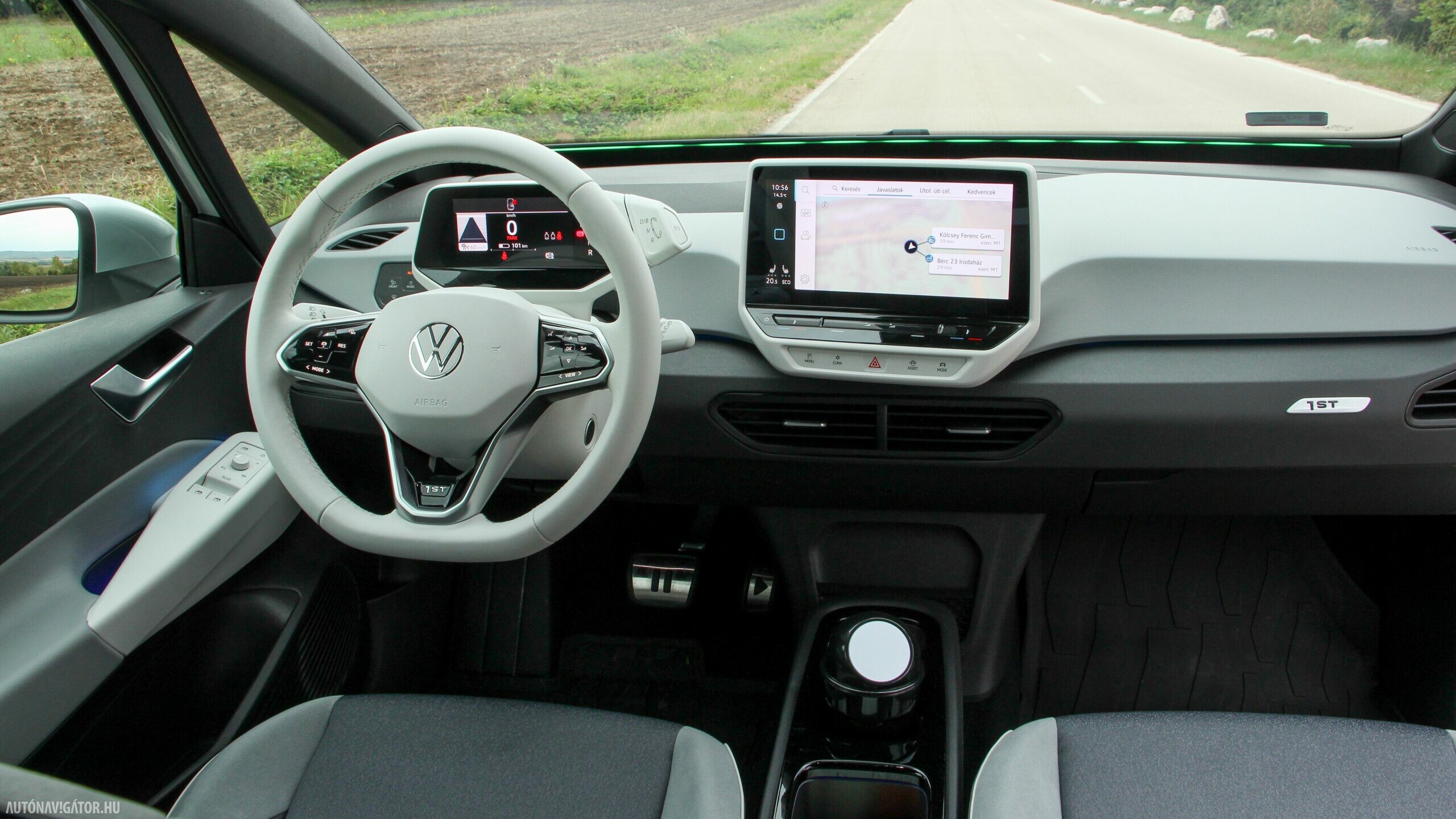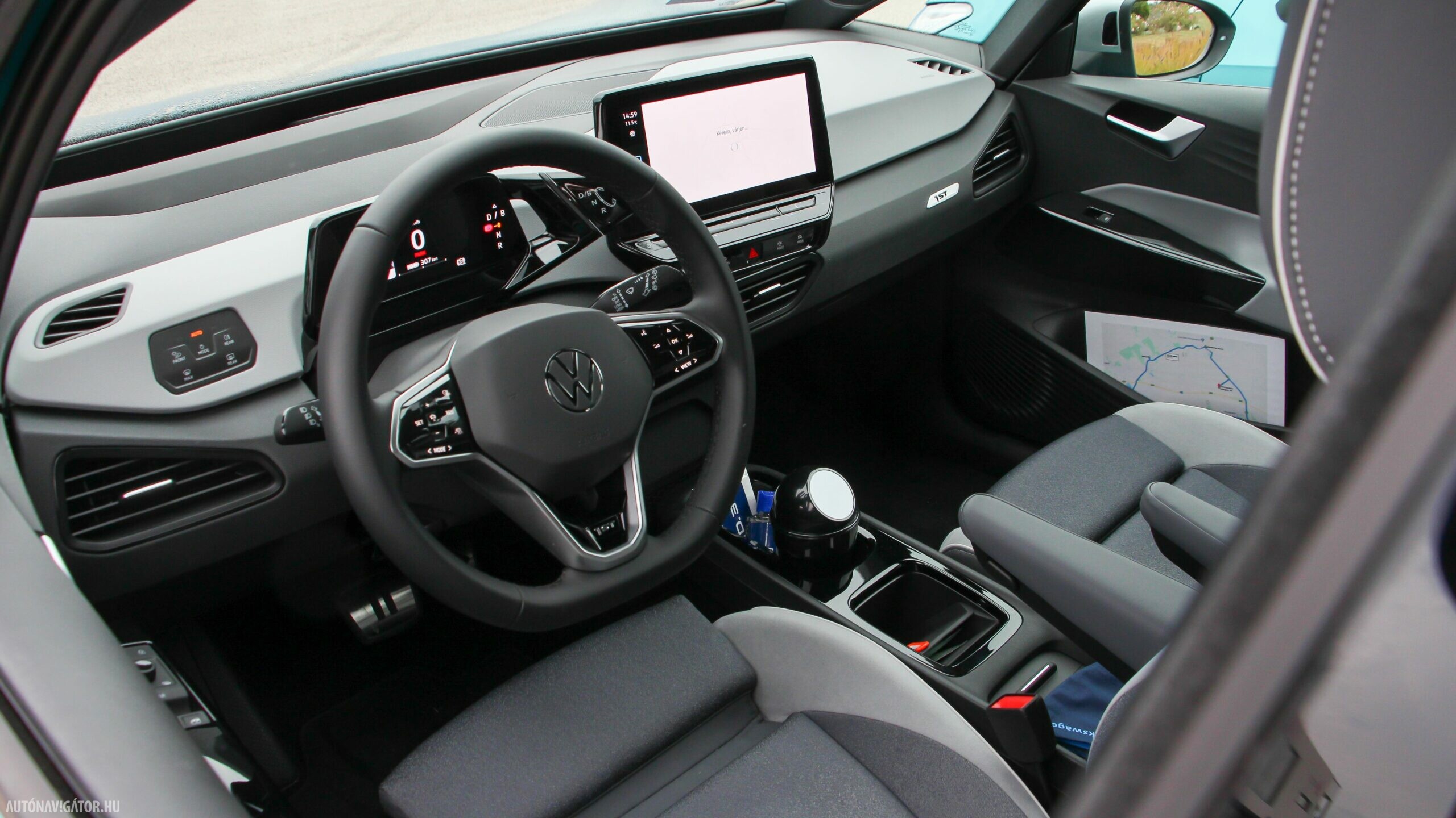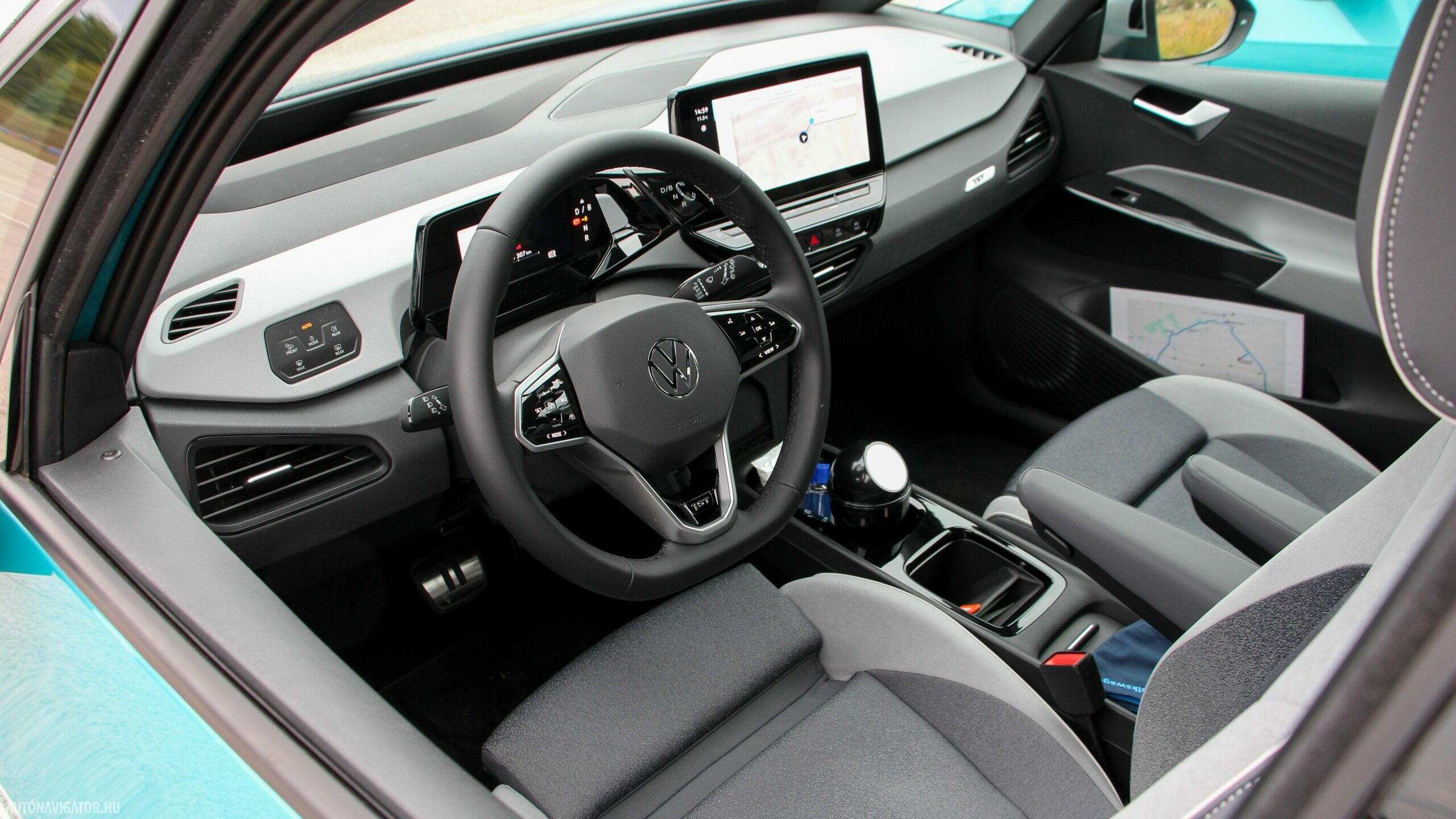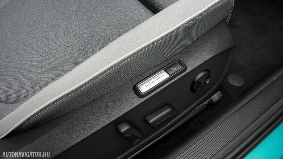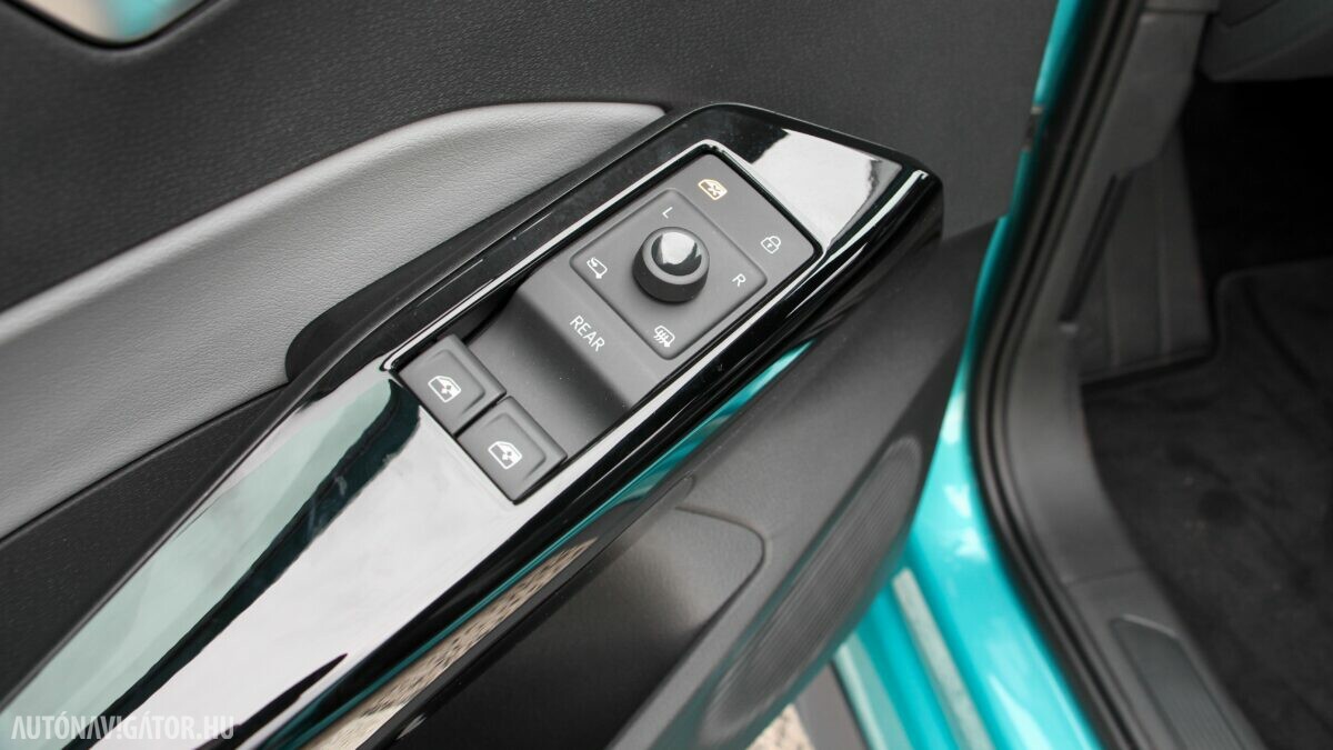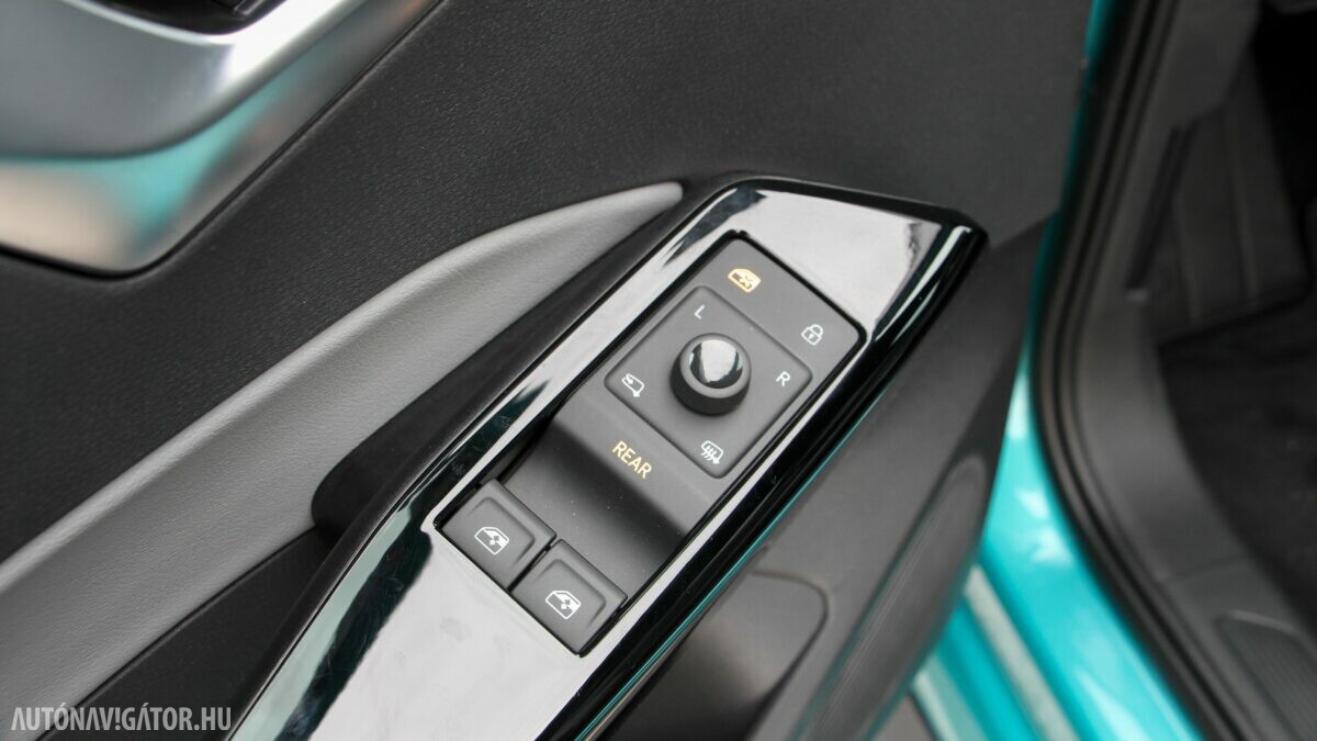 Az Open Space fantázianevű utastér légies, mint egy egyterűben. Az ID.3 voltaképp az, ha tapintásra egyszerű, de jópofán sok árnyalattal játszó kárpitokkal és persze jópofa részletekkel, ugyanakkor a már említett érezhető spórolásokkal. A sofőr ajtajára például a hátsó ablakok elektromos mozgatásához nem kerültek külön gombok, egyszerűen a "Rear" érintőfelület megnyomása után vezérelhetjük őket az elsőkhöz is használatos billentyűkkel. Természetesen teljesen digitális a műszerblokk, alapáron jár a központi érintőkijelző is, amin a navigáció mondjuk nem ismerte a drivingcampet.