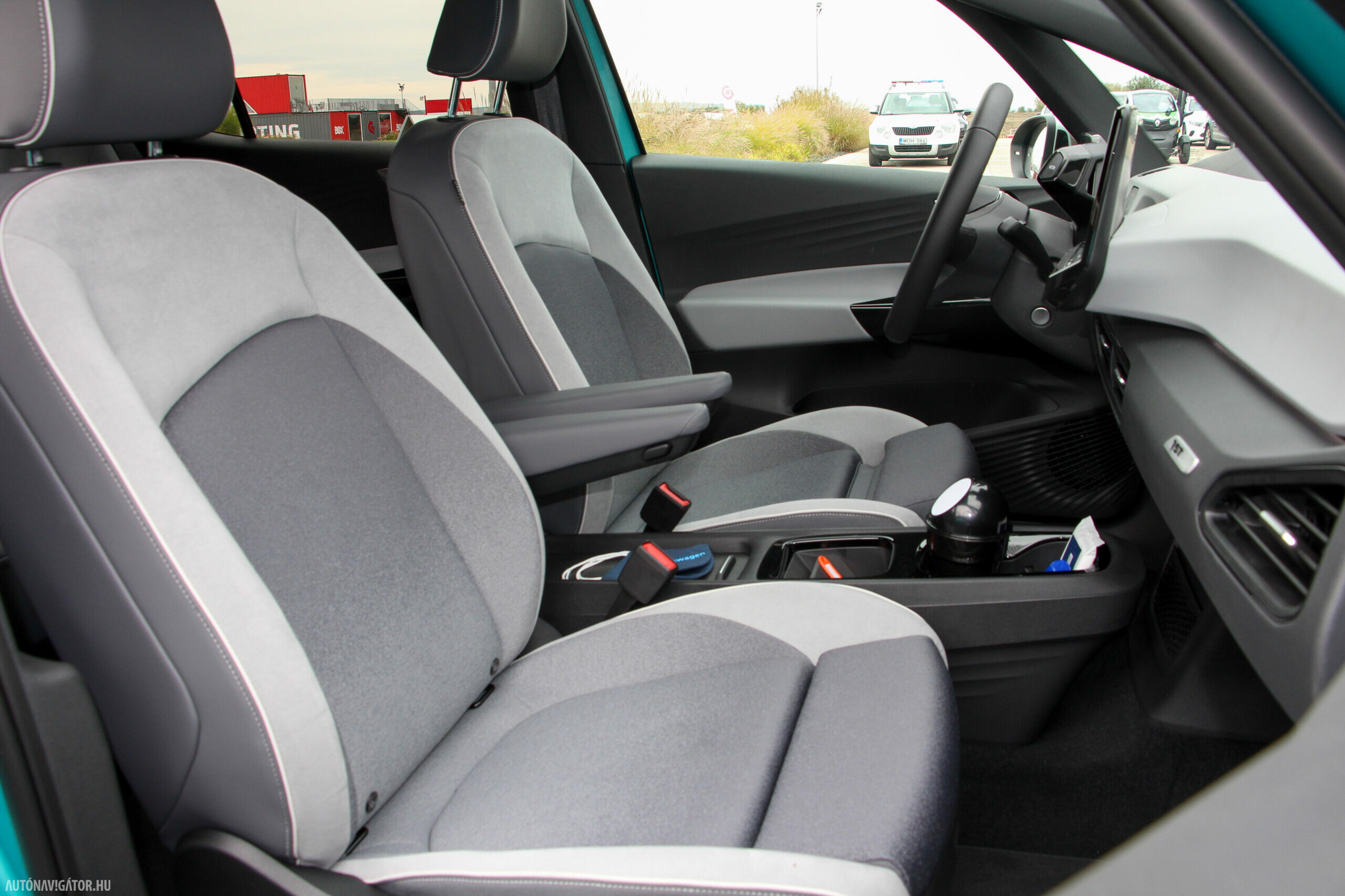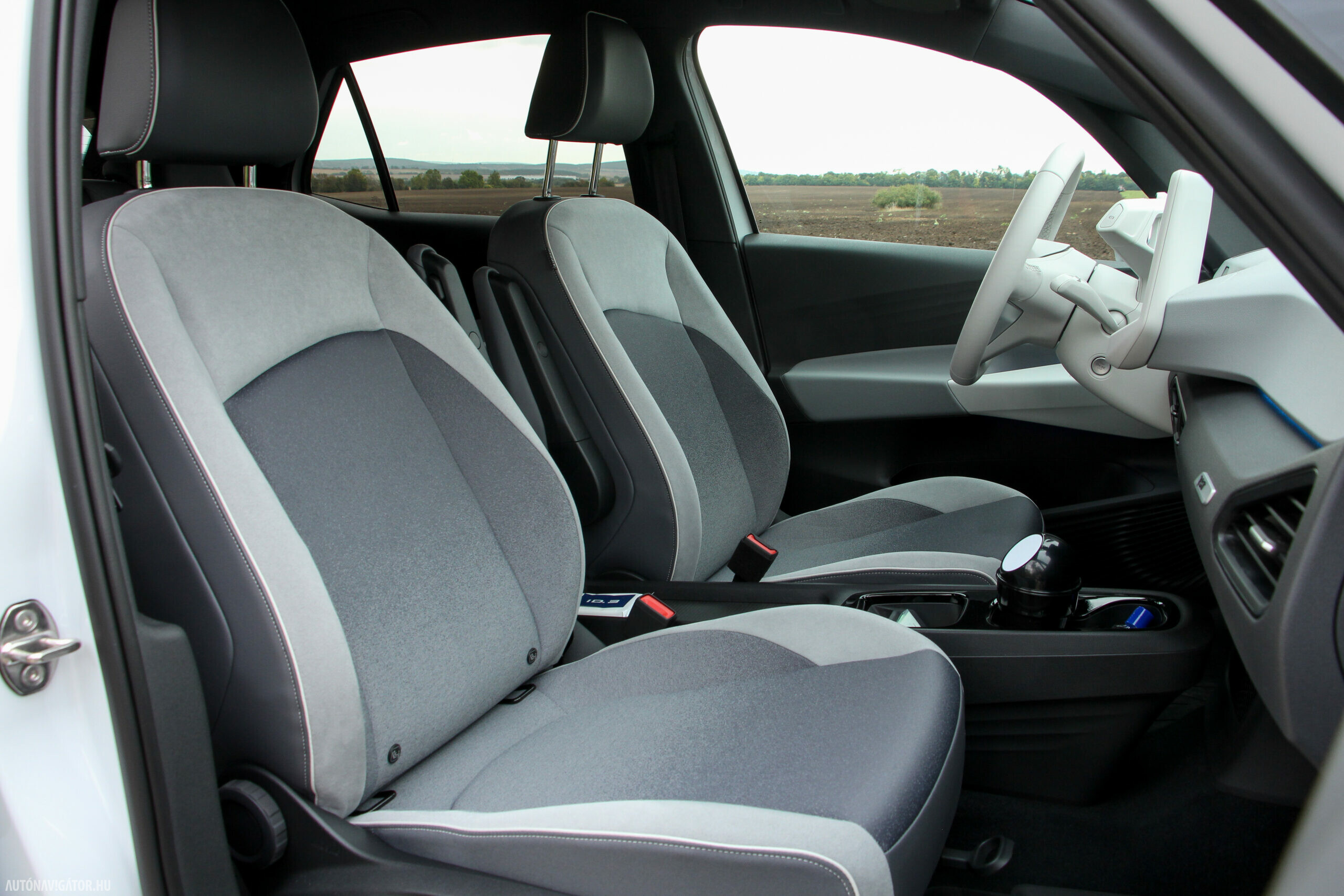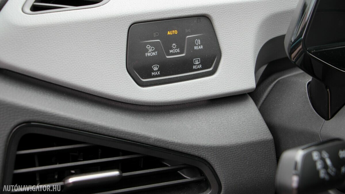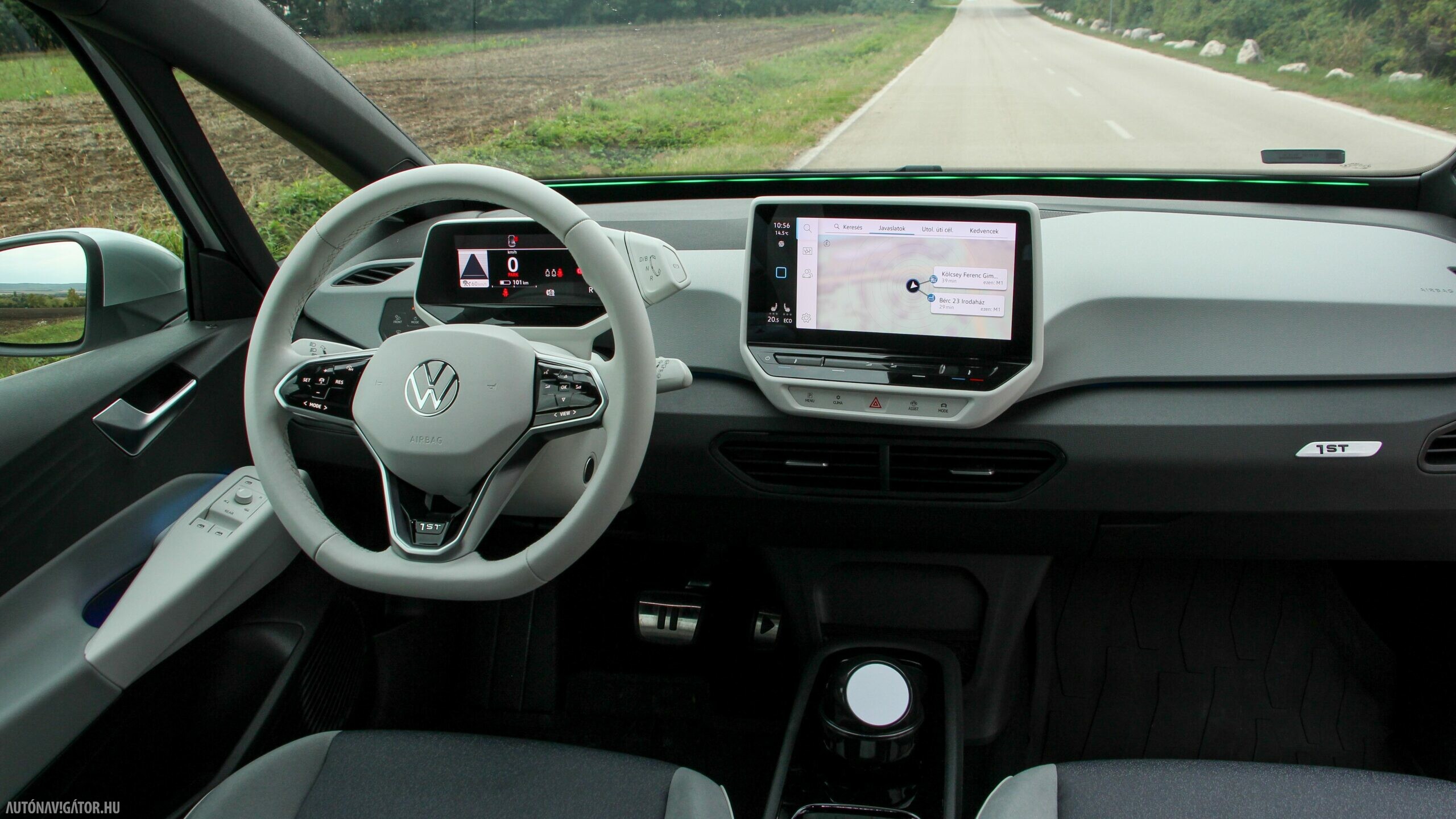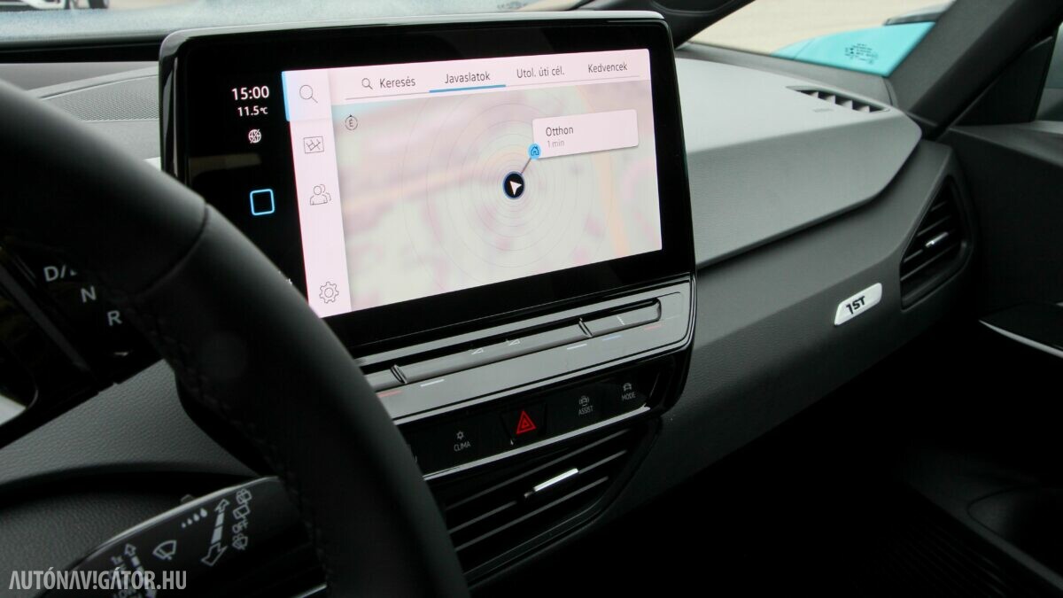 Az Open Space fantázianevű utastér légies, mint egy egyterűben. Az ID.3 voltaképp az, ha tapintásra egyszerű, de jópofán sok árnyalattal játszó kárpitokkal és persze jópofa részletekkel, ugyanakkor a már említett érezhető spórolásokkal. A sofőr ajtajára például a hátsó ablakok elektromos mozgatásához nem kerültek külön gombok, egyszerűen a "Rear" érintőfelület megnyomása után vezérelhetjük őket az elsőkhöz is használatos billentyűkkel. Természetesen teljesen digitális a műszerblokk, alapáron jár a központi érintőkijelző is, amin a navigáció mondjuk nem ismerte a drivingcampet.