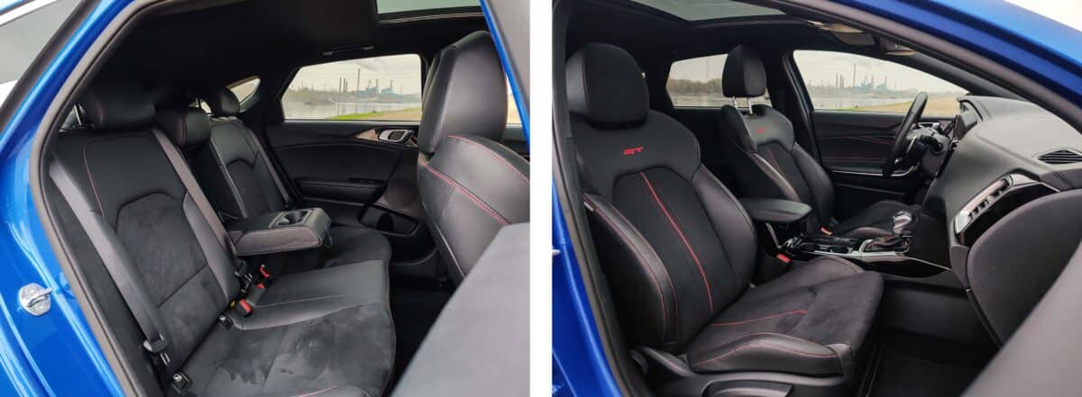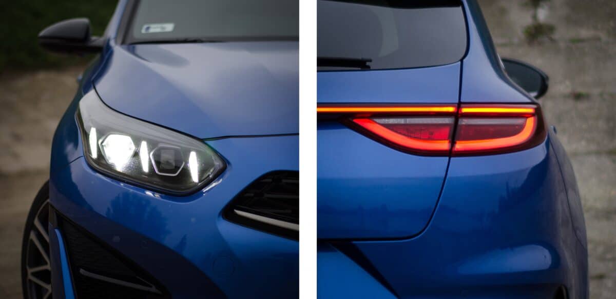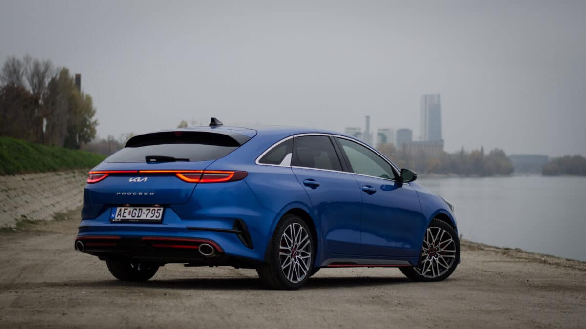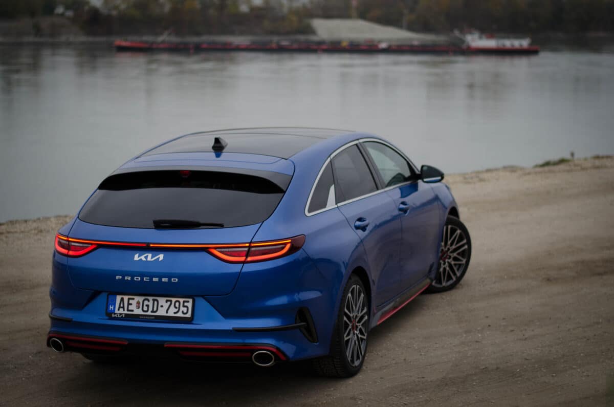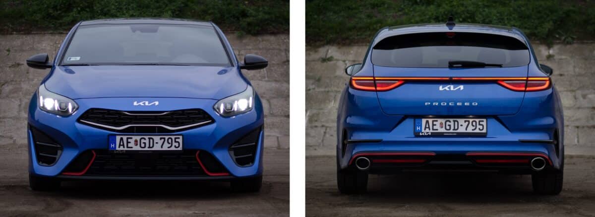 A ProCeed GT külleme talán csak azért tűnik visszafogottnak, mert az alapokat már megszoktuk az évek alatt, illetve mert az újabb fejleszésű konkurencia rengeteg LED-csicsával és futurisztikus élekkel próbál minél modernebbnek tűnni. Bizony, a jelenlegi Ceed család már az életciklusa végéhez közelít, és a jelenlegi kínálatban mondhatni őskövületnek számít. Mindez a méreteken leginkább csak ránézésre tűnik fel, valójában egyáltalán nem kicsi autó a ProCeed, még akkor sem, ha a valódi kompakt kombikhoz meg sem próbál felzárkózni.