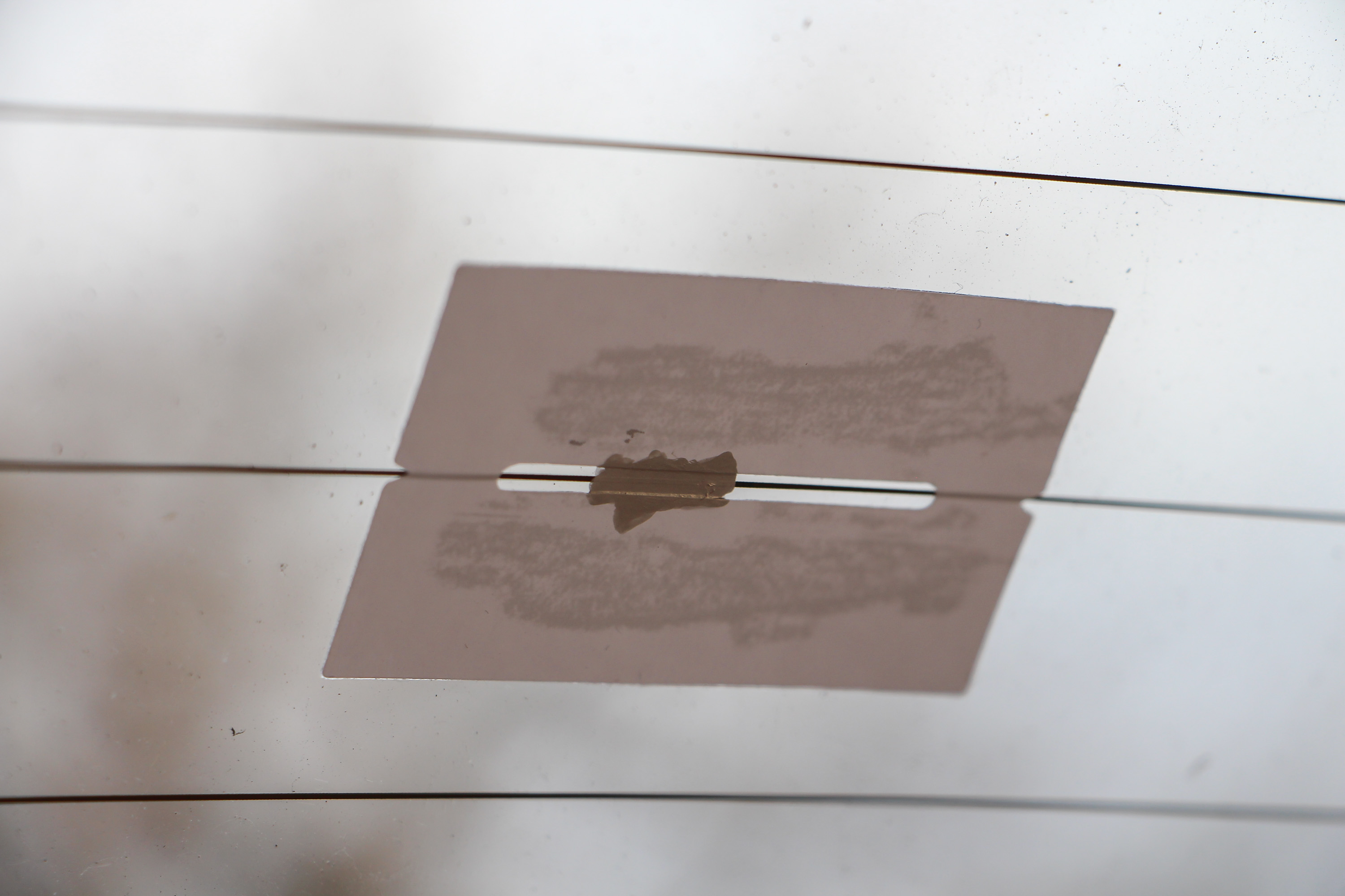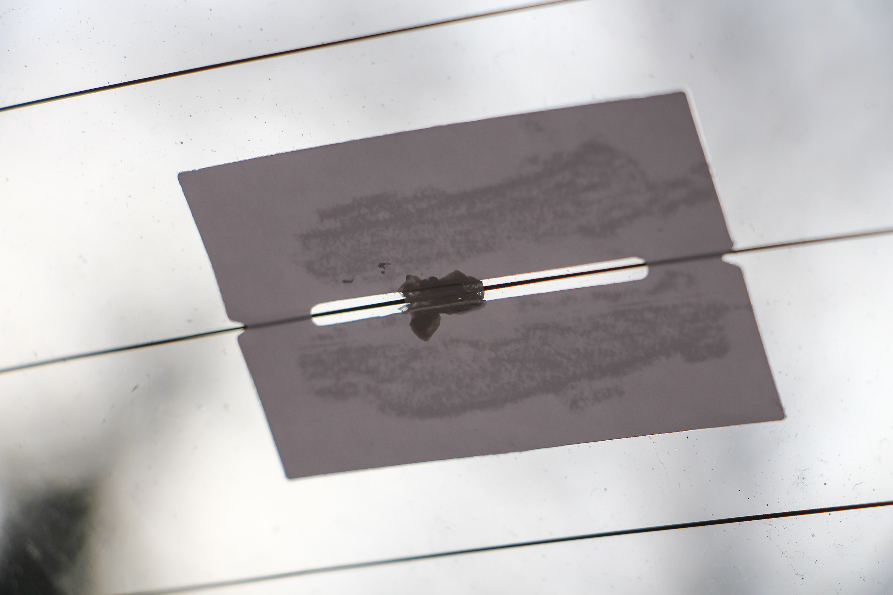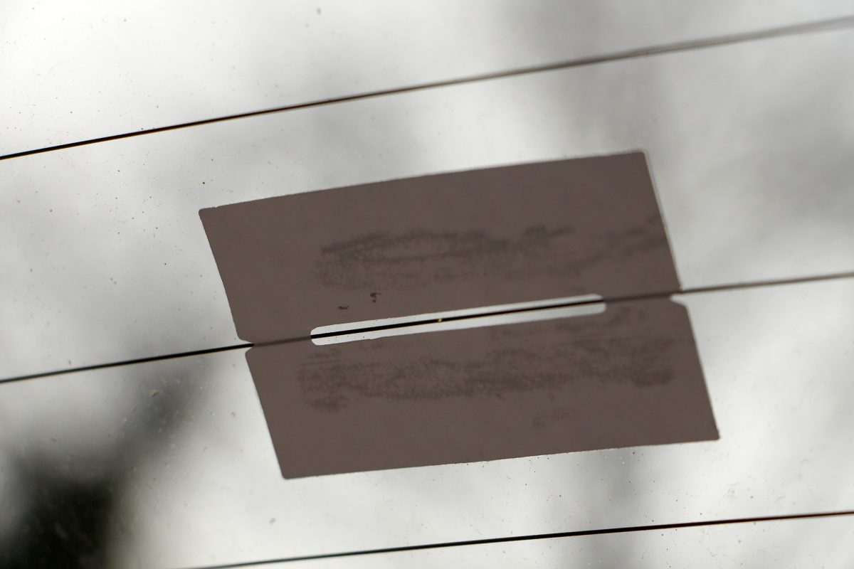 A zsírtalanítás egy sima ablakmosás, nyilván úgy, ahogyan fűtőszálas ablaknál kell: a törlést a szálakkal párhuzamosan, véletlenül se azokkal merőlegesen végezzük. Utána a készletben lévő maszkolópapírral körberagasztjuk a csíkot, és következhet a javítás. Utóbbi nem más, mint a folyadék (felrázás utáni) ecsettel való felvitele - nem csupán a sérült, hanem az azt megelőző és követő részre. A maszkolópapír jóval szélesebb helyet hagy, mint a fűtőszálé, de én úgy voltam vele, hogy talán nem véletlenül csinálták ilyen szélesre, így aztán egy nagyjából 1 centi hosszú és a maszkoló által adott 2 mm széles részt kentem le.