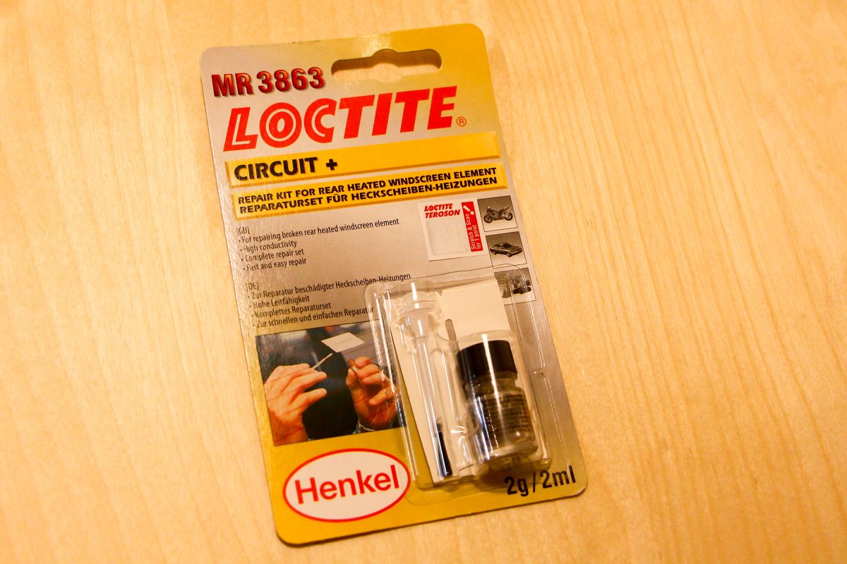 Közel két éve vásároltuk Peugeot iOnunkat, ami a feleségem autója, én csak ritkábban vezetem. Ha naponta tenném, bizonyára hamarabb eljutottam volna a hátsó ablak fűtőszálának javításához, így azonban kissé lassú volt. Idén ősszel én is felismertem, hogy felülről a harmadik csík nem fűt, ami pont kellően idegesítő helyen van. Aztán december elején sikerült is beszereznem a Kauffertől az elég ígéretes Loctite MR 3863 fűtőszáljavító készletet, ami 3490 forintos árával semmiségnek tűnik a fűtőszál - ablakkal együttes - cseréjéhez mérten. Tartalma egy apró tégely 2 ml ezüstös, nyilván jó vezetőképességű folyadékkal, egy ecsettel és egy öntapadós maszkolópapírral.