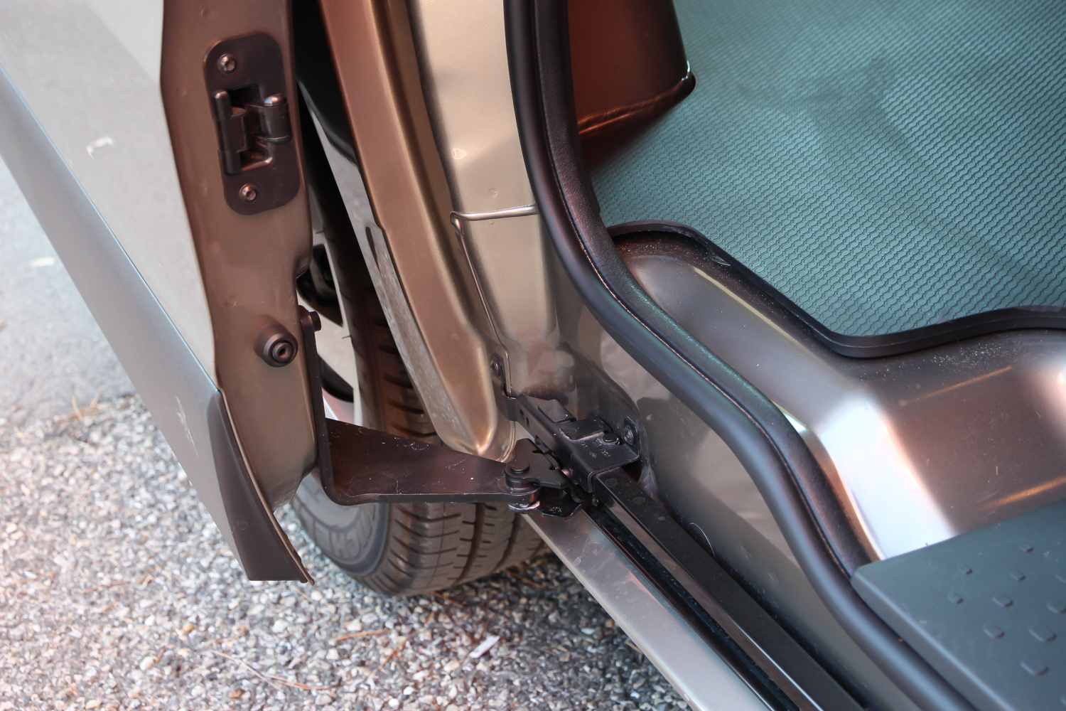 A dupla szárnyú ajtó a végállásban stabilan rögzül, az oldalsóhoz (ami 1,03 x 1,284 méteresre nyílik) jár fellépő is, zsanérozása masszív