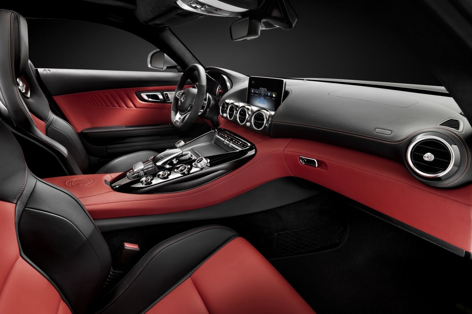 A belterét már láthattuk. Bőrbe varrott, modern sportkocsibelső Mercedes AMG módra, a legjobb minőségben, a könyöklőn nyomott AMG logóval