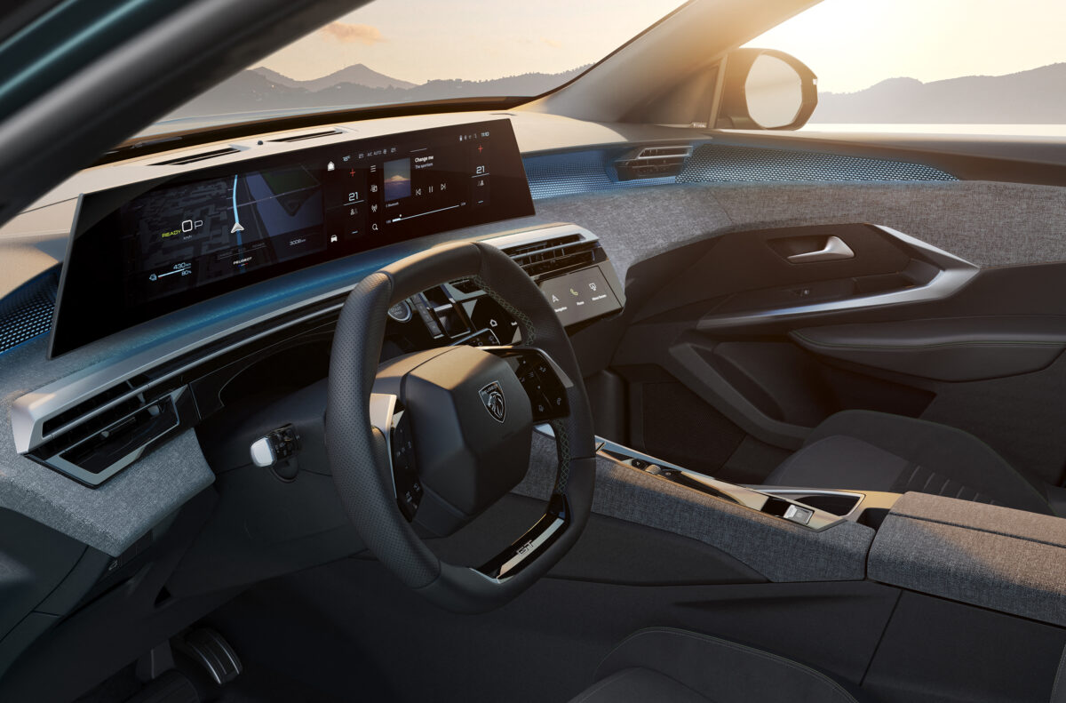 A beltér is érezhetően modernebb, a már megszokott i-Cockpit elrendezést egy hatalmas, ívelt közös felületbe épített kijelzőpárossal fejelték meg. Ezen felül a dizájn a jelenlegi Peugeot modellek óvatos továbbfejlesztése, így aki eddig is szerette a francia márka megosztó megoldásait, annak valószínűleg az E-3008 utastere is szimpatikus lesz.