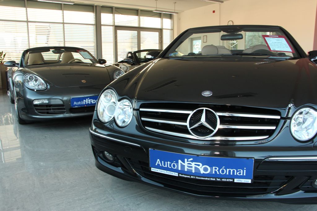 Az Autó Néró Rómainál tovább toporogva azonban könnyű átcsábulni a két BMW és a mesés, de azért hatévesen sem ötmilliós Porsche mellől egy Mercedeshez. Érdekes, de hiába idősebb az előbbi 3-as BMW-nél a CLK, formájával fiatalabbnak hat, motorja szerényebb. Az E-osztály alapú kabrióban az alapmotor dolgozik, ami 1,8 literes, kompresszorral töltött, négyhengeres, 163 lóerős benzinest jelent. Manuális váltóval még meglenne a 10 másodperc alatti gyorsulás, az ebben szereplő ötfokozatú automatával pedig 10,5 s az érték. Zavar valakit? Autópályán – Németországban, korlátozásmentes szakaszon - 223km/órás végsebesség futható, a vegyes fogyasztási érték pedig itt sem horribilis, 8,7 l/100 km a gyári, azaz könnyedén 10 l alatti a valós vegyes érték. Kétségkívül ez a Néró-kínálat legszerényebb motorú kabriója, és egyben a leghasználhatóbb is. Hátul is hangsúlyosan szeparált ülései mögött a tető helyzetétől függetlenül 390 literes az így mindig tele is pakolható csomagtér. Az ellátmány sem szerény, ha a Boxsterénél és a 330 Cd-énél halványabb árnyalatban, de itt is barna bőrkárpit fedi az üléseket és az ajtókat, az ablakok és a tükrök természetesen elektromosan mozgathatók, utóbbiak fűtöttek is, a középső pedig elektrokróm, azaz éjjel a hátulról érkező fényszóróra sötétedő. A sofőrt ESP és tolatóradar is segíti, a futómű sportkivitelű, a hifi pedig Harman Kardon, tehát minőségi.