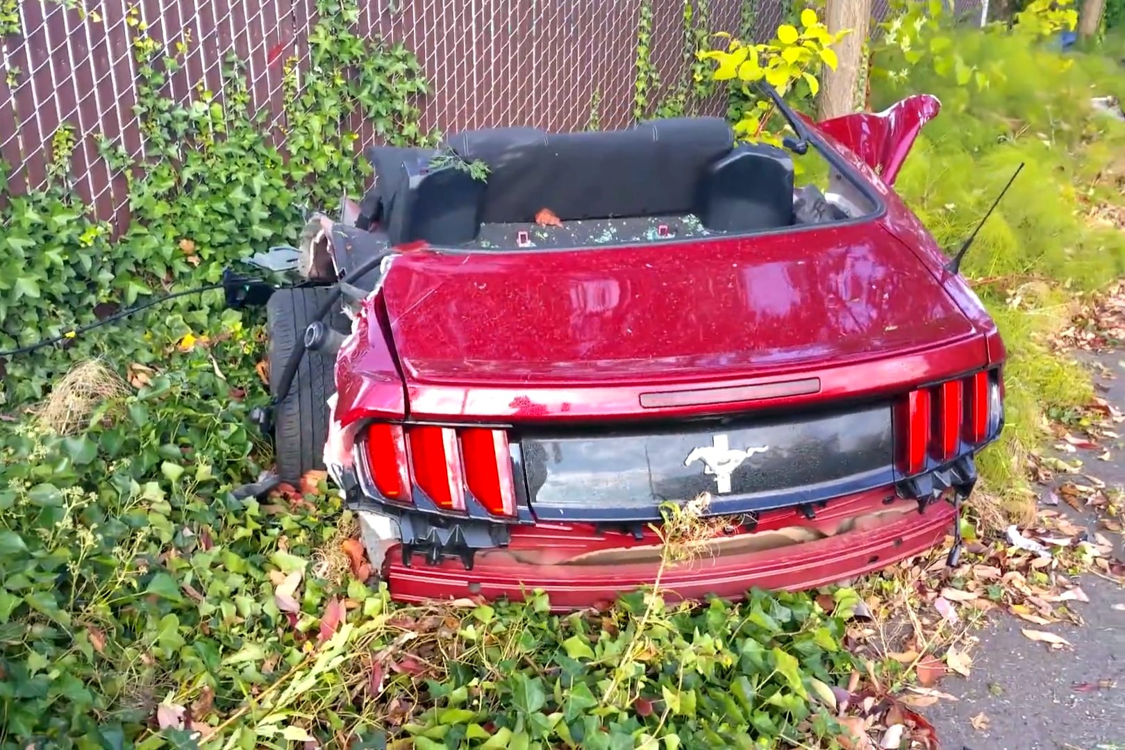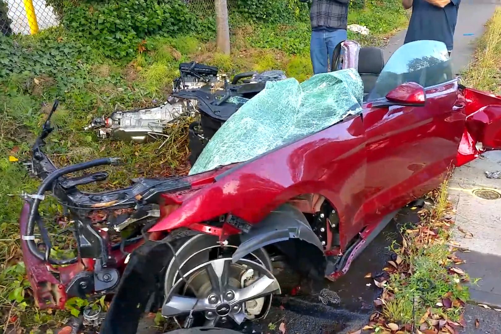 Valahol ott a távolban fekszik a Mustang hátulja, a két nagyobb darab között meg minden más. Borzasztóan néz ki, de a sofőr állítólag komolyabb sérülések nélkül elsétált. A bankszámlájának viszont fájni fog a bérelt sportkocsi