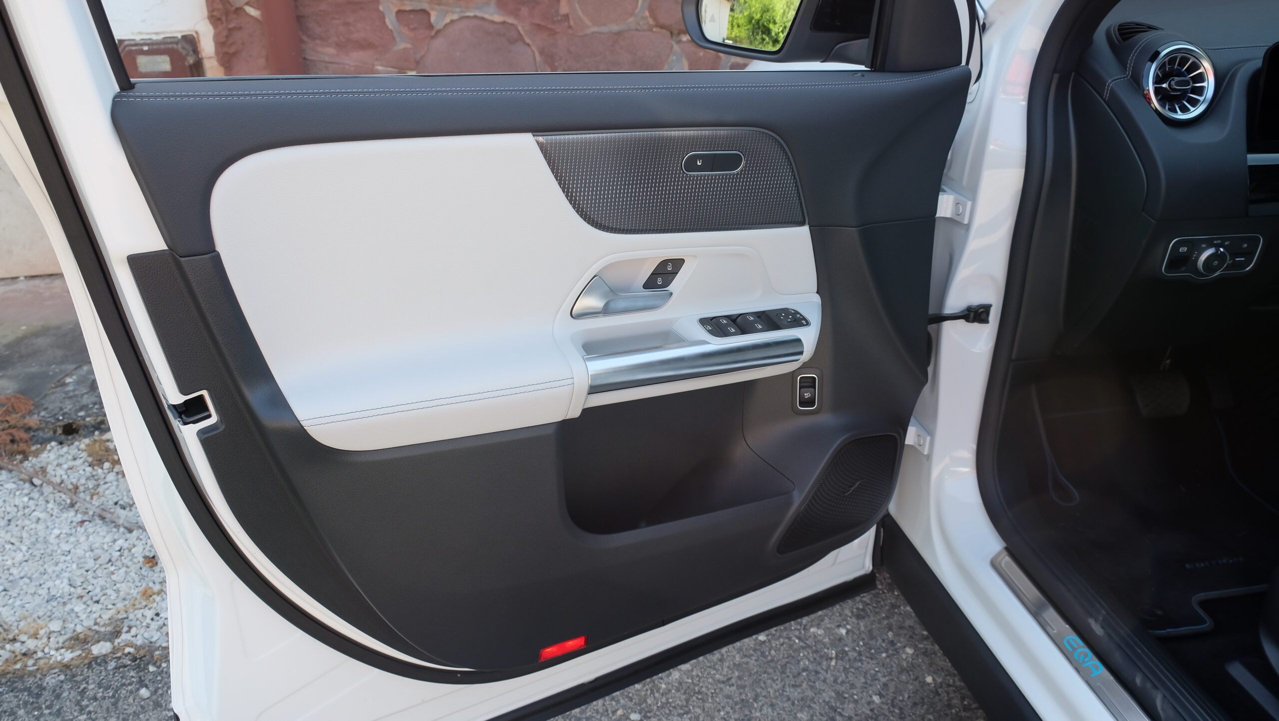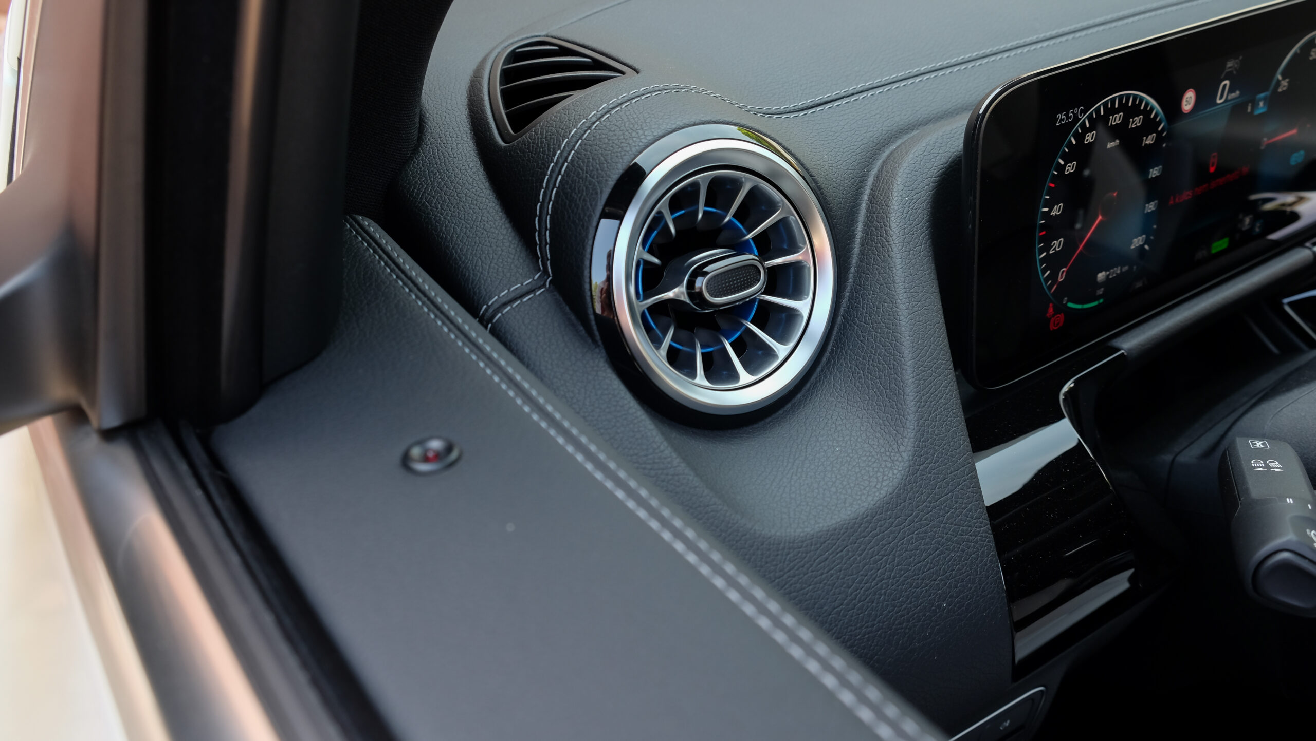 A kompakt Mercedesekből ismerős belteret kapjuk, természetesen villanyautós műszerblokkal, középre is előhívható energiaáramlás infókkal, virtuális valóság funkciós navigációval