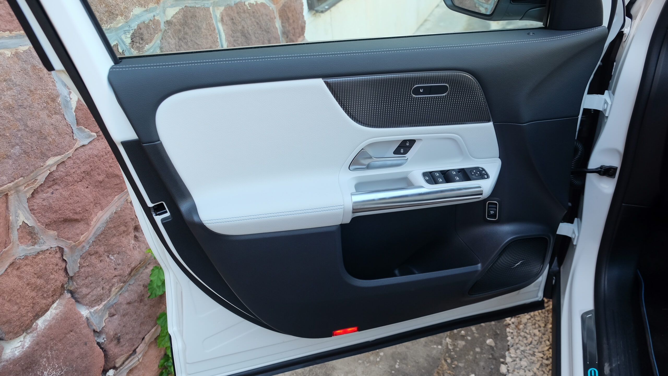 Belül az A-, B-, CLA-, GLA-osztályokból ismerős kompakt mercis műszerfal fogad. Oké, a nem annyira szem előtt lévő helyeken olcsóbb műanyagokkal, ugyanakkor két hatalmas kijelzővel, középen az előretekintő kamera által kiterjesztett valóság funkcióval. A navigáció jelei a kereszteződésekben a kameraképpel együtt jelennek meg. Van természetesen táblafelismerő, a kormánykeréken pedig a galvanizált, valódi fém felületeken túl tapipadok is, így elég sok minden irányíthatunk már onnan is. Maga a kormánykerék egyébként nagyon jó fogású és trükkös: küllői fémszínűek, de csak a gombok körüli felület a valódi fém. Érintőpanel a kormánykeréken túl - jóval nagyobb méretben "kardánboxra" is került, persze a kardán itt már erősen felejtős, nyoma sincs természetesen első és elektromos hajtás mellett. Az érintőpaddal az érintésérzékeny, tűéles képű kijelzővel is irányítható, elég logikus felépítésű, magyarul is tudó MBUX (nem embuksz, hanem embijúeksz) menürendszerben barangolhatunk.
