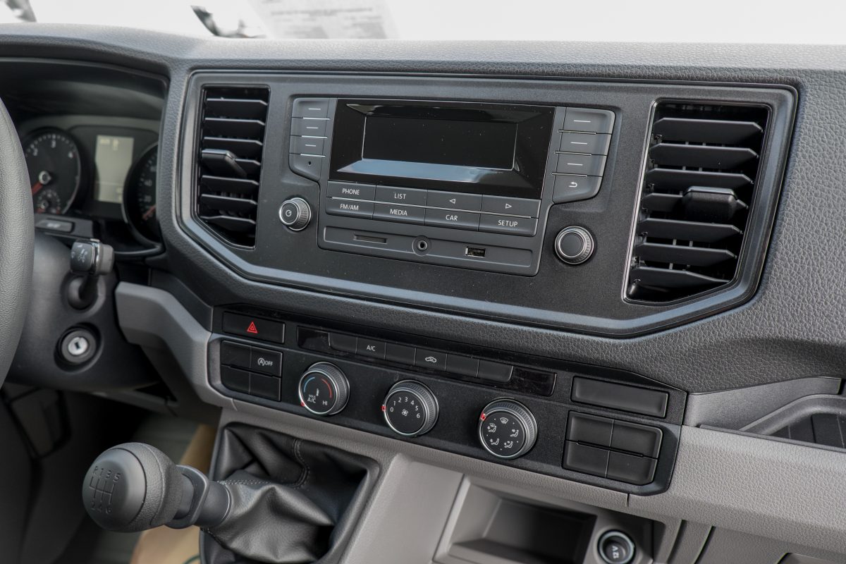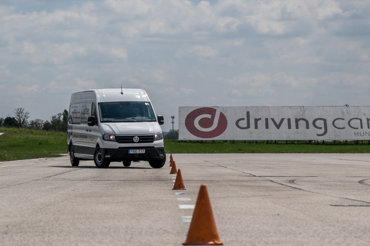 Az utastérben is teljesen személyautós, a Tiguanból is ismerős, alul lapított kormány akár bőrözve is kérhető, de a műanyag fogása is korrekt. A kormányzás közvetlen és hatalmas szögben fordítja a kerekeket, olyan feladatokba dobtak bele minket, amikben ennek nagy hasznát vettük. Időre szlalomozni egy ekkora, ráadásul hosszított kivitelű teherautóval izzasztó, de rénszarvastesztet is csináltunk, valamint a rántópadon is kihúzták alólunk a hátsó tengelyt. Üresen ügyesen mozog, pillanatok alatt össze lehetett szedni, egy tonna terheléssel sem mozgott másképpen. Vezetni személyautós, az ergoActive vezetőülés gázrugós csillapítással elringatja a sofőrt, pihentető munkahely. Szinte minden eszköznek találunk pakolórekeszt, azért csak szinte, mert például dedikált mobiltelefontartó nincs, pedig a Ford Transit óta tudjuk, ennek megoldása egész egyszerűen és elegánsan előadható.