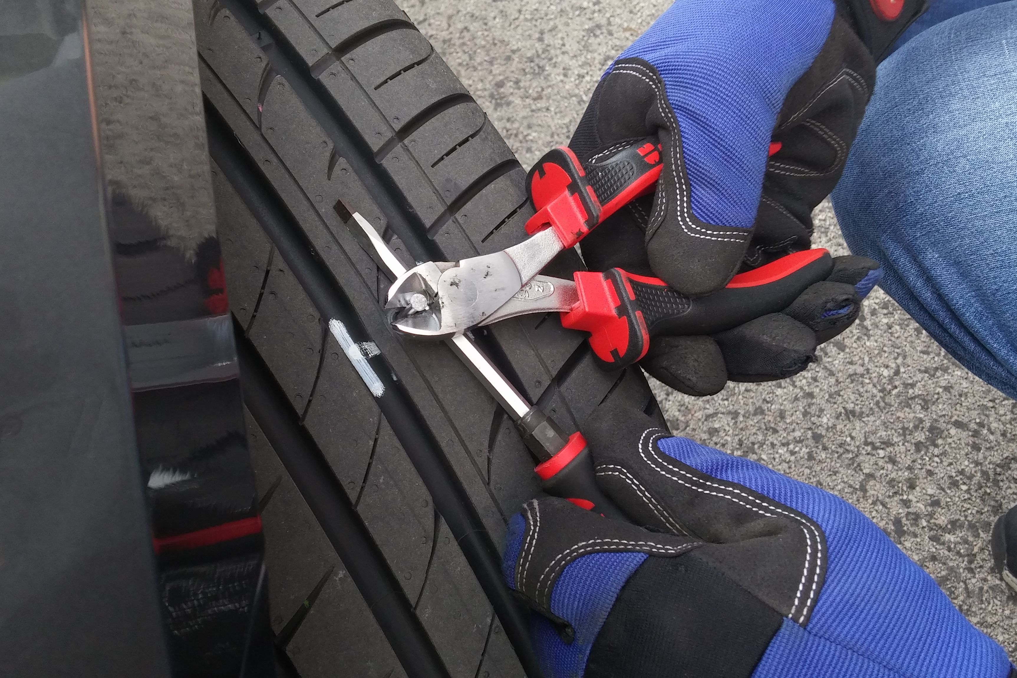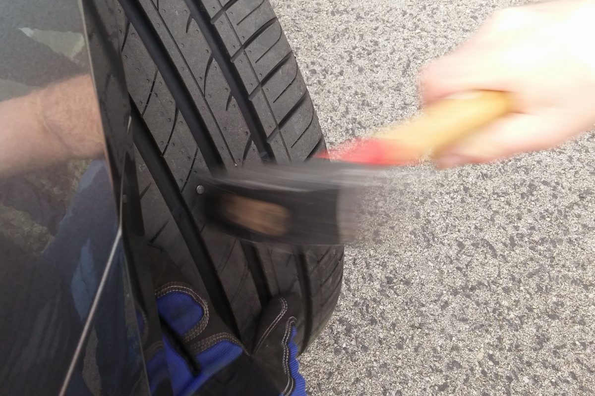 Az egyik helyre beütöttük, a másik helyről kiszedtük a szegeket, majd ezt követően forszírozott tempóban róttuk a köröket a drivingcampen. Az abroncs és az autó teljesen kezelhető volt, semmit nem éreztünk a benne lévő szegből és a lyukakból