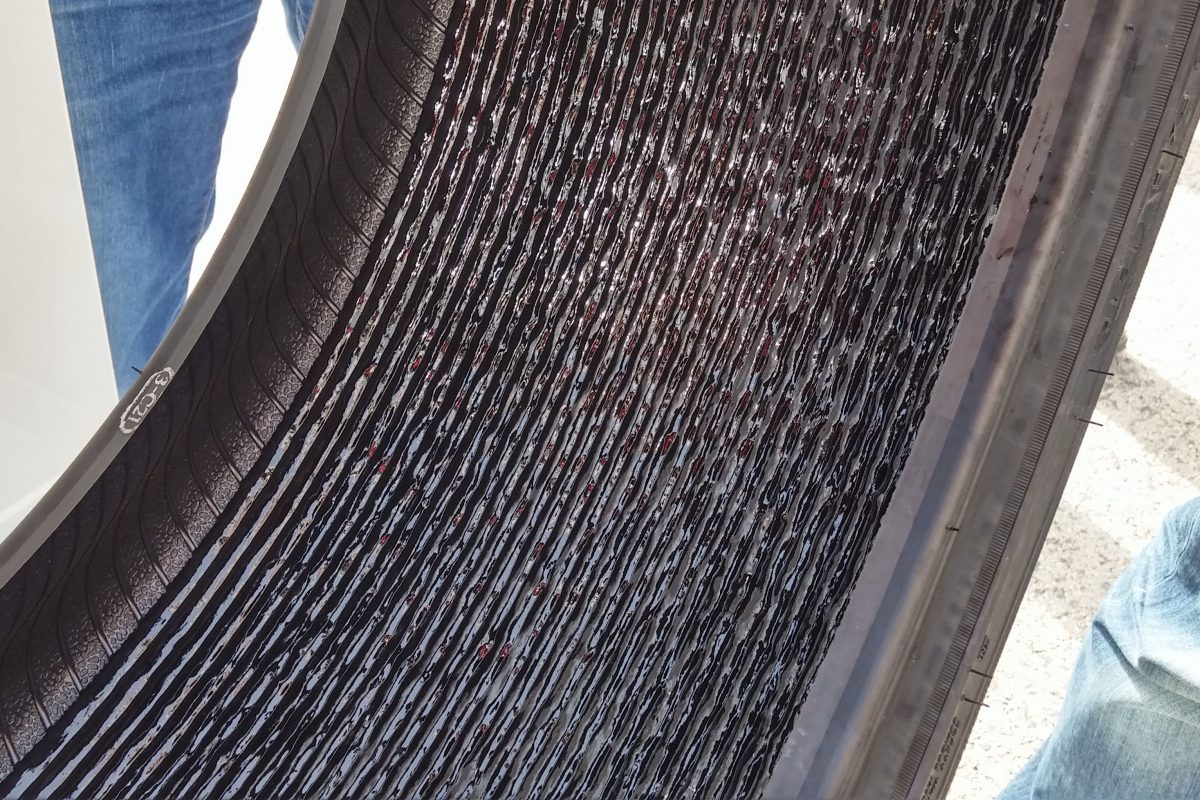 Bal oldalon figyelhető meg a SEALGUARD technológiáért felelő bevonat. A ragacsos anyag kitölti a defekt okozta kisebb lyukakat, így megúszhatjuk a gumiszerviz-látogatást