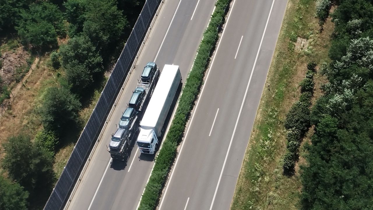 Magyarországon a hatályos jogszabályok értelmében tilos előzni az irányonként legfeljebb kétsávos autópályán és autóúton 6 óra és 22 óra között a 7500 kilogrammot meghaladó megengedett legnagyobb össztömegű teherautókkal és egyéb járműszerelvényekkel (fotó: Police.hu)