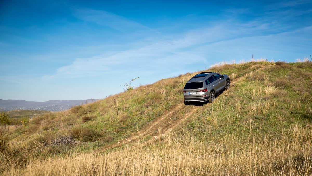 A Scout felszereltség az egyik legmagasabb és talán az, ami igazán megmutatja a Kodiaq valódi arcát. Egy szabadidő-autónak az elnevezésében is benne van, hogy jól érzi magát úttalan utakon is. A Kodiaq földúton még kényelmesebb is, mint aszfalton, kemény talajon úthibán áthajtva nagyokat tud zörrenni a karosszéria, földúton viszont mindegy, mekkora a pukli, azon simán átsuhan. Bár 19 colos felniket kapott ez is, durvább talajon is ügyesen mozog, de persze ezeket nem terepre találták ki. Mindenképp van összkerékhajtás is, ami a Kodiaq esetében a Volkswagen Haldex rendszerű elektronikusan vezérelt rendszere, vagyis az esetek 90 százalékában elöl kapar. Van ugyan off-road program, de ott sem fog fixen összekapcsolni, csak ha szükség van rá, de valójában kevés az a helyzet, ahonnan a Kodiaq ne jönne ki elsőkerékhajtással, ha rendes gumik vannak rajta. Hosszabb és látványosabb lökhárítói miatt még rosszabbak is a terepszögei, mint alapból, így túl mély árkokat amúgy sem fogunk vele megpróbálni átszelni, de a vadleshez kijutni egy ilyen Scouttal hatalmas kényelemben fogunk.