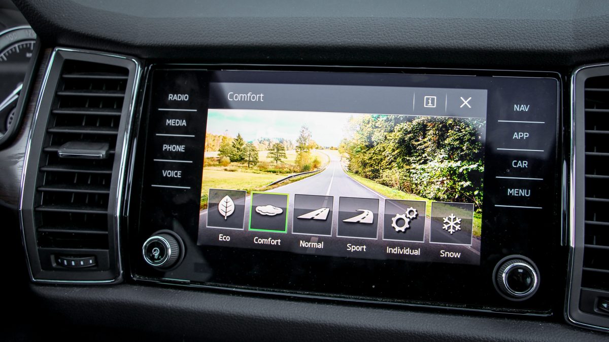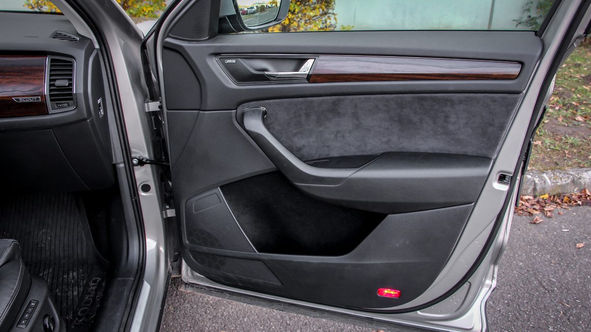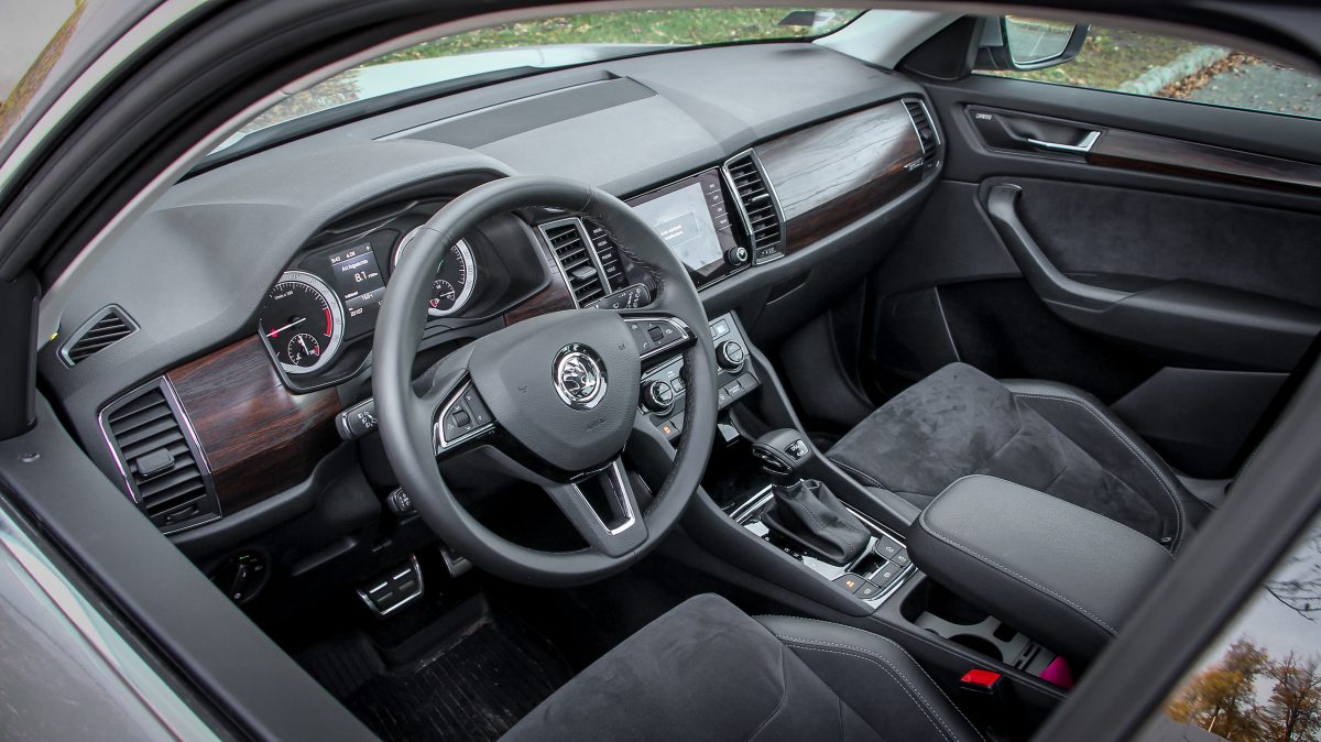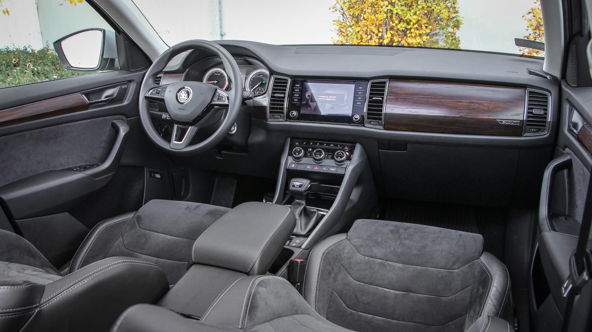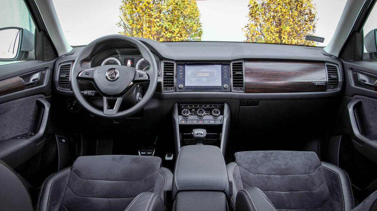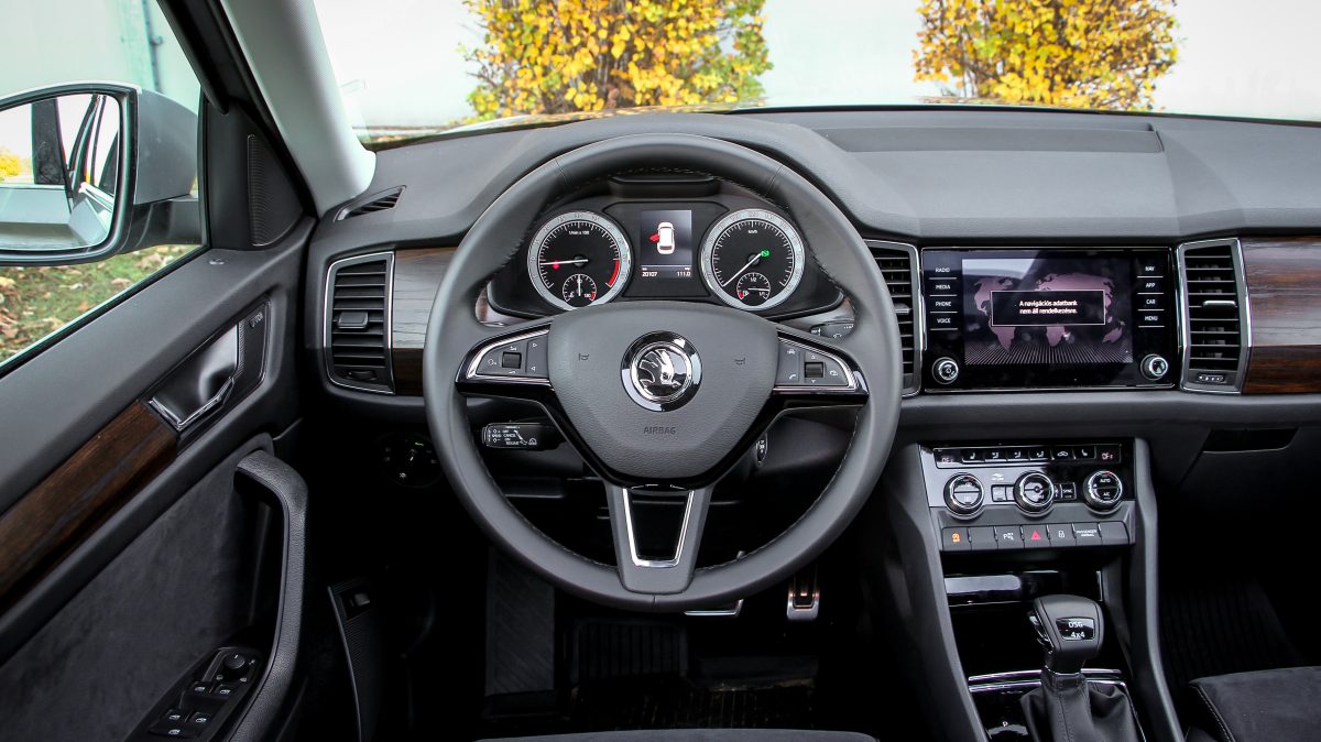 Ergonómiában mindig is jók voltak a Skodák, a Kodiaqnál viszont minden szokatlanul egy kicsit távolra került, könyökölni sem egyszerű. A kormány fogása és bőrözése nagyon kellemes, ahogy az ülések formázása is, az anyaghasználat már nem a legjobb, sok helyen egyszerű, de nem szokatlan anyagokkal találkozunk, lényegében csak a gumiszerű, kapaszkodókkal ellátott középkonzol jobb érzésre, mint egy Octaviában bármi, egyébként minden ugyanolyan. A 8 colos multimédia nem a legnagyobb, de már ez is üveglapos, és továbbra is az egyik leggyorsabb és legkönnyebben használható rendszer fut rajta éles grafikával. Ez is Android Auto és Apple CarPlay szolgáltatású, a 9,2 colos Columbus előnye, hogy online kapcsolatot is kaphat saját fedélzeti SIM kártyájáról. Elektromos a csomagtérnyitás, ami szintén gyorsan és csöndesen történik. Eldugható vonóhorog, padló alatti rekeszek és minimum 270 literes raktér is akad a fedélzeten, na meg persze a két esernyő az első ajtókban.