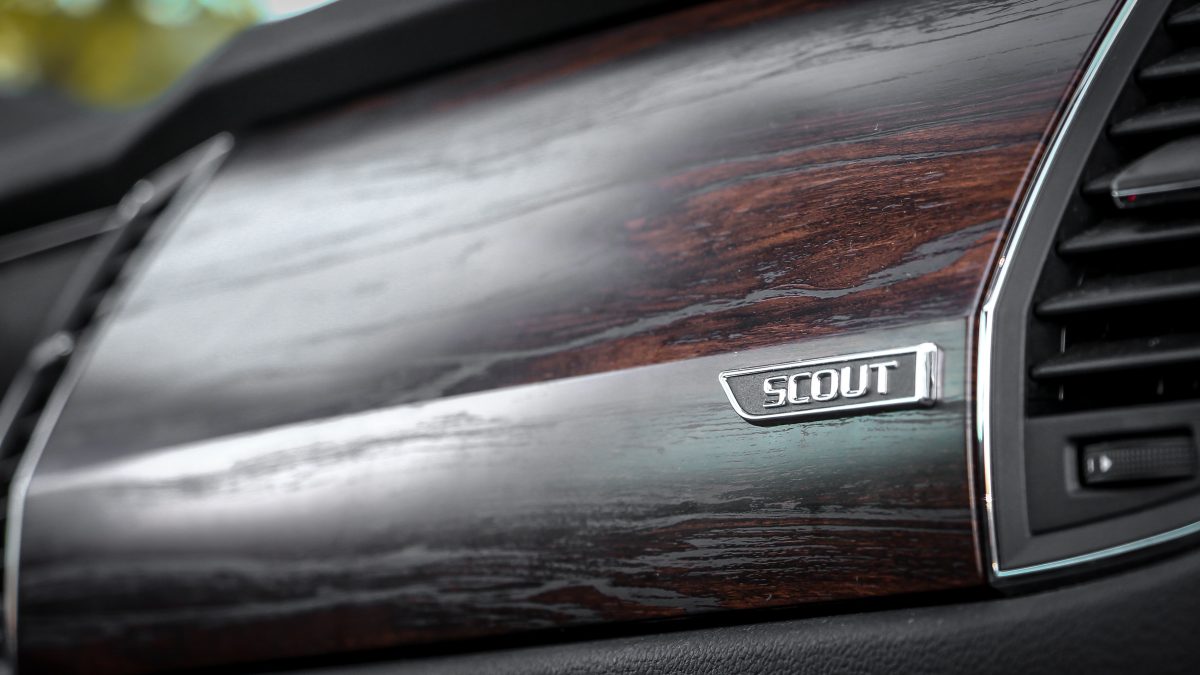 Az utastérben is megjelenik a Scout felirat, de a leglátványosabb, hogy fának álcázták a műanyagot, és ez jól áll neki, jobban, mint a fényes elemek