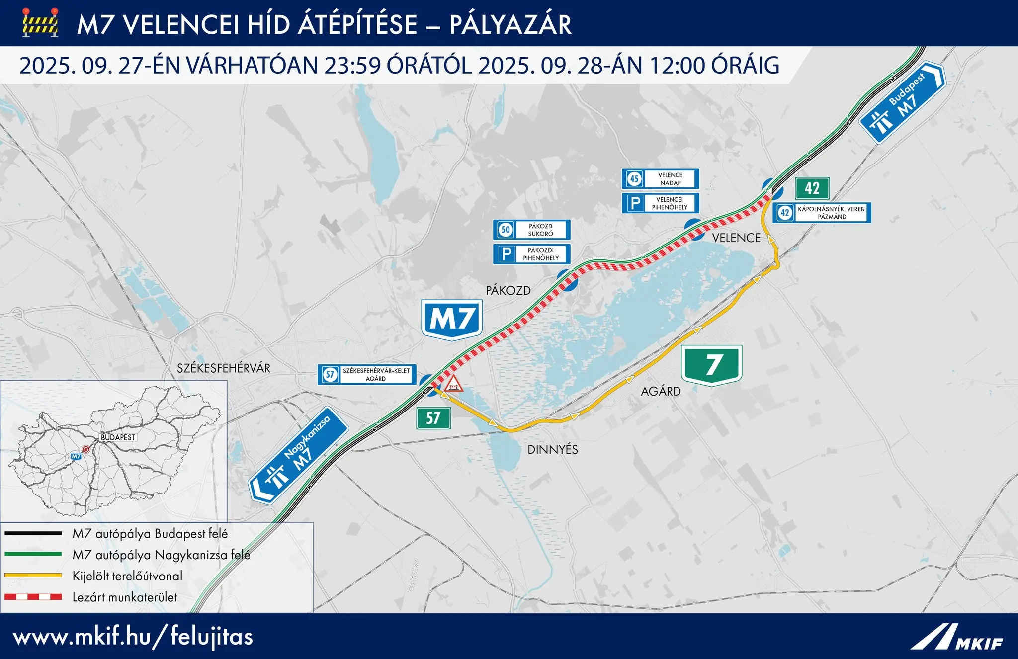 Újabb üteméhez érkezett az új gyalogos- és kerékpáros híd építése az M7-es autópályán Velencénél. Az előkészületet követően most a hídelemek beemelésével folytatódik a fejlesztés. A biztonságos munkavégzés érdekében 2025. 09. 27-én 23:59 és 09. 28. 12:00 között az MKIF Zrt. lezárja az M7-es autópálya Budapest felé vezető oldalát az 57-es (Agárdi) és a 42-es (Kápolnásnyék) csomópontok között. Azért ezt az idősávot választották, mert ezen az éjszakán kamionstop lesz érvényben, így nem terelik át a kamionokat a lakott területekre, illetve mert a forgalmi adatok alapján ez a legkevésbé terhelt időszak a pálya ezen szakaszán.