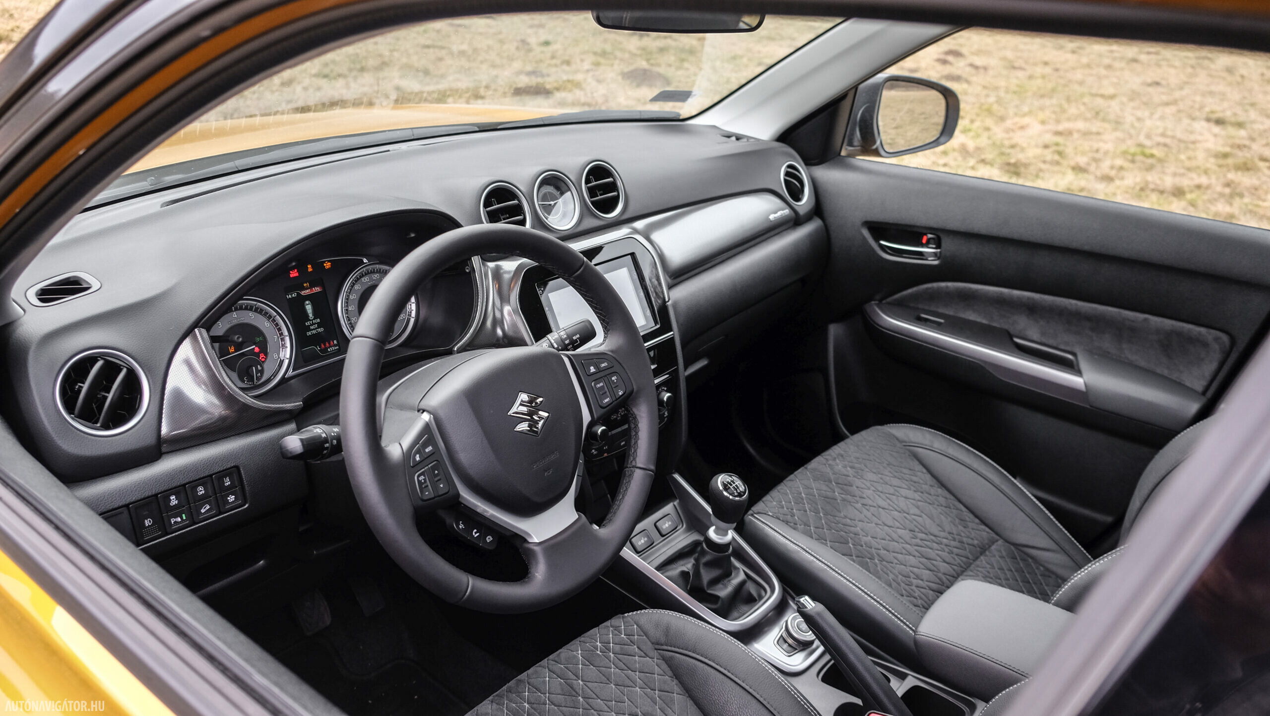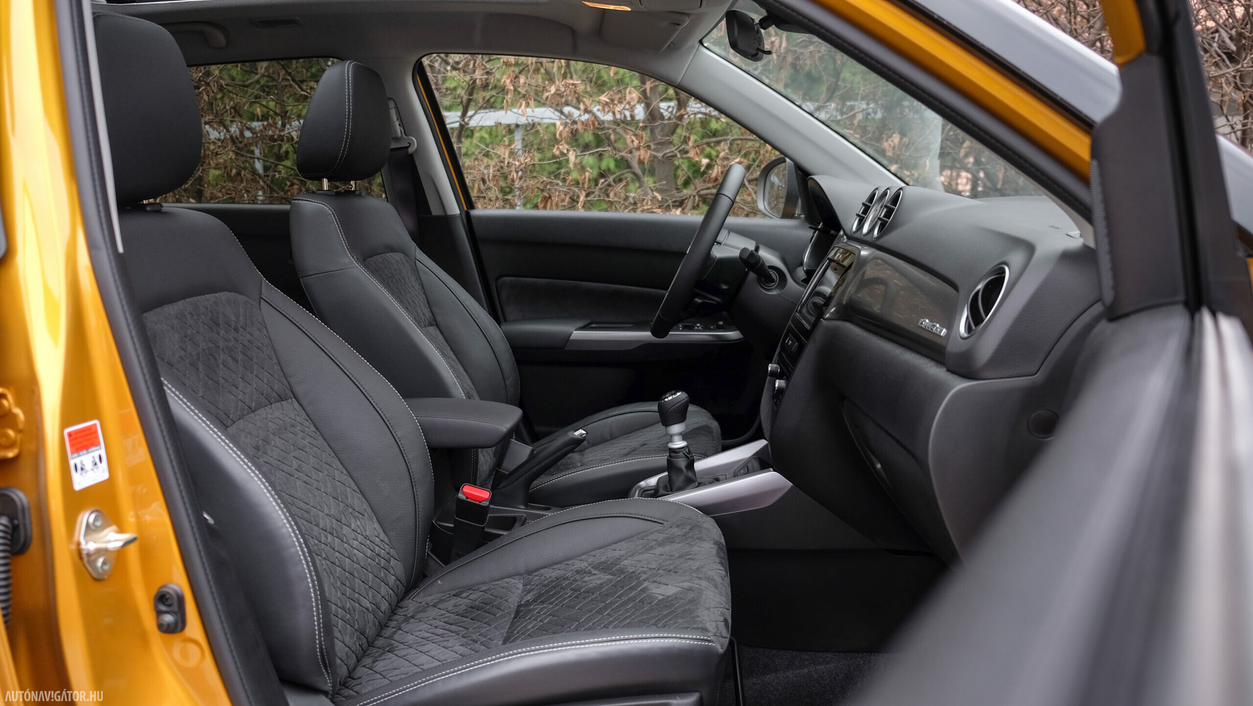 Magas az üléspozíció, az Alcantara szerű kárpit jó hangulatot kölcsönöz a Vitarának