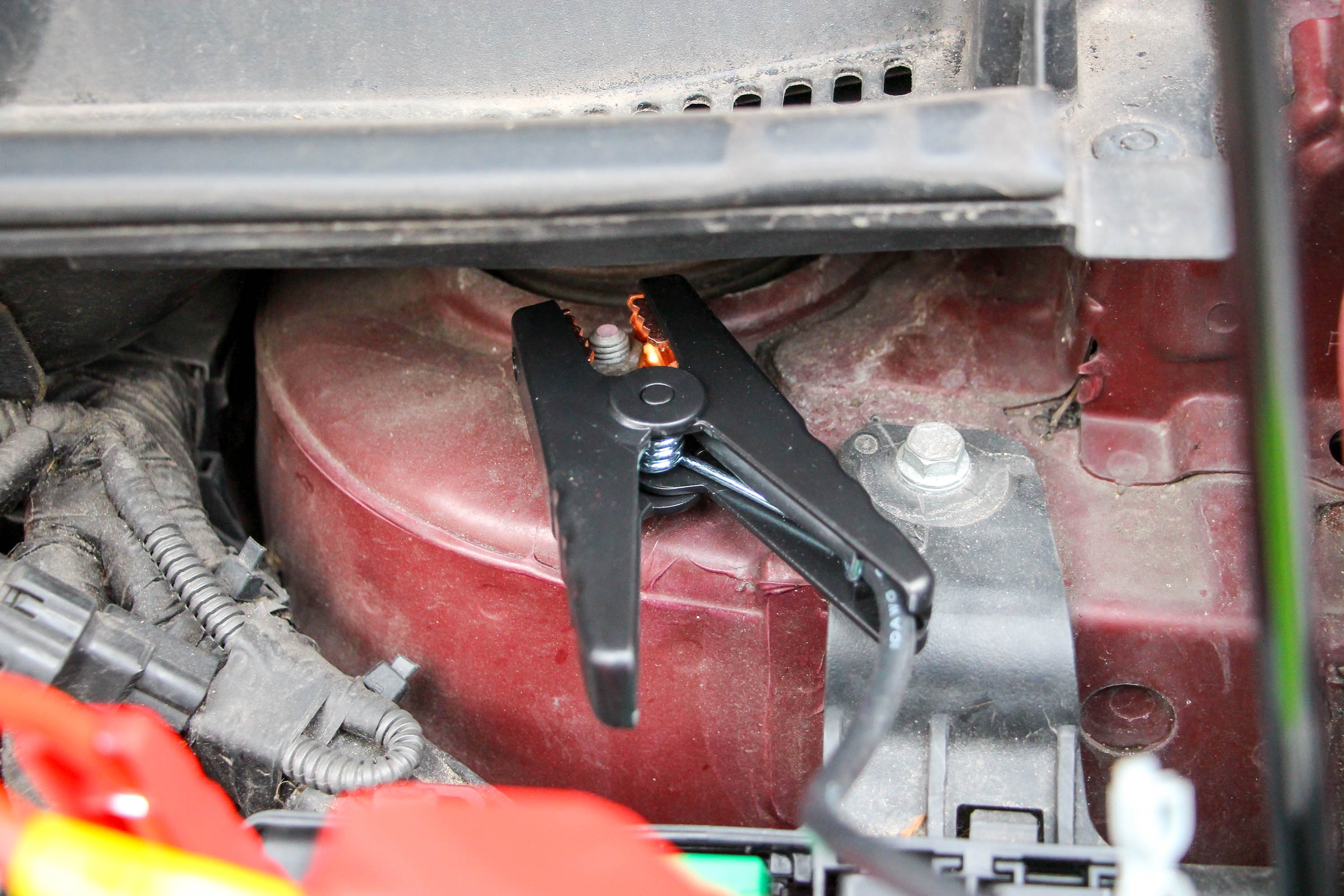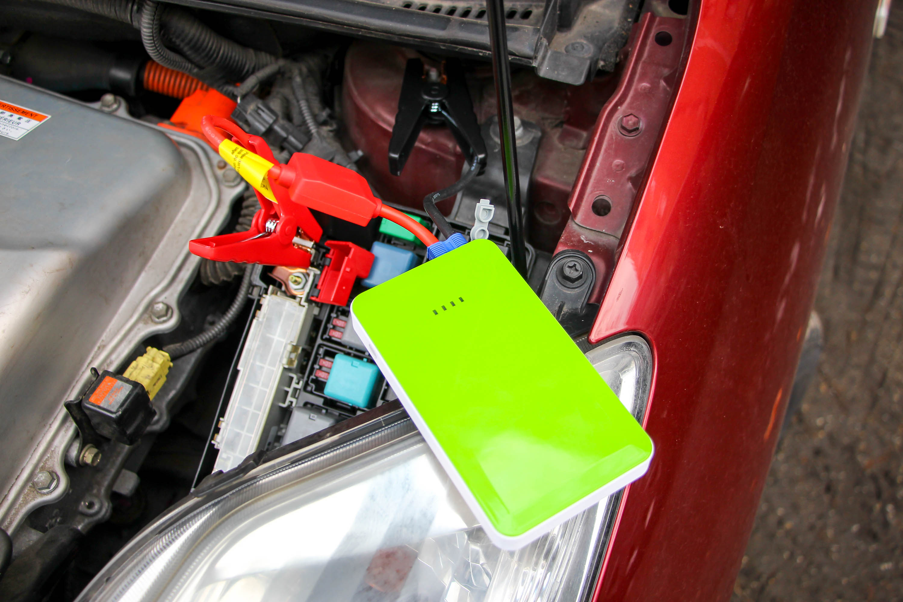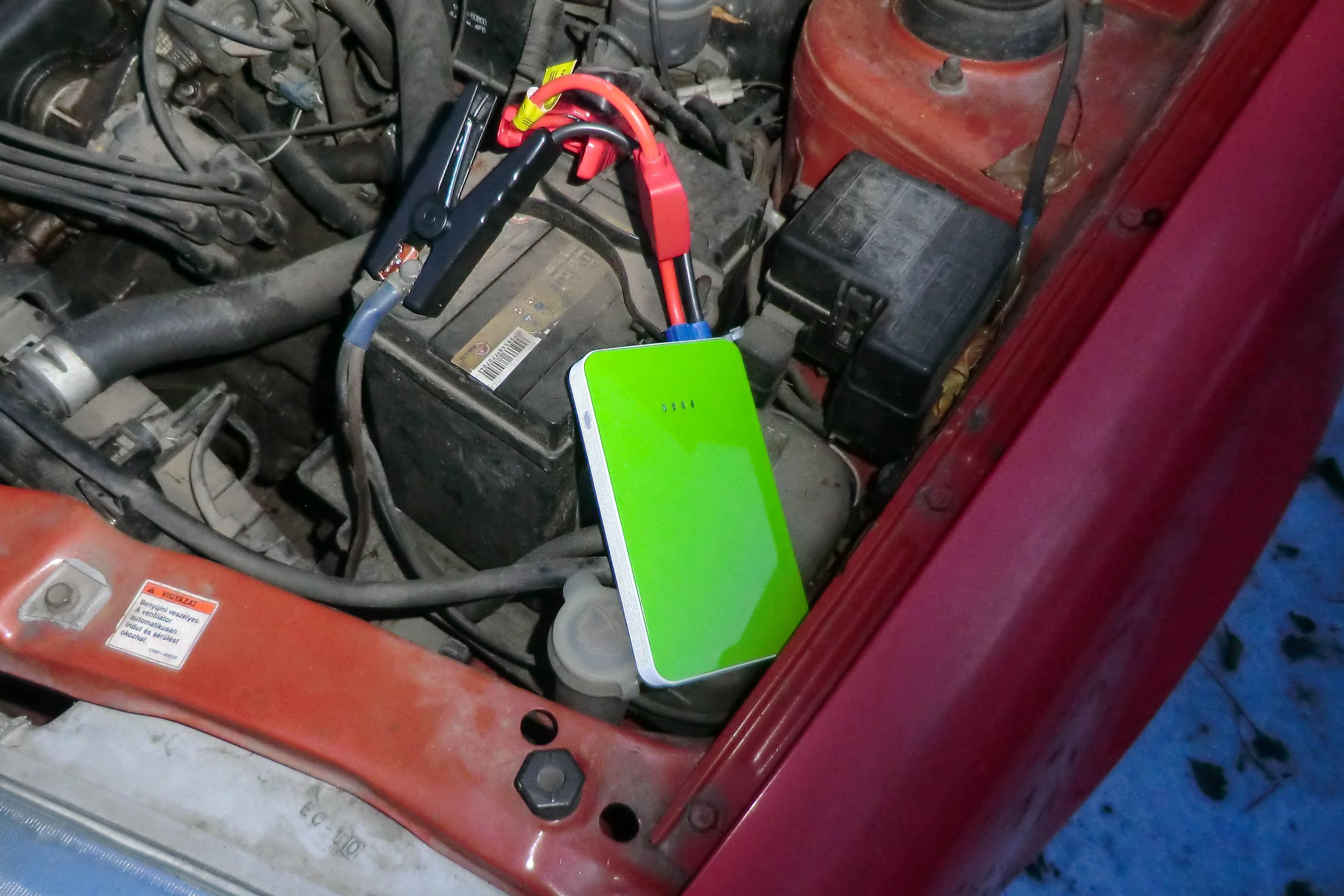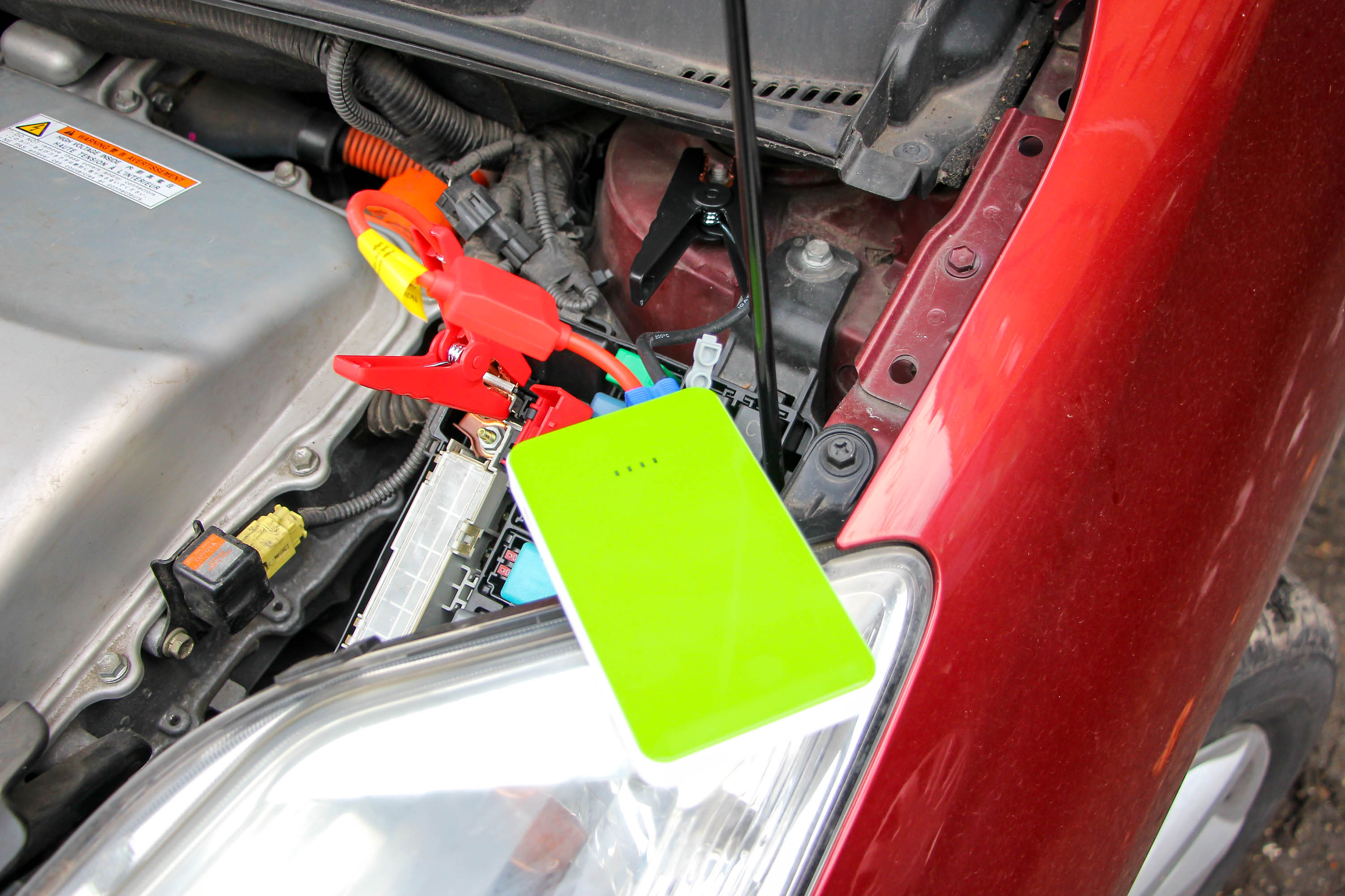 Az indítássegítő egyik előnye, hogy szűk helyen is használható, de nem is kell hozzá másik autó. Itt épp egy Toyota Prius bika- és testpontjára kötve látható, de hagyományos akkumulátorú (és akku elhelyezésű) autónál piros csatlakozóját a pozitív, feketéjét a negatív pólusára közvetlenül is köthetjük. Ha esetleg elrontanánk a sorrendet, az autót nem fogja tönkretenni, van benne egy biztosíték
