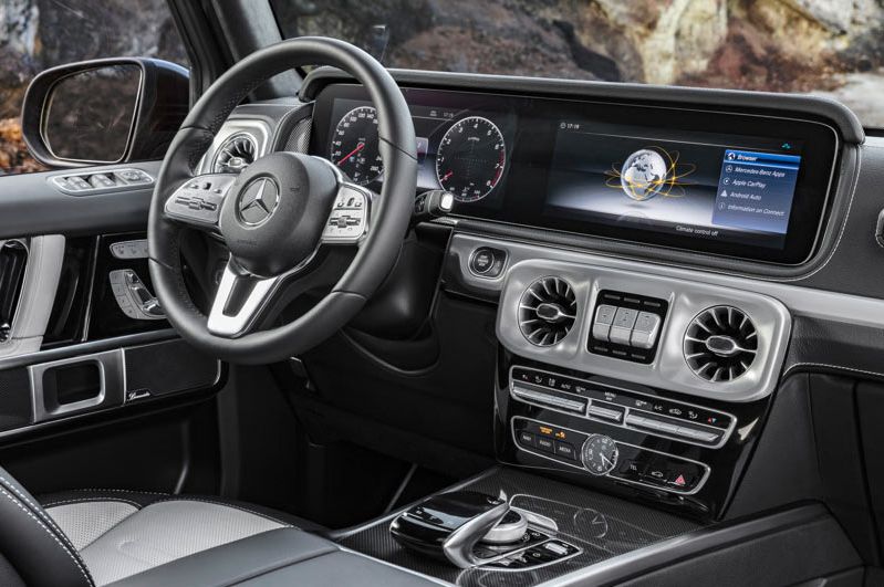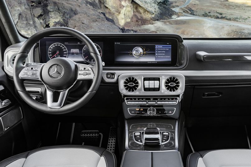 Nincs kivétel. A G-osztály mindig is különc volt. Egy igazi, komoly terepjáró a Mercedes-Benz palettáján, szemben a városi divat SUV-okkal. Sok tekintetben nyersebb volt, mint a többi modell, a belsőt viszont mostanra utolérte a mai trend. Ahogy már az E-osztályban megszokhattuk és a leendő A-osztályban láthattuk, itt is megjelenik a két nagyméretű "tabletből" álló műszerfal. A jövőre érkező újgenerációs G-osztályból egyelőre csak a belsőt láthatjuk, ami igen tetszetősre sikerült.