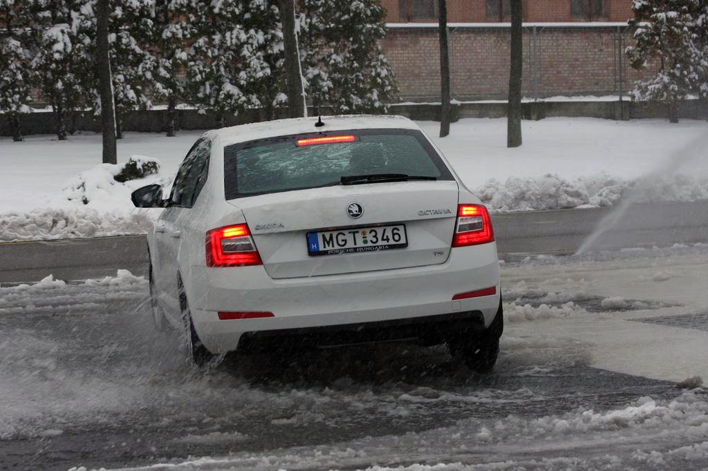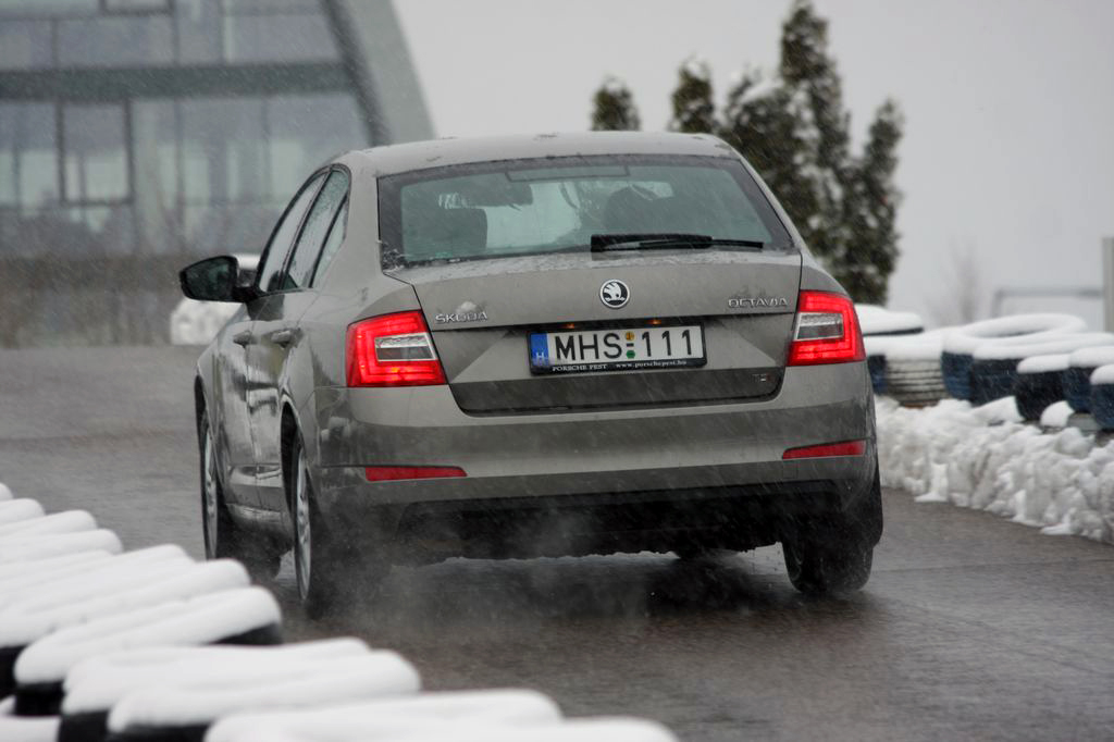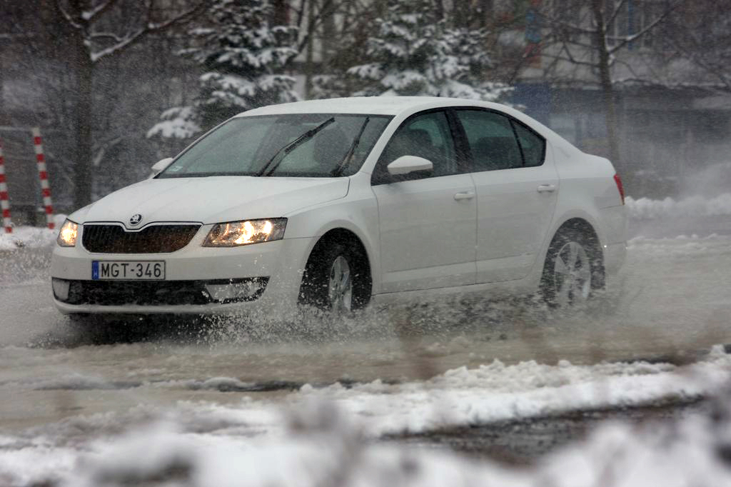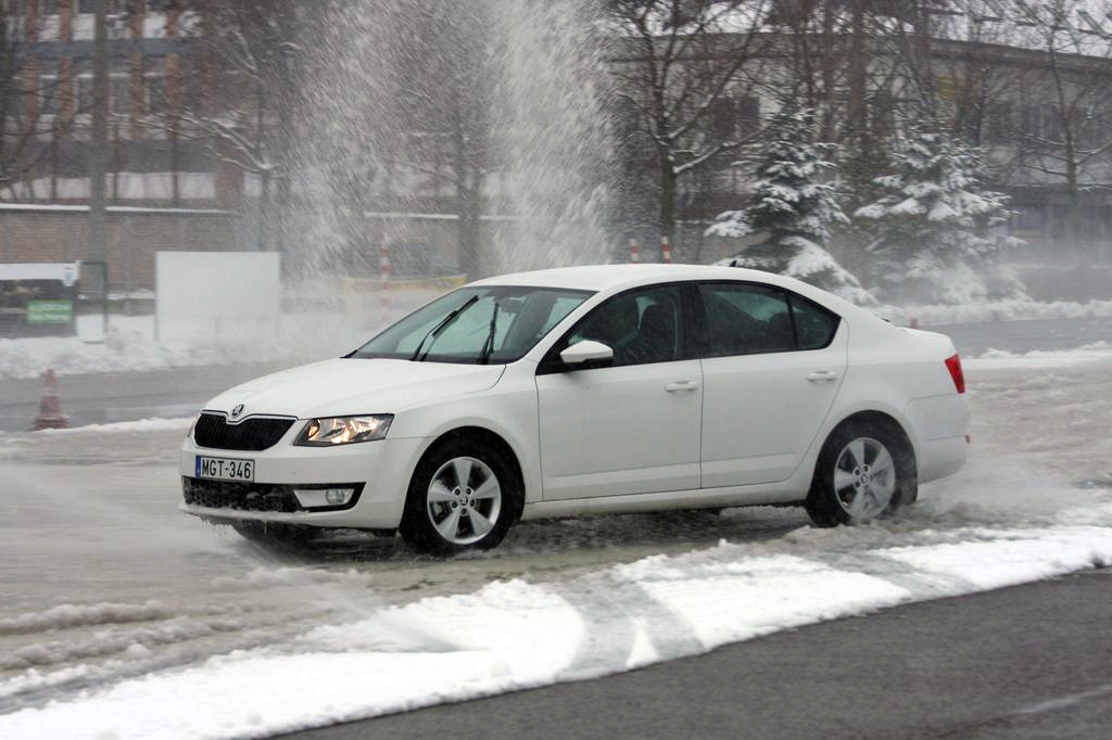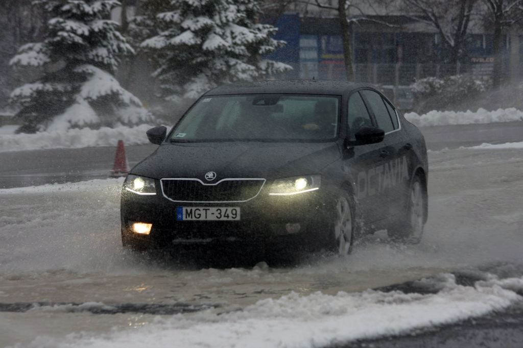 Hóban, csúszós úton, vízfalak között és rántópadon az Octaviával