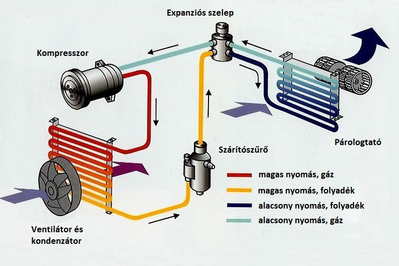De miben is áll a varázslat, azaz hogyan működik a légkondicionáló? Egy zárt rendszerű keringési folyamatot képzeljünk el, amely nyomás- és halmazállapot-változására, valamint ezzel járó hőmérséklet változásra épül. A kör onnan indul, hogy kompresszor sűríti össze az ún. hűtőközeget – ez 1998-tól jellemzően az R134a jelű, az ózonréteget nem pusztító anyag, amely felváltotta a korábban használt freont. E sűrítés miatt megnő a nyomás és a hőmérséklet, a hűtőközeg így jut a kondenzátorba (köznyelven: klímahűtő), ahol cseppfolyós halmazállapotba kerül. A hőmérsékletet a motor hűtésében is tevékeny szerepet játszó ventilátor valamelyest csökkenti, majd ezt követően egy speciális szűrő, a szárítószűrő a következő állomás, ahol megkötik a nedvességet, és az esetleges szilárd szennyeződéseket. A legfontosabb lépés, hogy a hűtőközeg hidegebb legyen az utastér hőmérsékleténél, amit hirtelen nyomáscsökkenéssel, az ún. expanziós szeleppel lehet elérni. Végezetül az utolsó lépcsőfok a párologtatás - ennek folyamán keletkezik kis tócsa az autó alatt -, az utastér szellőztető rendszerén keresztül a hűtőközeg voltaképpen felveszi a kabinban uralkodó magasabb hőmérsékletet, kvázi így csökkentve a hőséget, amit az utasok éreznek. Innen a körfolyamat újra indul: sűrítés, hőmérséklet- és nyomásnövekedés, ventilátoros hűtés, szárítás, nyomáscsökkenés, párologtatás.