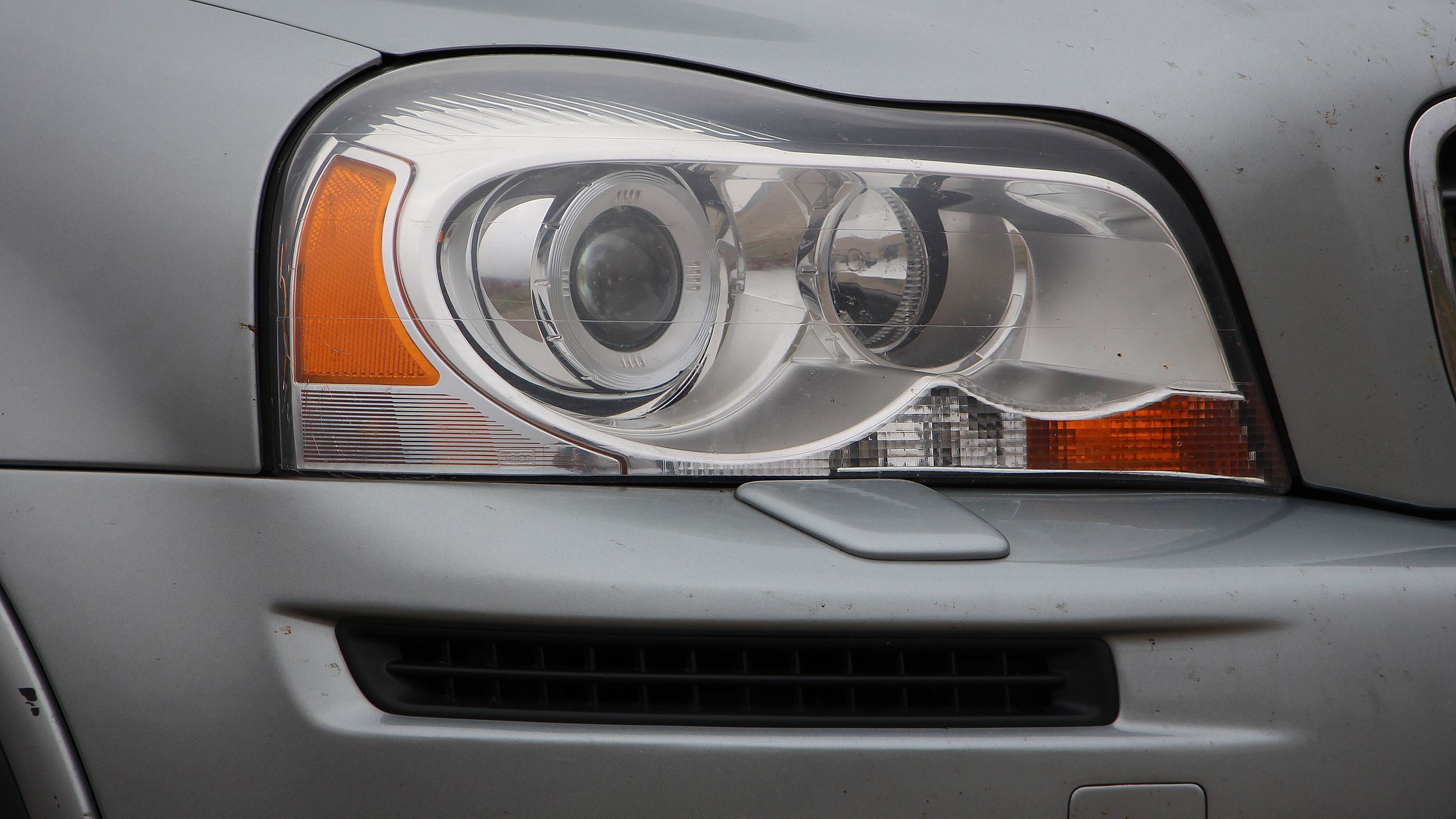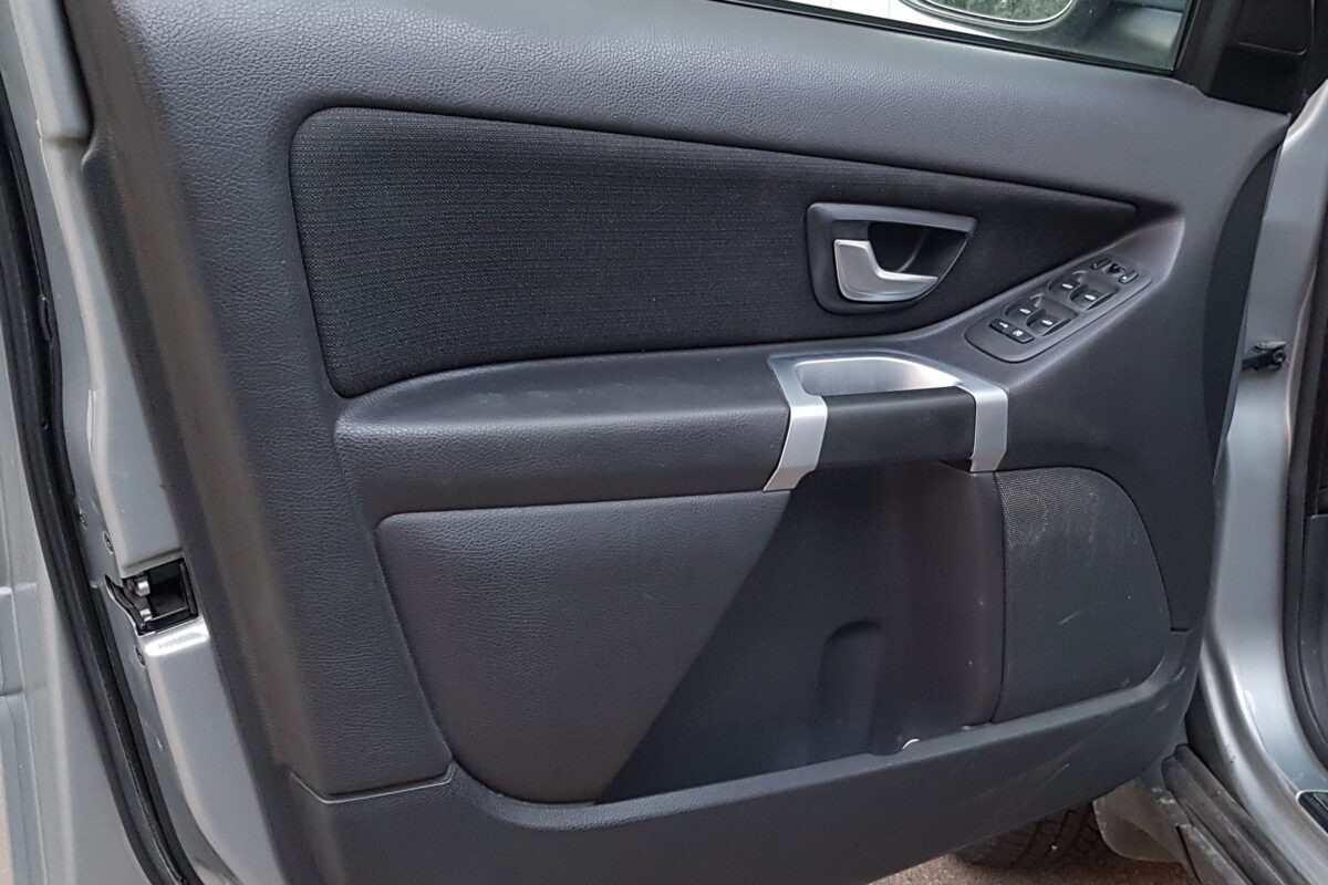 Szóval az aktuális használtteszt főszereplője egy 2011-es évjáratú Volvo XC90, amelynek a hátsóján a D5 és az AWD felirat is ott szerepel. Ezek árulkodnak a motorizáltságról és a hajtásmódról, viszont mielőtt ezekre rátérek, nézzük az autó állapotát simán csak a szemünkkel. Sérülések? Rozsda? Ha nem is nagyítóval, de azért árgus szemekkel jártam körbe az autót, ugyanis a tulaj állítása szerint hibátlan. Kerestem a rozsdát a küszöböknél, a sárvédőíveken, de tényleg sehol nincs. Sérülésnek sem találtam nyomát, egyedül az első lökhárítón látni csak kavicsfelverődés okozta kis szeplőket, de ezek már tényleg a nagyítóval észrevehető hibák. Az ezüst fényezés pedig tényleg egészen jól palástolja az autóra rakódott szennyeződést, ugyanis a fotózás előtt csak egy gyors zuhanyra volt idő, alapos tisztogatásra nem. Persze az állagmegóvásra innentől kell majd még jobban figyelni, ahogy öregszik az autó. SUV-hoz méltóan fényezetlen műanyag elemekkel szegélyezték körbe az autót, de még ezek sincsenek összekarcolódva, pedig a jelenlegi gazdája földutakon is használja, amit örömmel hallottam, hiszen valóban a funkciójának megfelelően „él” tehát az autó. Egyetlen szépséghibát találtam csak, ami nem vészes, könnyen orvosolható, ez pedig a bal első fényszóró búrája, ami bár még csak halványan, de mattulásnak indult.