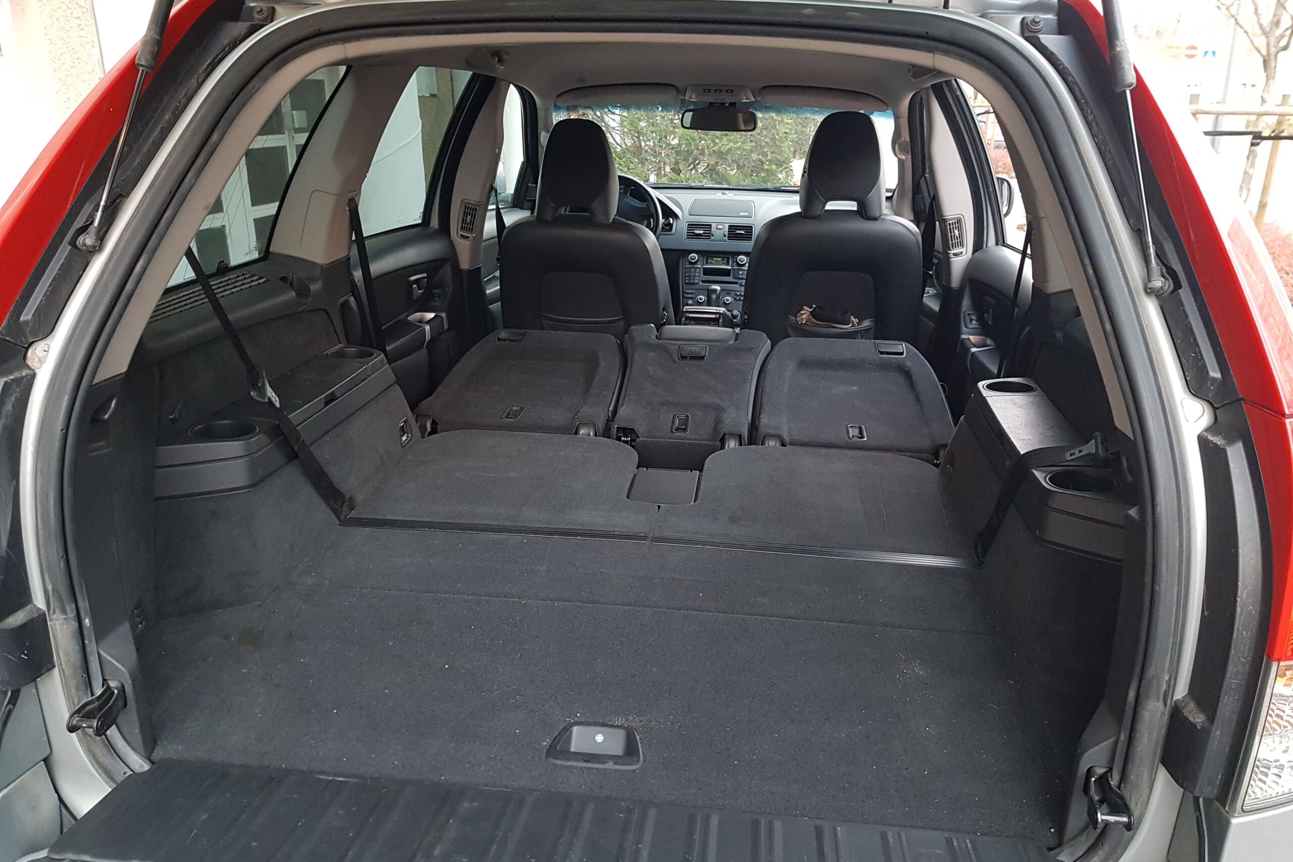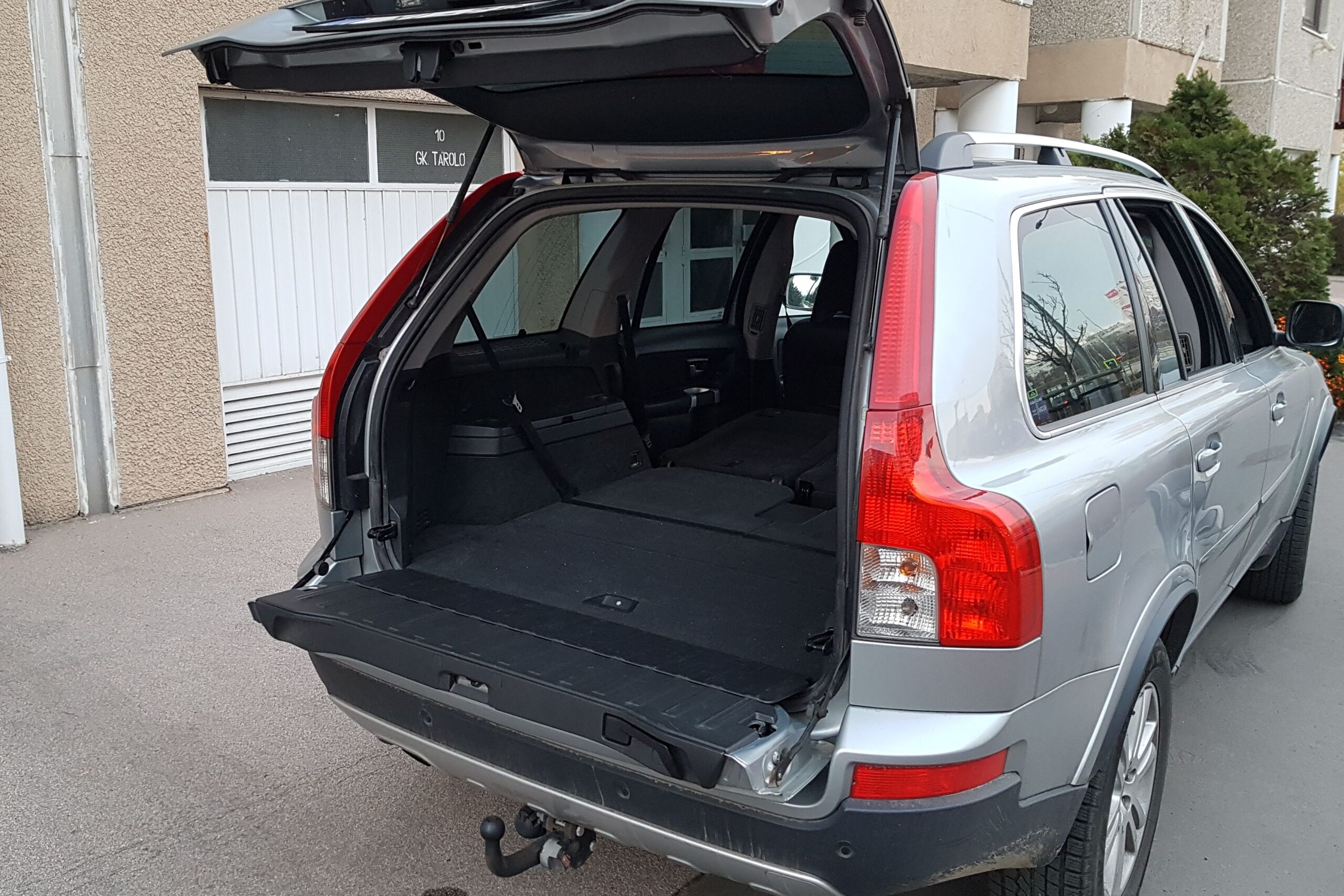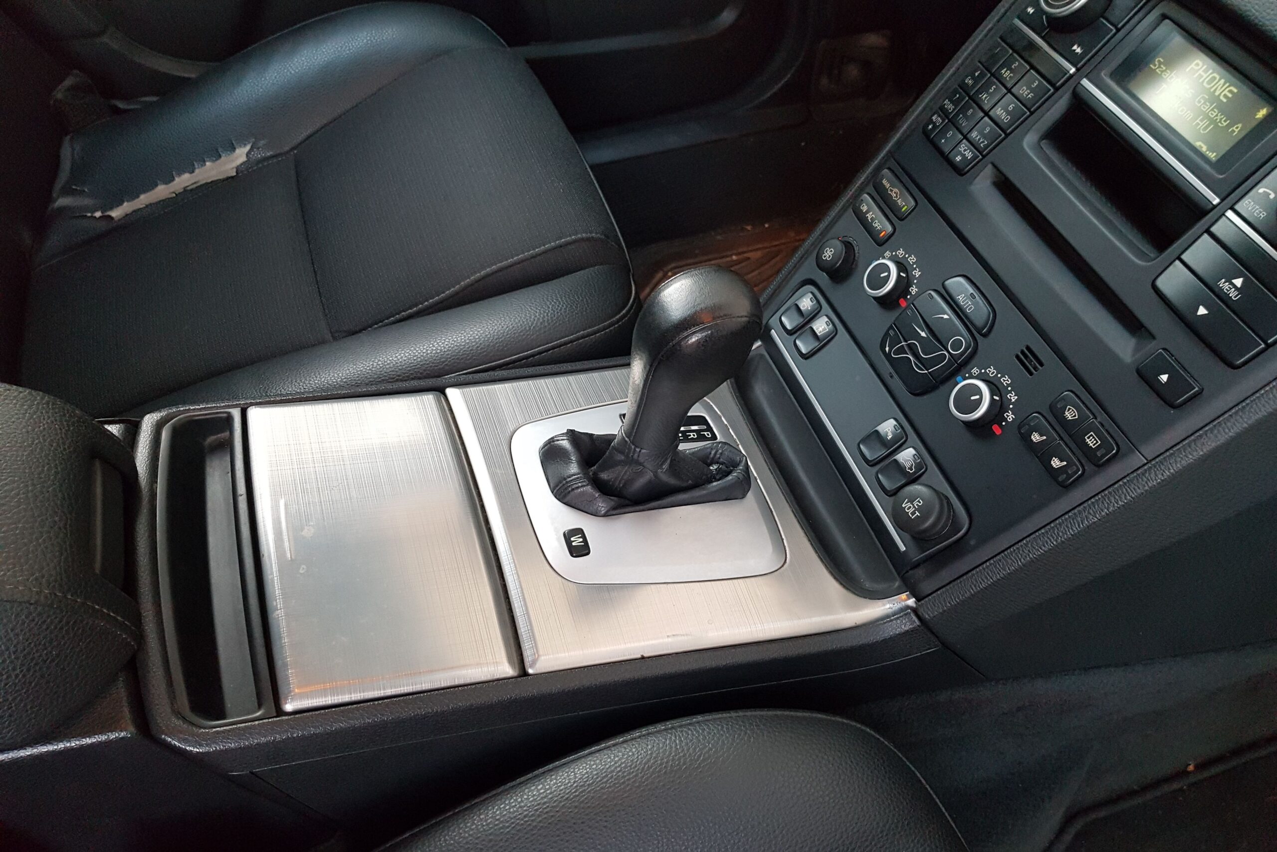 Bizony, az XC90 hétüléses is lehet, a hátsó üléseket egy karral lehet eltüntetni, vagy felállítani. Amikor a hátsó üléseket is használják, akkor 249 literes a csomagtér, de egészen 1837 literesre bővíthető. Magyarán jó nagy. Ebben az autóban használják is rendesen, cipekednek (vontatnak is) vele, de még a csomagtérben is szép állapotú a kárpit. Viszont a hátsó ajtó alsó részén így elkerülhetetlenül megjelent néhány karc. Remélem sokan felkapták a fejüket a hátsó ajtó oszthatóságán. Igen, mint egy pickuposan, lehajtható része is van, ötletes megoldás, mondom az XC90 egy praktikus autó. Visszatérve még kicsit előre, a bőrkárpit silányságán kívül azért sok szó nem érheti a ház elejét. Bár kifényesedett a kormány karimája is, illetve az automata sebességváltó karja, azért összességében elfogadható egy 10 éves autótól ennyi kopás, ráadásul minden gomb, minden funkció működik. Persze ez egy alapfelszereltségű változat, így nem is pakolták tele olyan extrákkal, amik potenciális hibaforrásokká válnak az évek múltával.