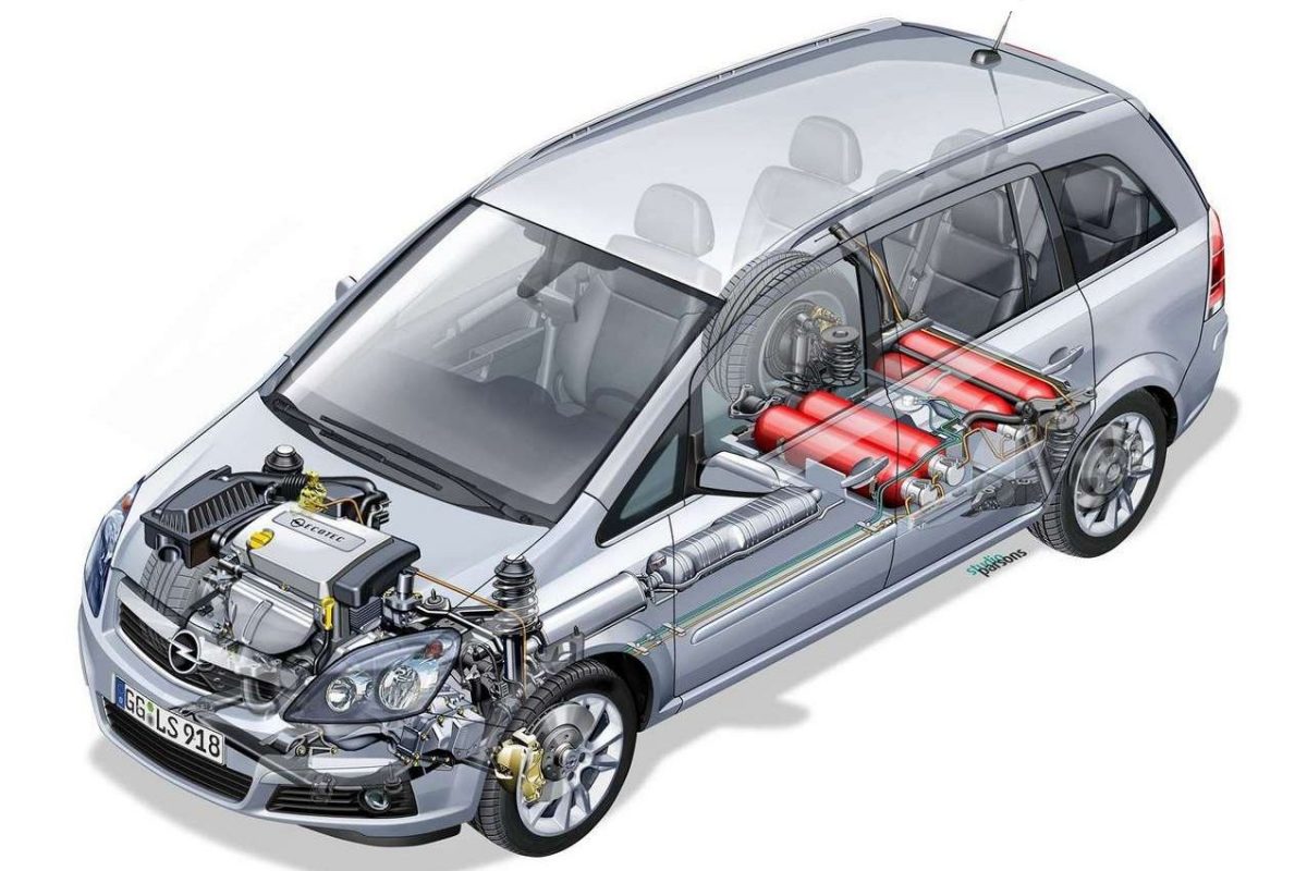 Csak hengeres acéltartályban tárolható a nagynyomású földgáz. A Zafira gyárilag négy tartállyal rendelkezik, és a palackok nem vesznek el számottevő helyet az utastérből