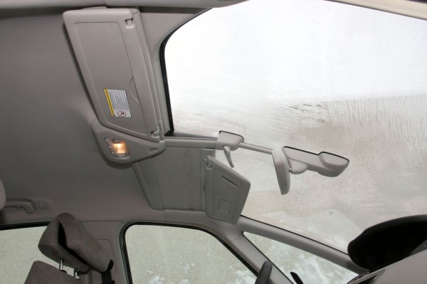 Szemből különösen furcsa látvány a tetőbe belógó szélvédő. Középen az esőérzékelő szenzor látható