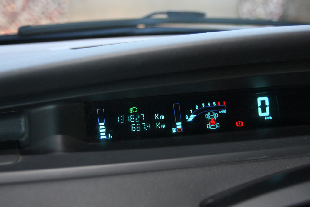 És milyen belül? Biztos ütött-kopott, lógós-nyúlós, zörgős-málós, nem? Nem. Erős kopást két helyen mutat, a vezetőülés bőrözött, kicsit ki is szakadt oldalán és a váltógombnál, közben a kormány és a pedálok kor- és futáshűek. Hétéves autó normális, családi használatban, apát-anyát-két gyereket sok országba vitt már el nem kevés csomagostul, biciklistül, sílécestül - ügyes szakemberek, furfangos kereskedők el tudják tüntetni az idő nyomát, ez viszont életszerű, őszinte állapot.