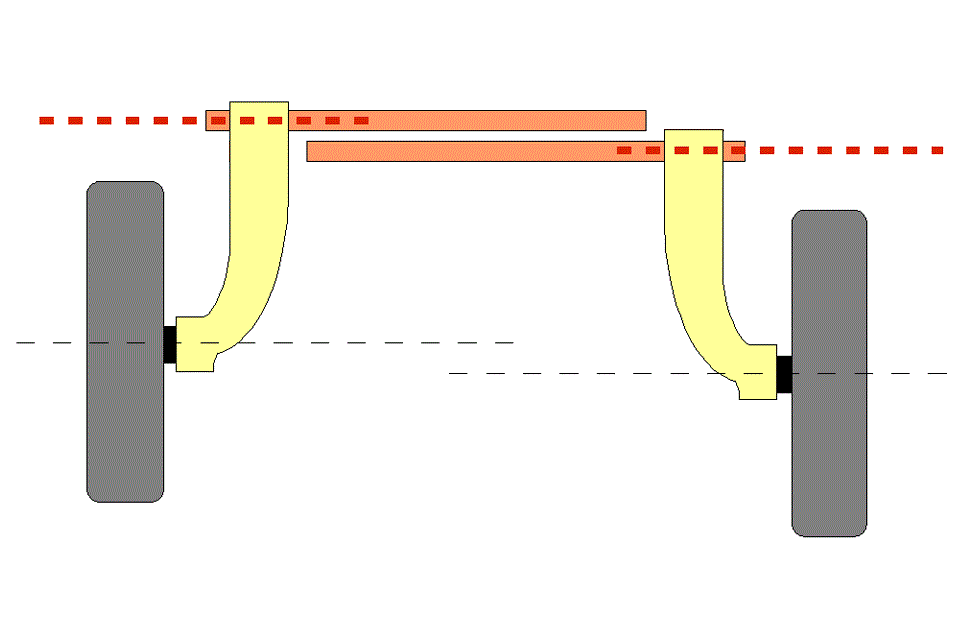Pirossal a torziós rugók, sárgával a lengőkarok jelölve. A tengelyek nem futottak egy vonalban