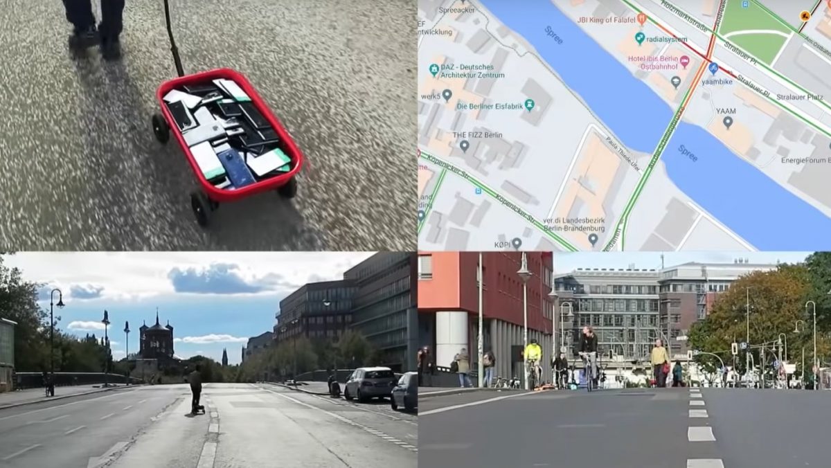 Nem sok „ellenfele” akadt a hekkelő telefonjainak, mivel alig volt autós Berlin utcáin, így szinte csak a kézikocsiban utazó készülékekre hagyatkozhatott a Google (Forrás: Simon Weckert/ Youtube)