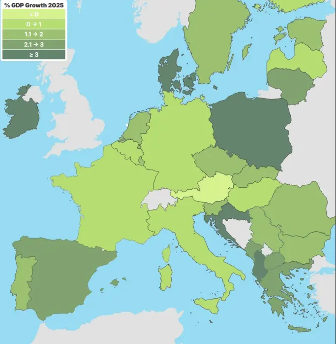A 2025-ös év első felére a nehézkes tervezhetőség volt jellemző. Bár az orosz-ukrán háború hatásait az elmúlt években már megtapasztalták az európai gazdaságok, az év elején bejelentett amerikai büntetővámok, illetve az EU által a kínai autógyártókkal szemben bevezetett védelmi vámok közvetlen és közvetett hatásai miatt csökkent az ipari termelés, illetve a kiskereskedelmi forgalom volumene. A fenti tényezők összessége visszafogta a GDP növekedését: az első negyedévben az Eurostat szerint az Európai Unió átlagosan 1,5%-os GDP-növekedést mutatott, ez azonban meglehetősen egyenlőtlenül oszlott el a tagállamok között. Ezzel összehasonlítva, a közép-kelet-európai (CEE) régió átlagosan 1,8%-os növekedéssel teljesítette túl az uniós átlagot.