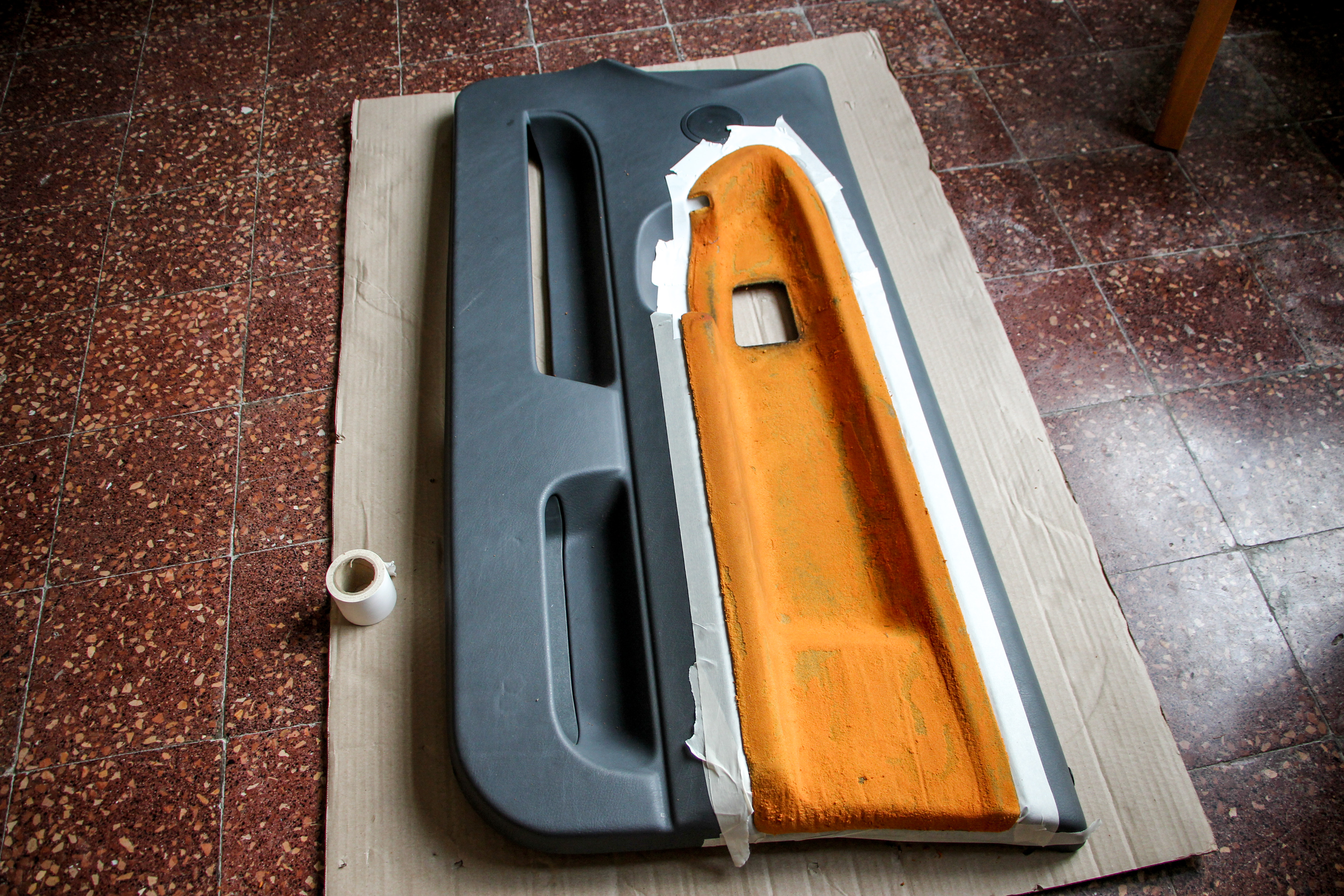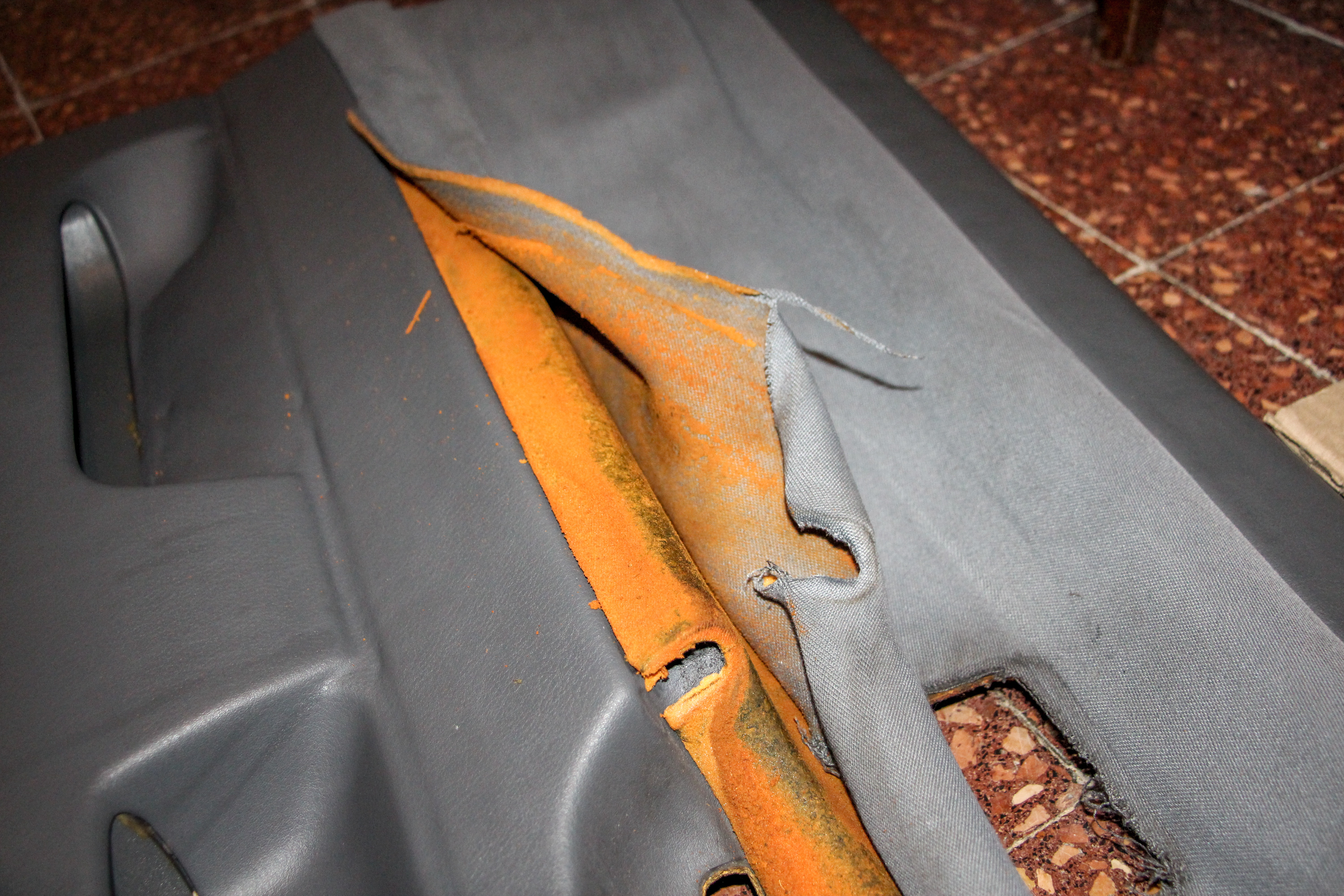 Egy ponton sajnos nálam megtörtént, de nem zavaró, annyira. Ezután hagyjuk pihenni, 10-15 perc elég, de fontos, hogy szobahőmérsékleten csináljuk. Ezután olyan lesz a két felület, mint a ragasztószalag, ha a kettőt összeragasztod, nem szeded szét többet. Menjünk biztosra a felragasztásnál, mert ha felhúzzuk, a szivacsot tépjük fel, igazításra nincs lehetőség ilyen idős anyagnál. Simítsuk ki az anyagot, a kritikus részeken először, hogy szépen felfeszüljön. A hátsó fele gyárilag kicsit hullámos, ezt nem lehet reprodukálni, úgyhogy inkább kisimítottam ott is.Letakarítottam a kapaszkodót és az ajtóborítást is, a bal ajtóban pedig kicseréltem az ablak csúszkáit, sajnos a hiba nem szűnt meg