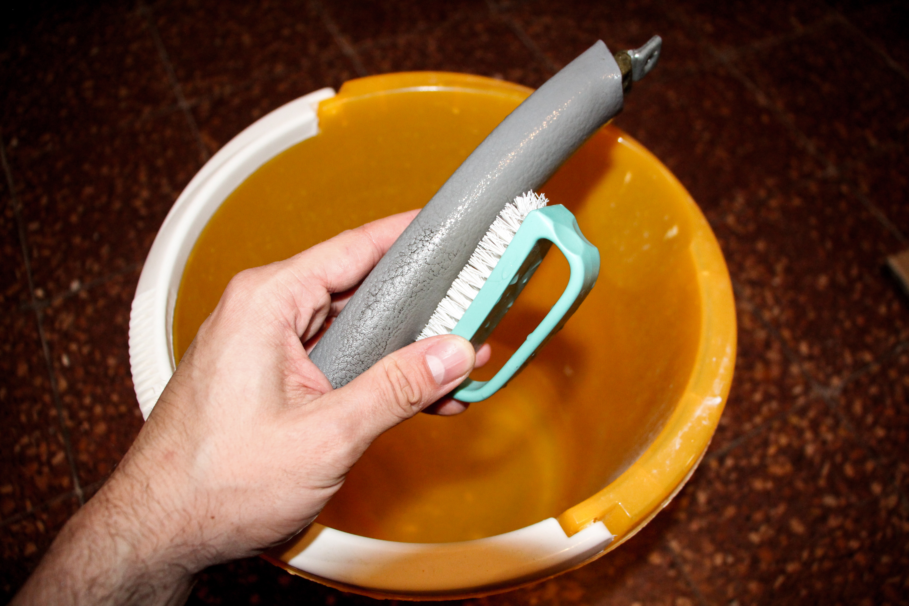Amíg száradt a szövet, kicsit takarítgattam, mert nem csak az anyag, hanem az ajtó és a kapaszkodó is rendkívül mocskos volt. Citromos víz és körömkefe, tesztelt módszer, nem bántja a műanyagot és nem lesz kellemetlen tisztítószer szaga. Maszkoljuk körbe a szövet helyét, hogy a ragasztóból ne menjen a műanyagra.