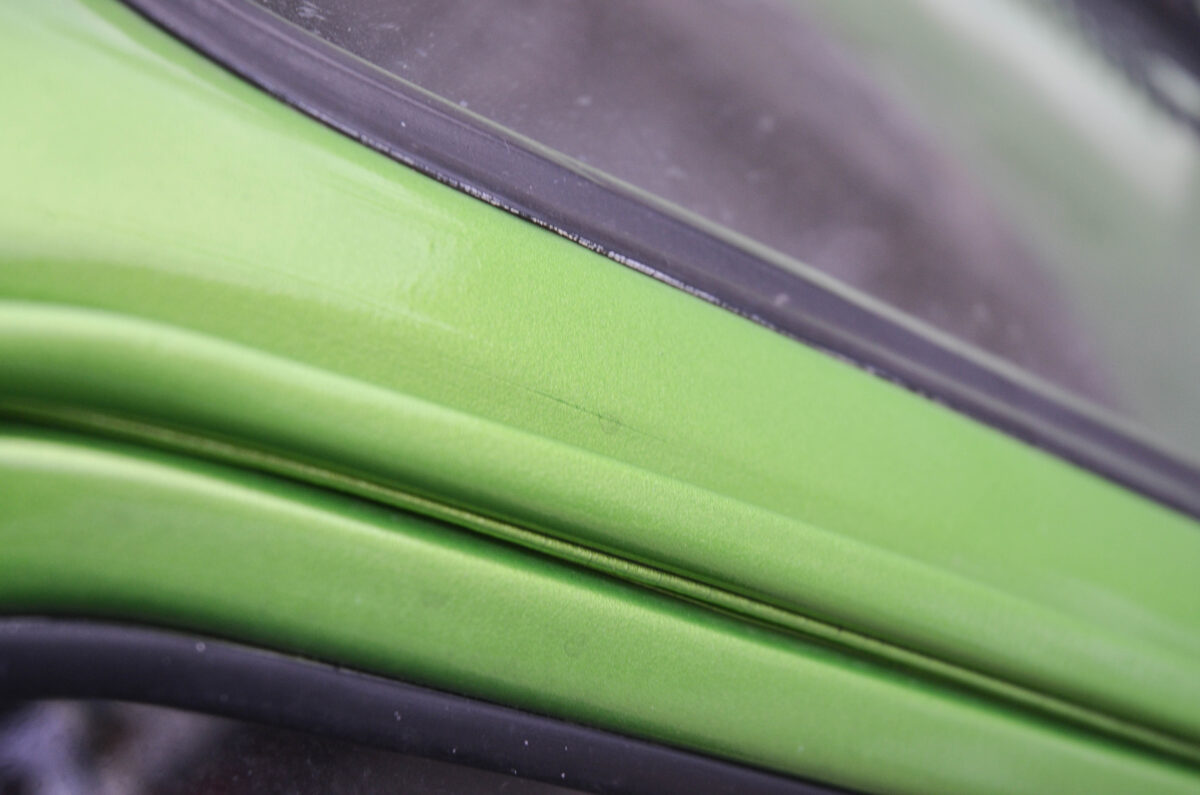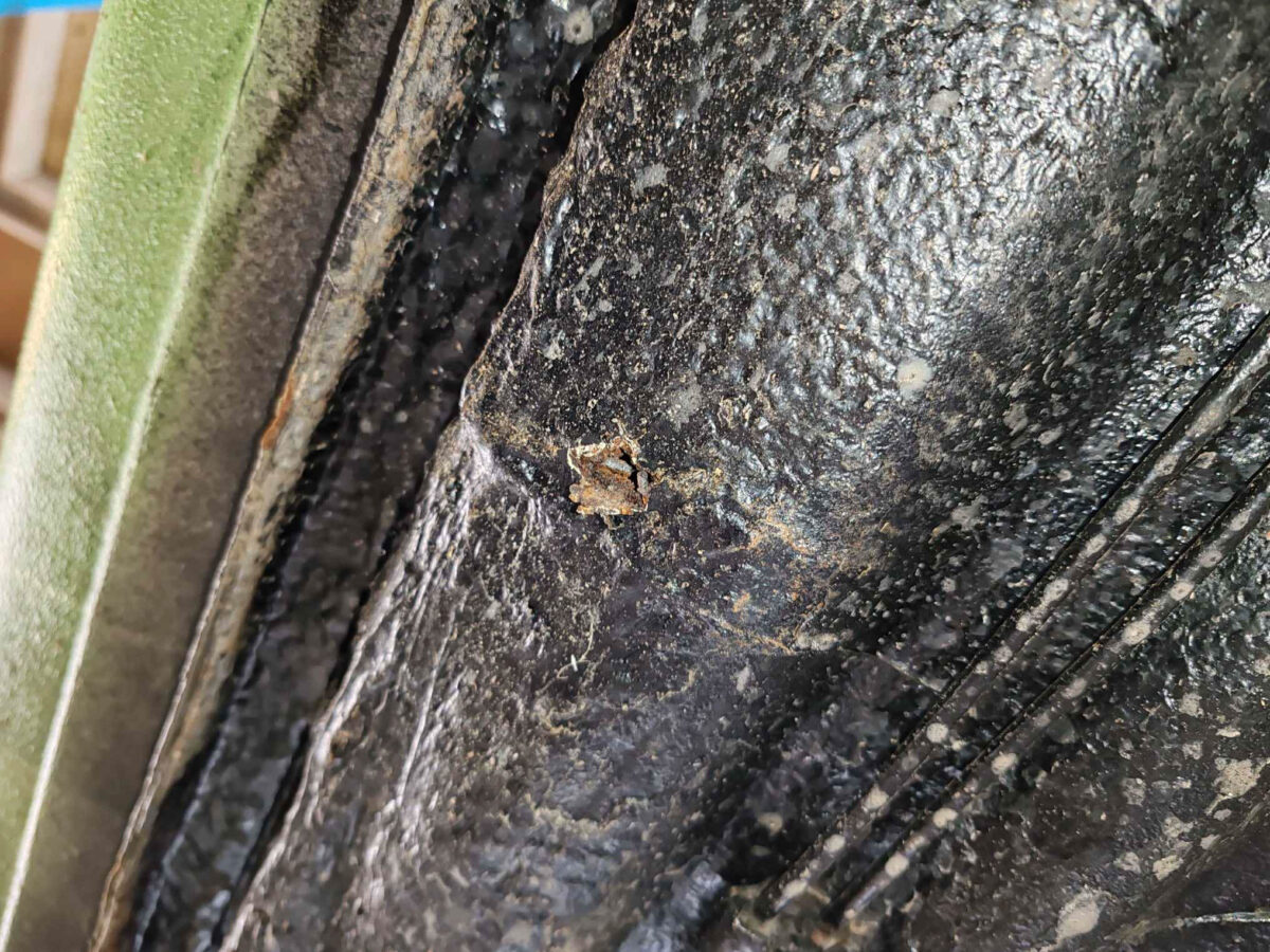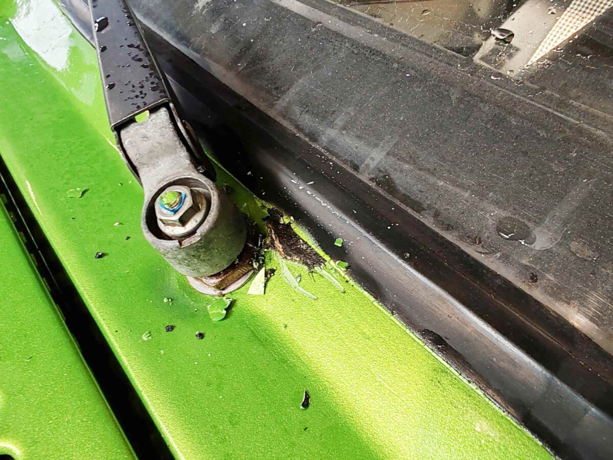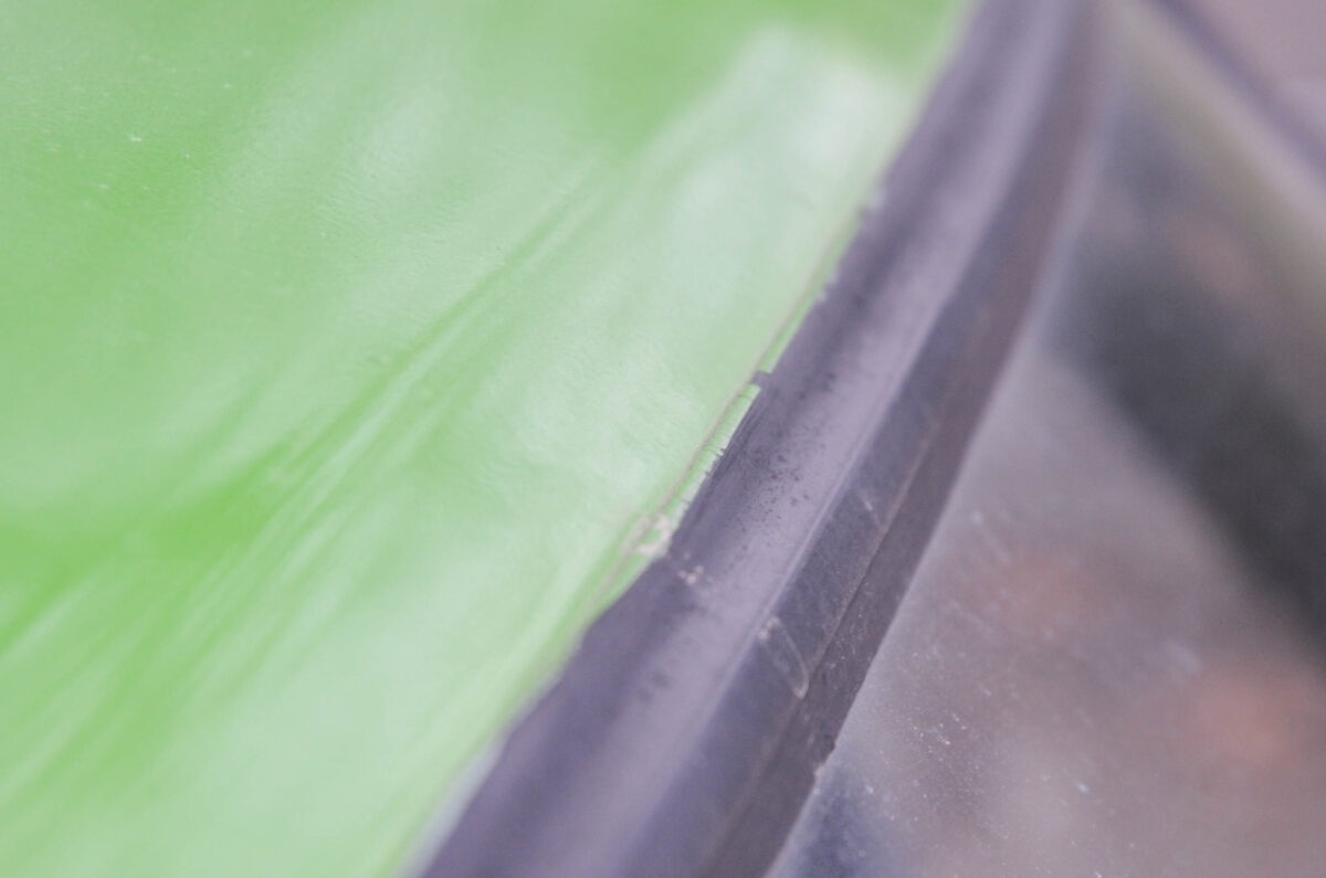 Érdekes, hogy a szélvédőkeret rozsdásodásának "javítása" közben valahogy zöld festék került a gumikéderre is