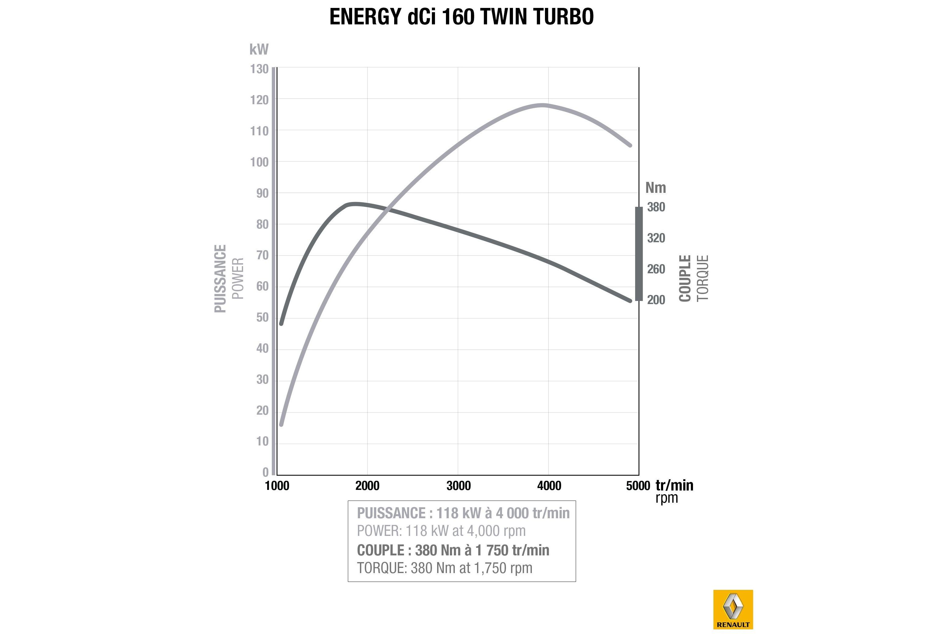 Kereken 100 lóerős literteljesítményt jelentő 160 lóereje mellett az 1.6 dCi Twin Turbo 380 Nm nyomatékot tud, 90 százalékát már 1500-as percenkénti fordulaton leadja